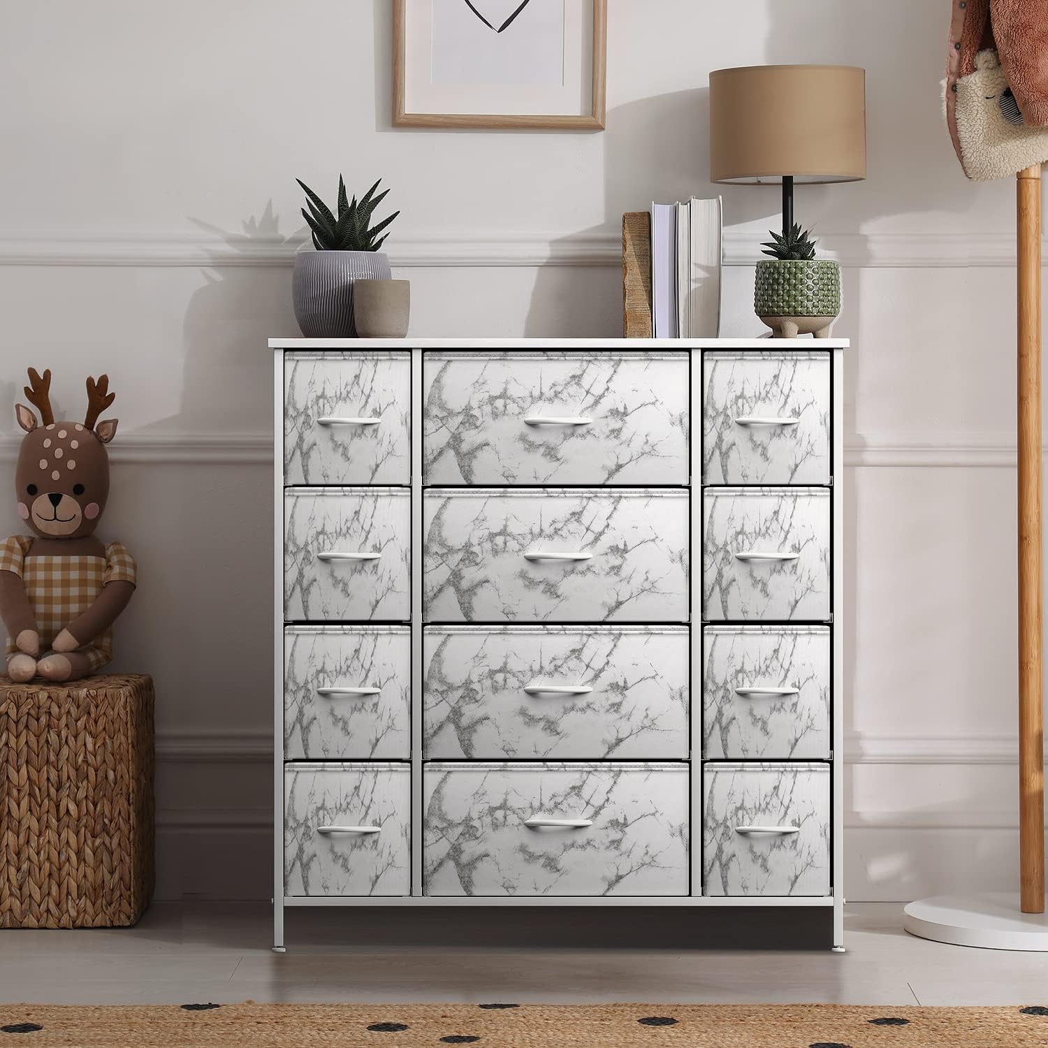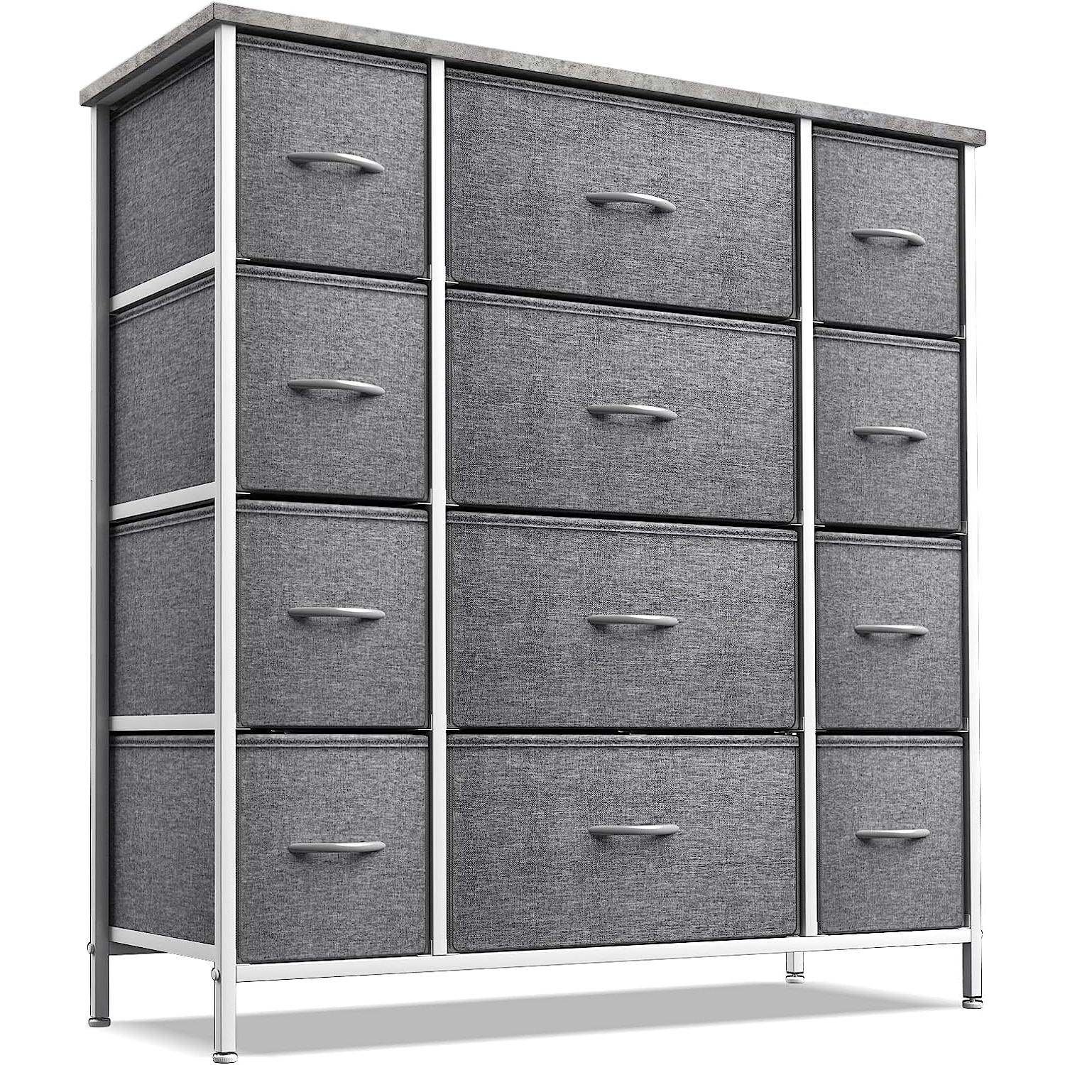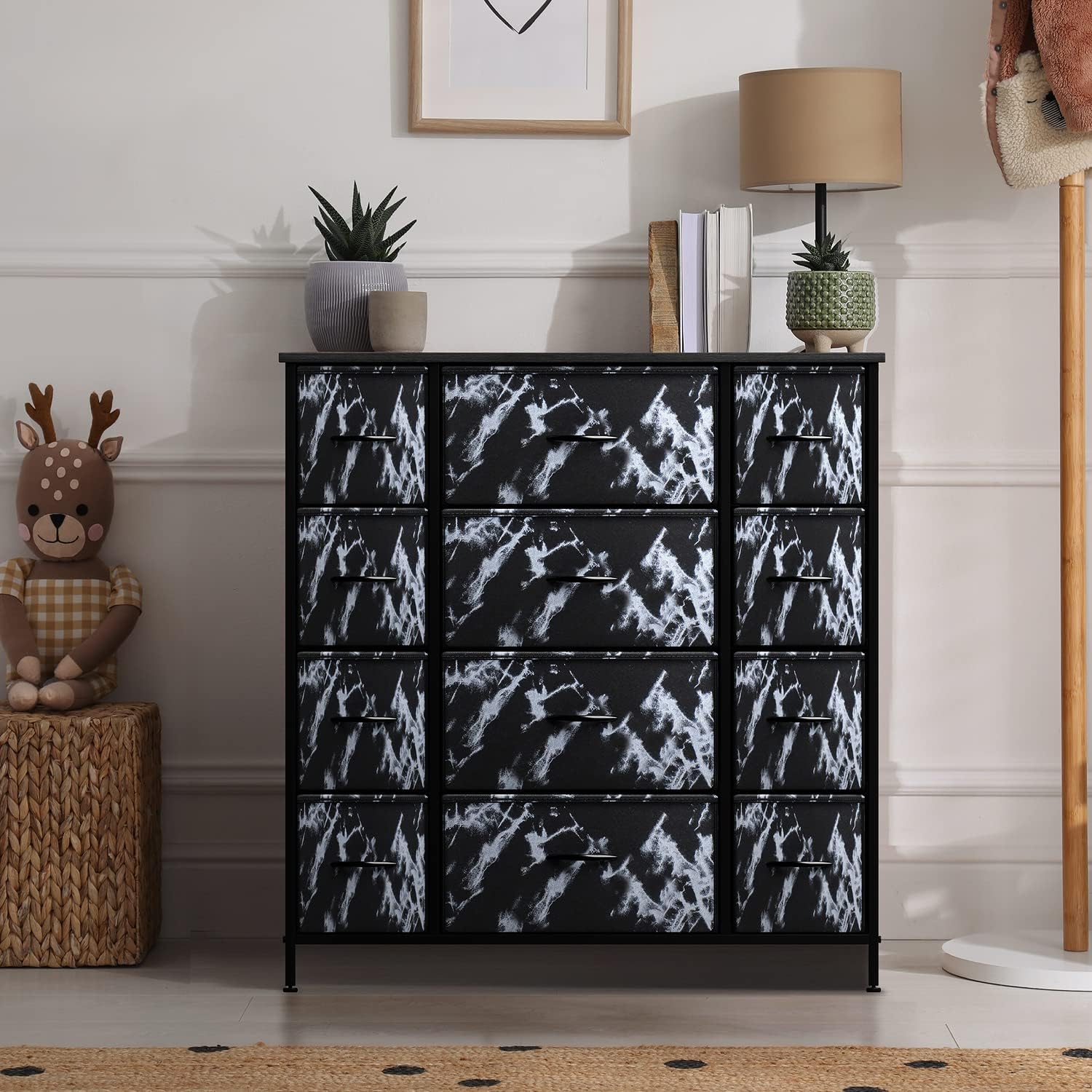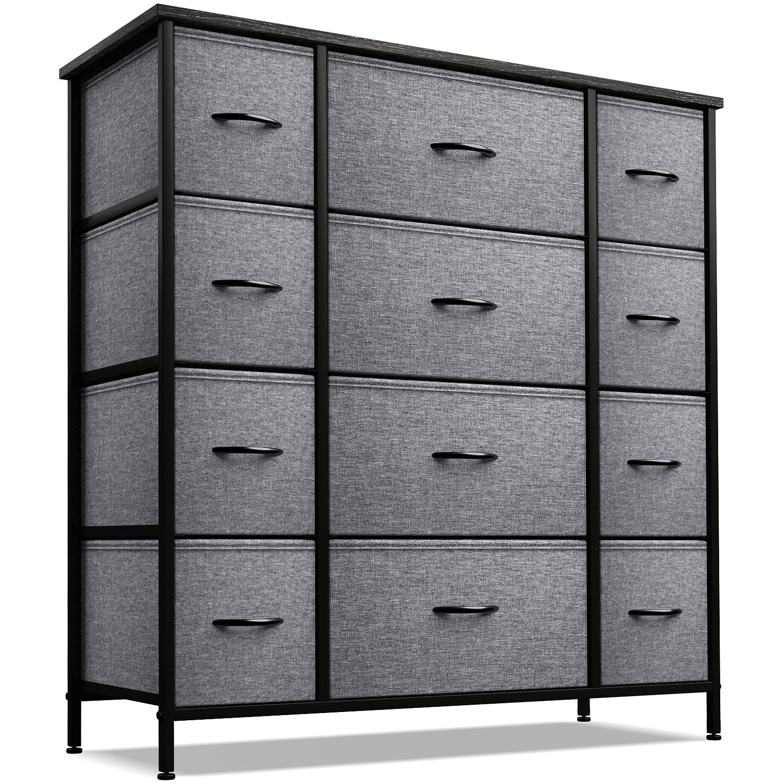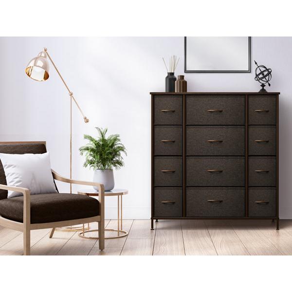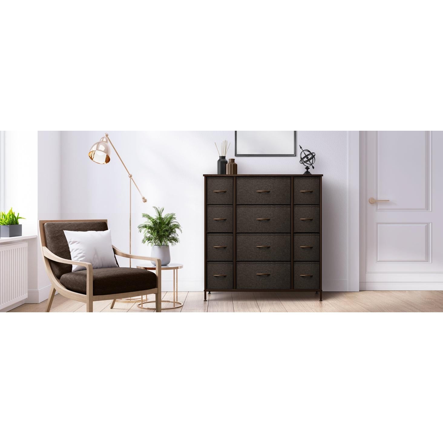 Tuck away your essentials in this 12-Drawer Dresser! Classic yet minimal, this furniture piece features a faux wood top surface and strong steel frame. Twelve drawers pull out to reveal all your clothing, linens, and more. Place anywhere from your bedroom, office, or college dorm to get organized in style. The lightweight frame makes this unit easy to transport and when not in use, simply fold the fabric drawers flat for storage.