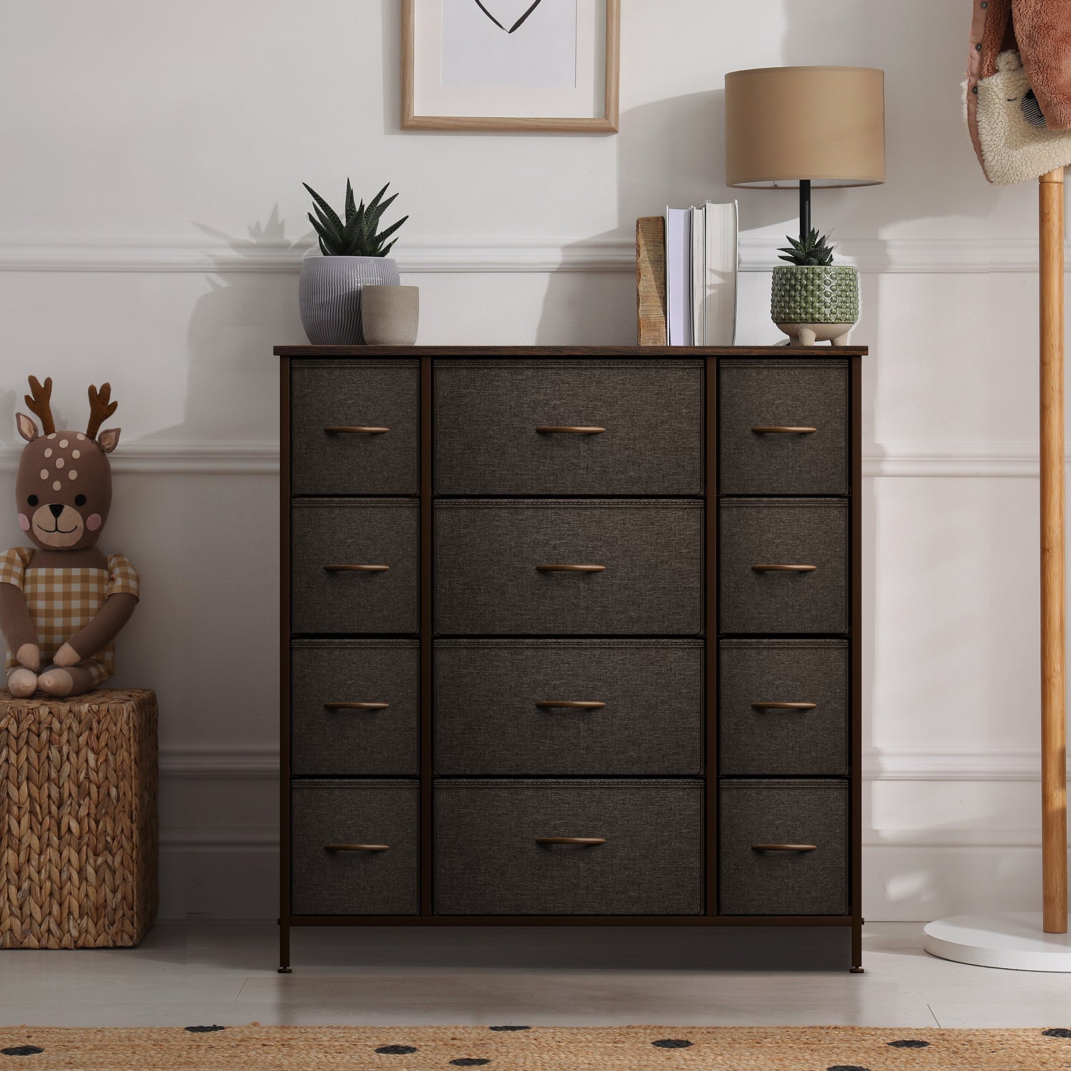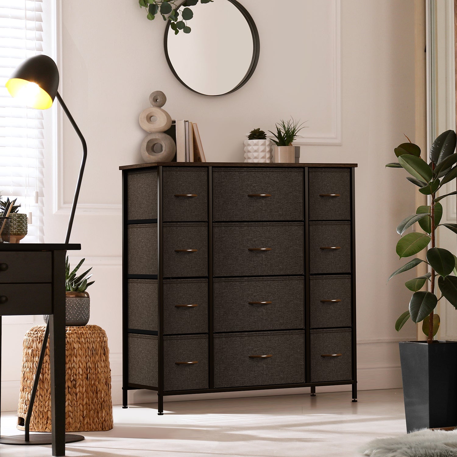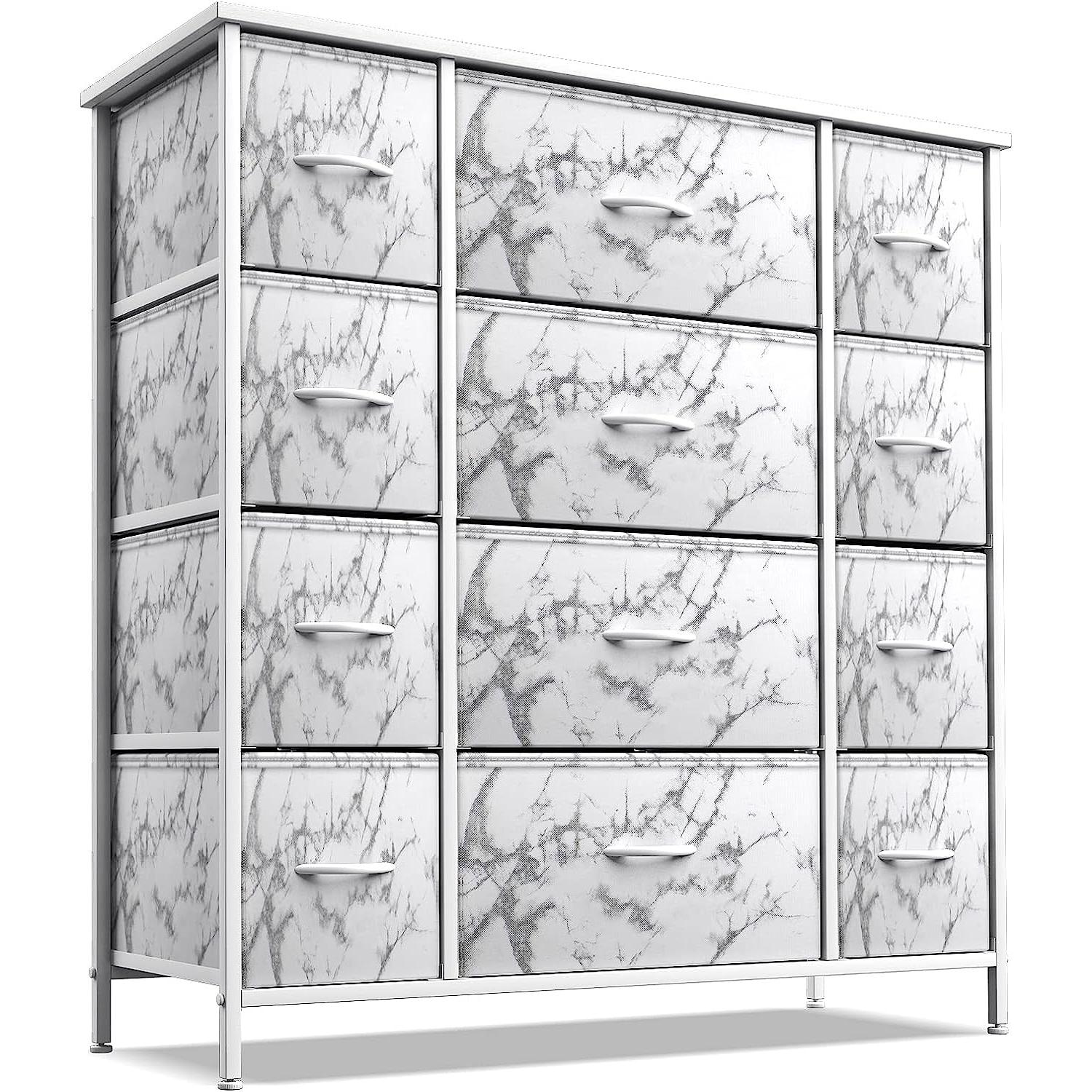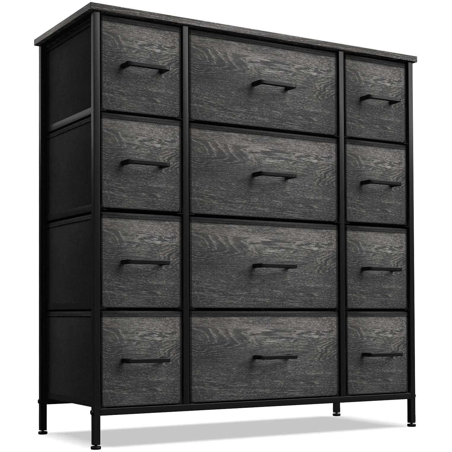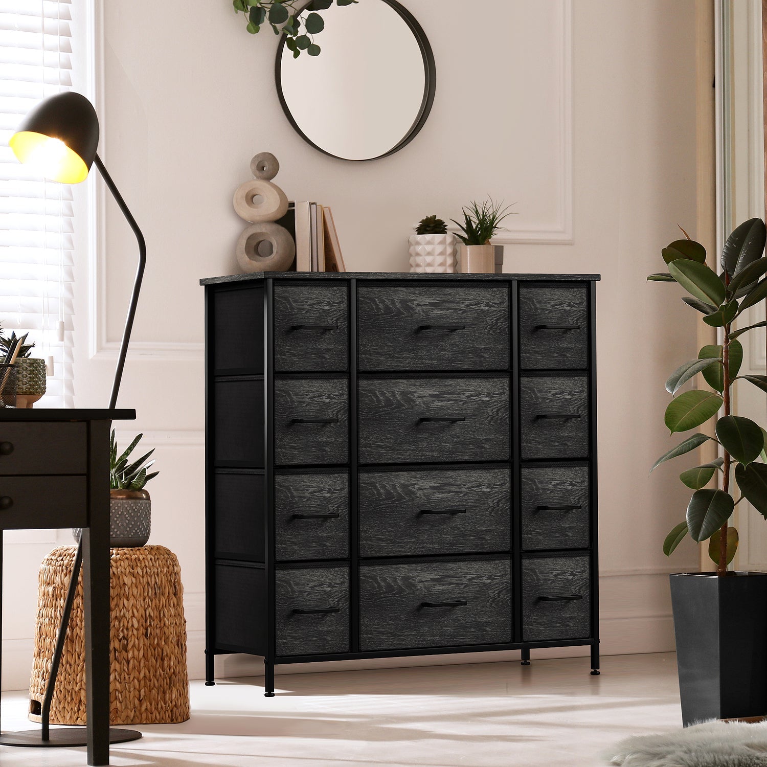 Tuck away your essentials in this 12-Drawer Dresser! Classic yet minimal, this furniture piece features a faux wood top surface and strong steel frame. Twelve drawers pull out to reveal all your clothing, linens, and more. Place anywhere from your bedroom, office, or college dorm to get organized in style. The lightweight frame makes this unit easy to transport and when not in use, simply fold the fabric drawers flat for storage.