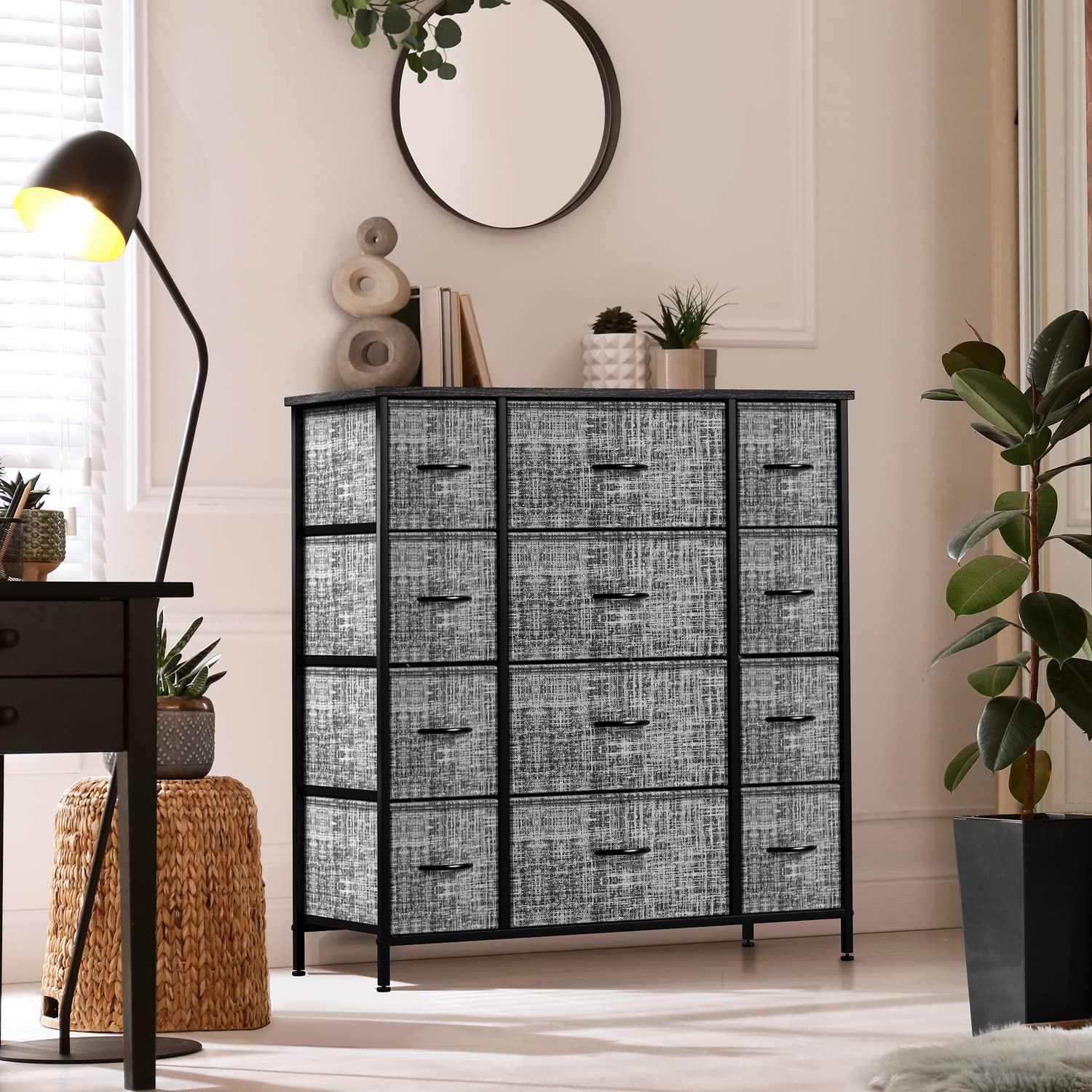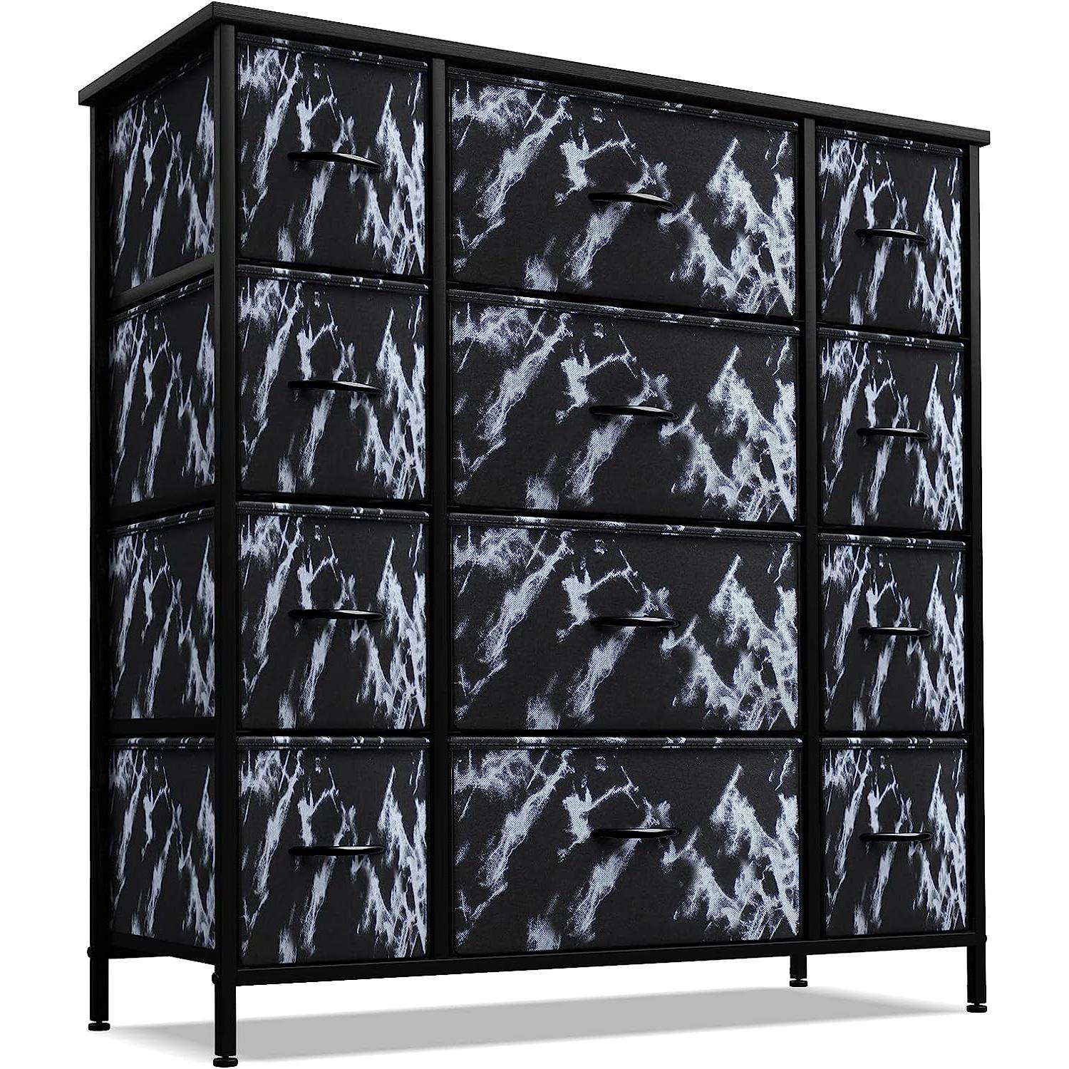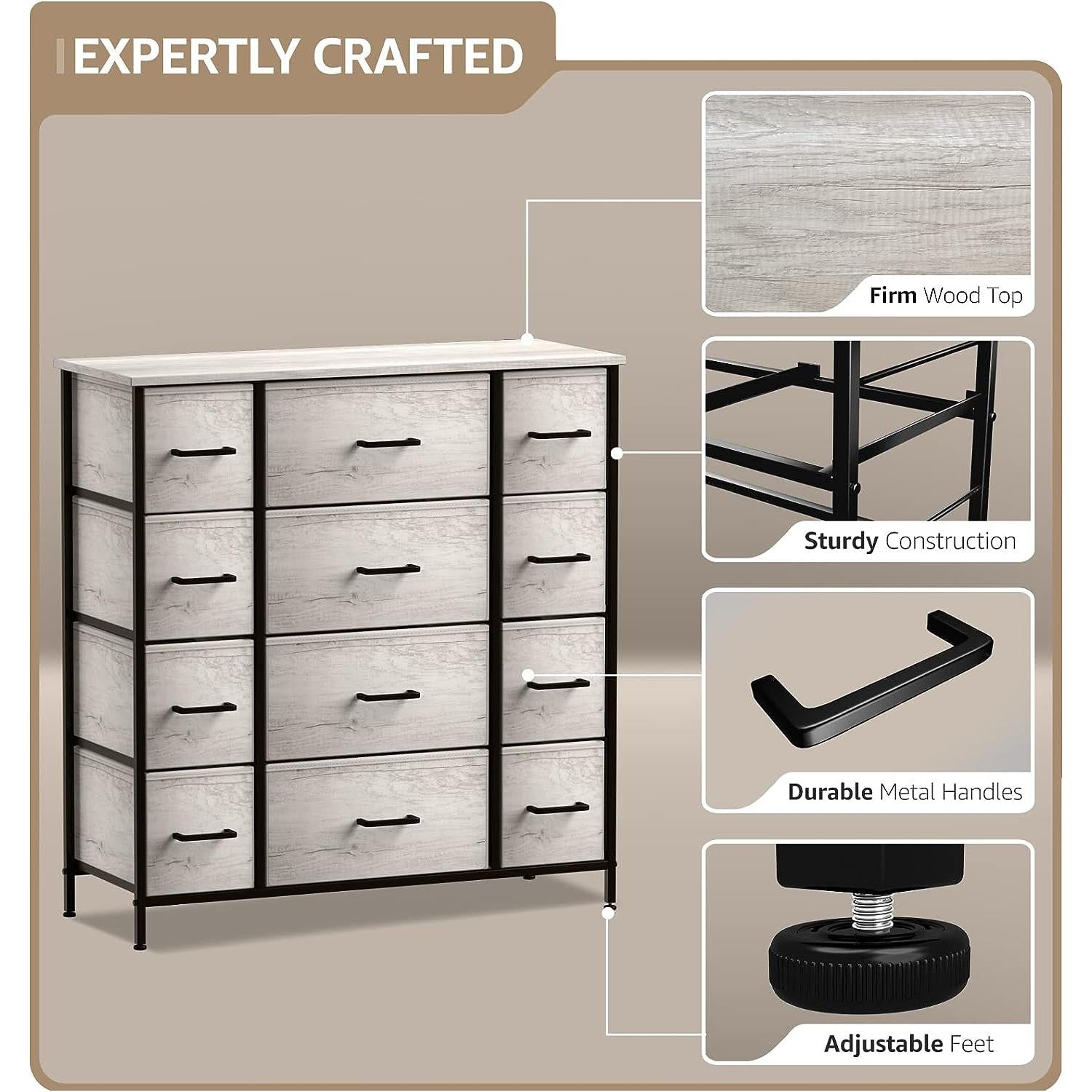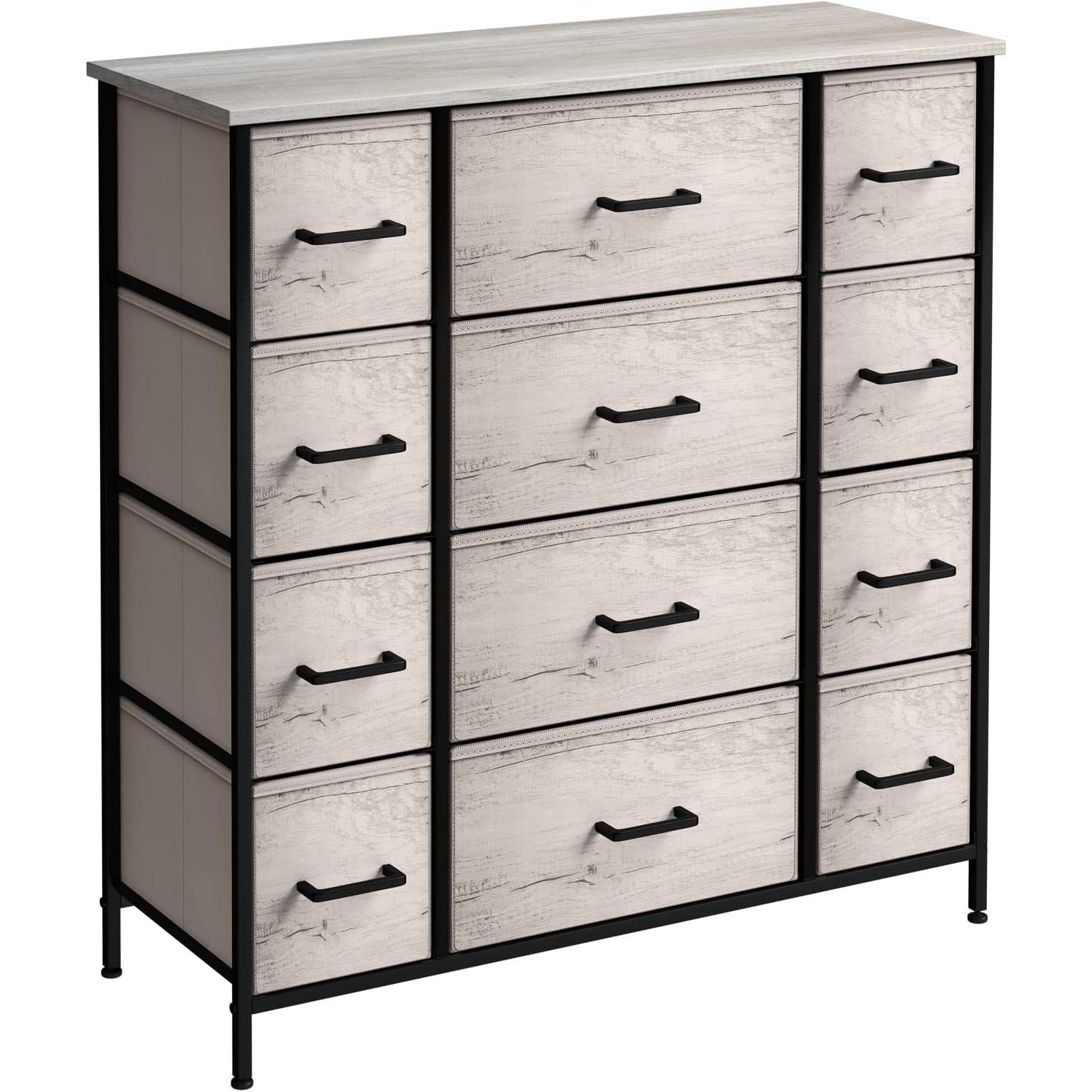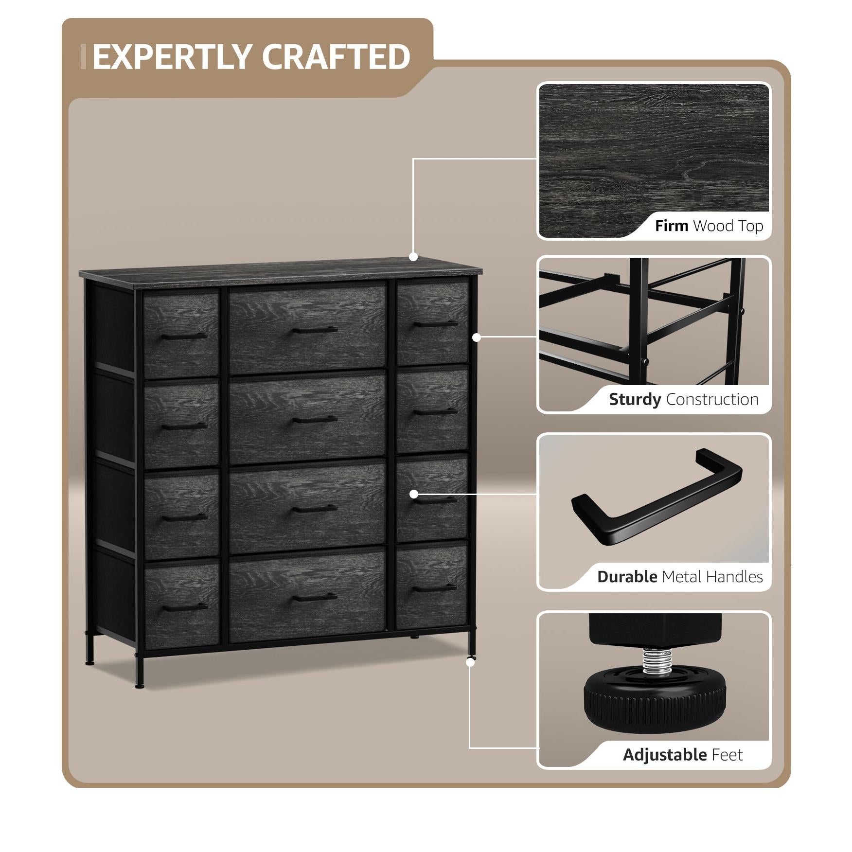 Tuck away your essentials in this 12-Drawer Dresser! Classic yet minimal, this furniture piece features a faux wood top surface and strong steel frame. Twelve drawers pull out to reveal all your clothing, linens, and more. Place anywhere from your bedroom, office, or college dorm to get organized in style. The lightweight frame makes this unit easy to transport and when not in use, simply fold the fabric drawers flat for storage.