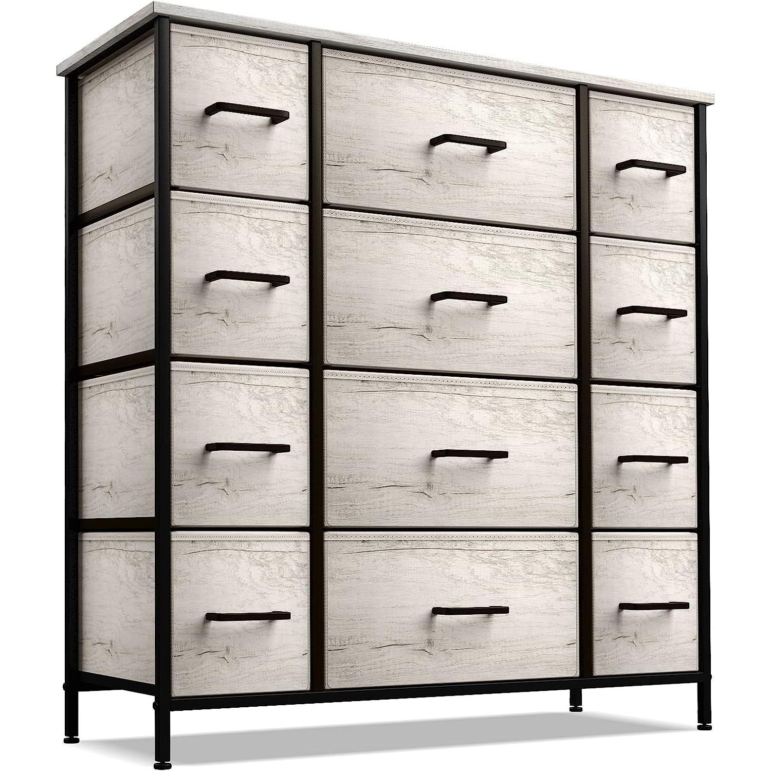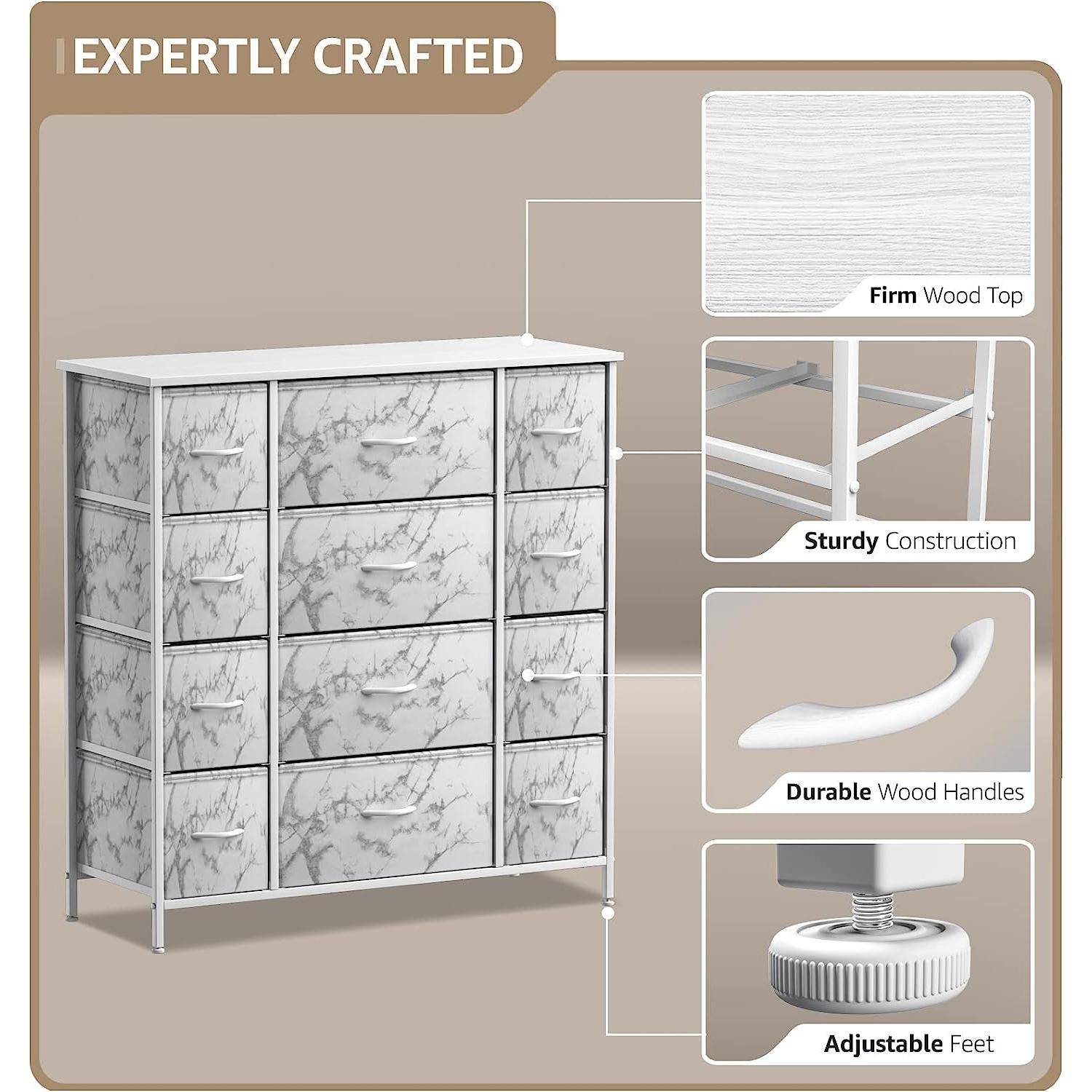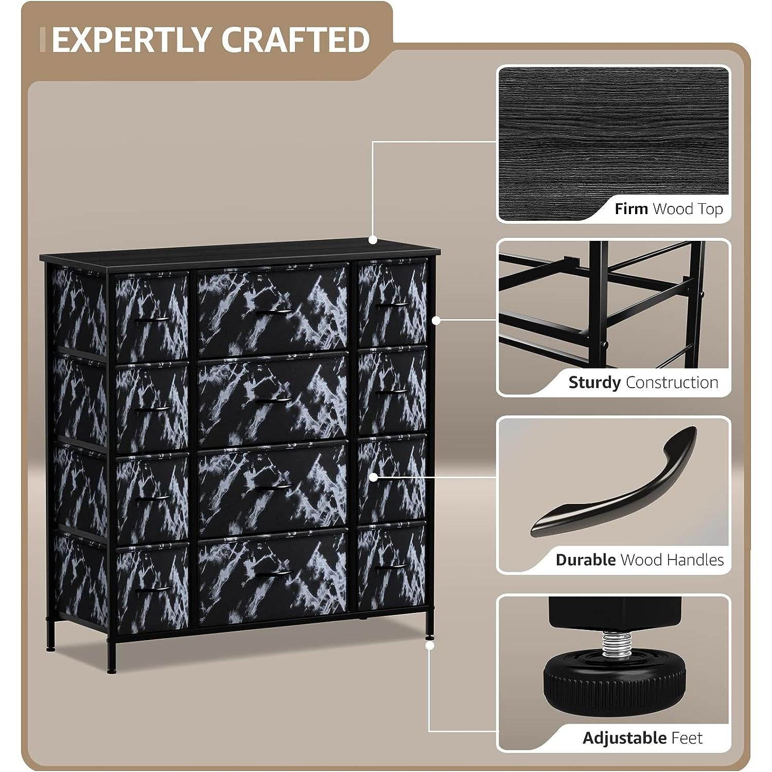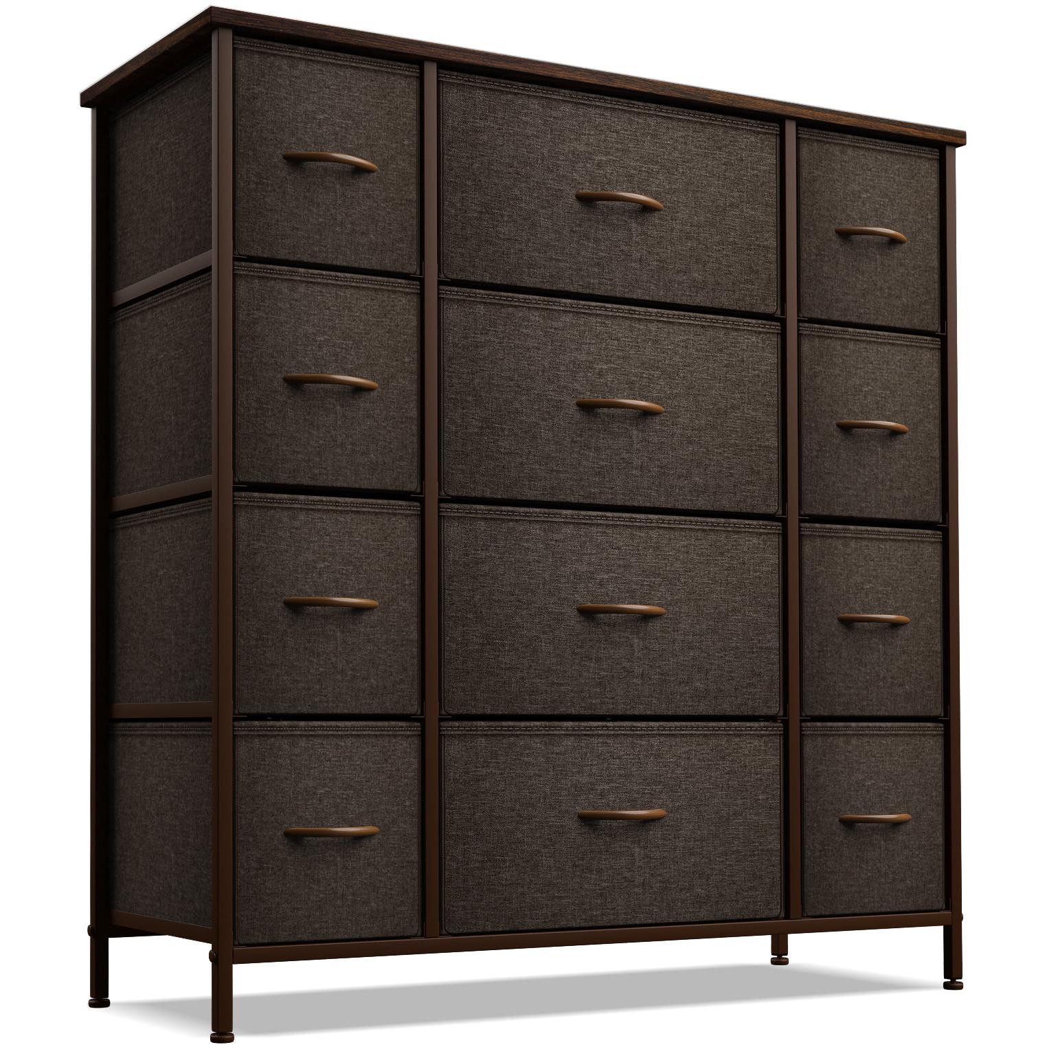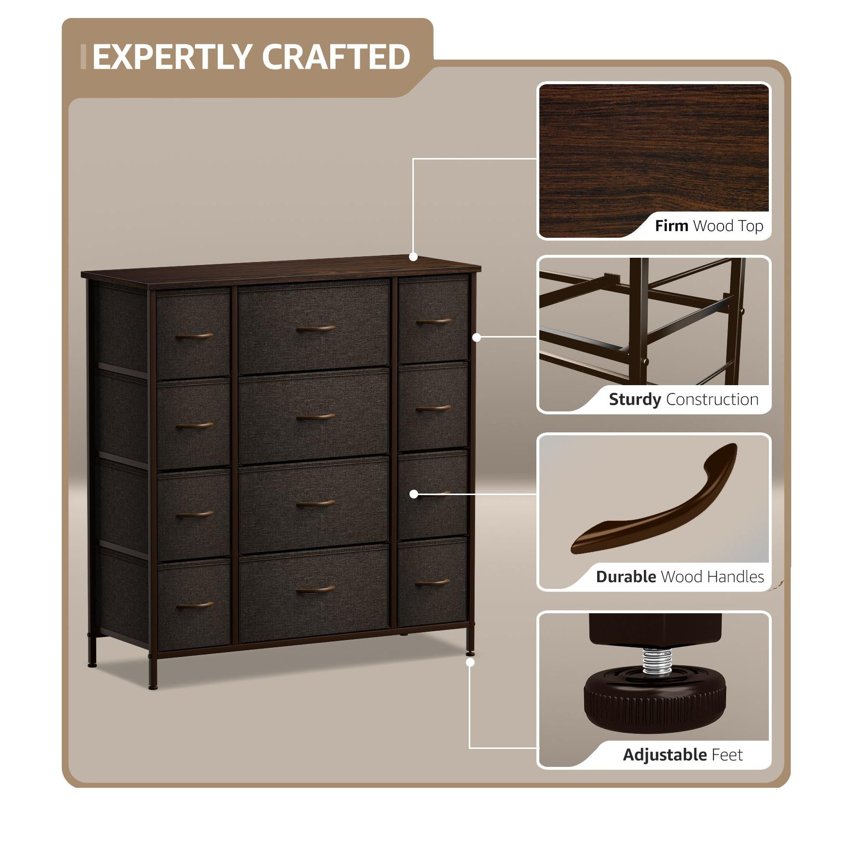 Tuck away your essentials in this 12-Drawer Dresser! Classic yet minimal, this furniture piece features a faux wood top surface and strong steel frame. Twelve drawers pull out to reveal all your clothing, linens, and more. Place anywhere from your bedroom, office, or college dorm to get organized in style. The lightweight frame makes this unit easy to transport and when not in use, simply fold the fabric drawers flat for storage.