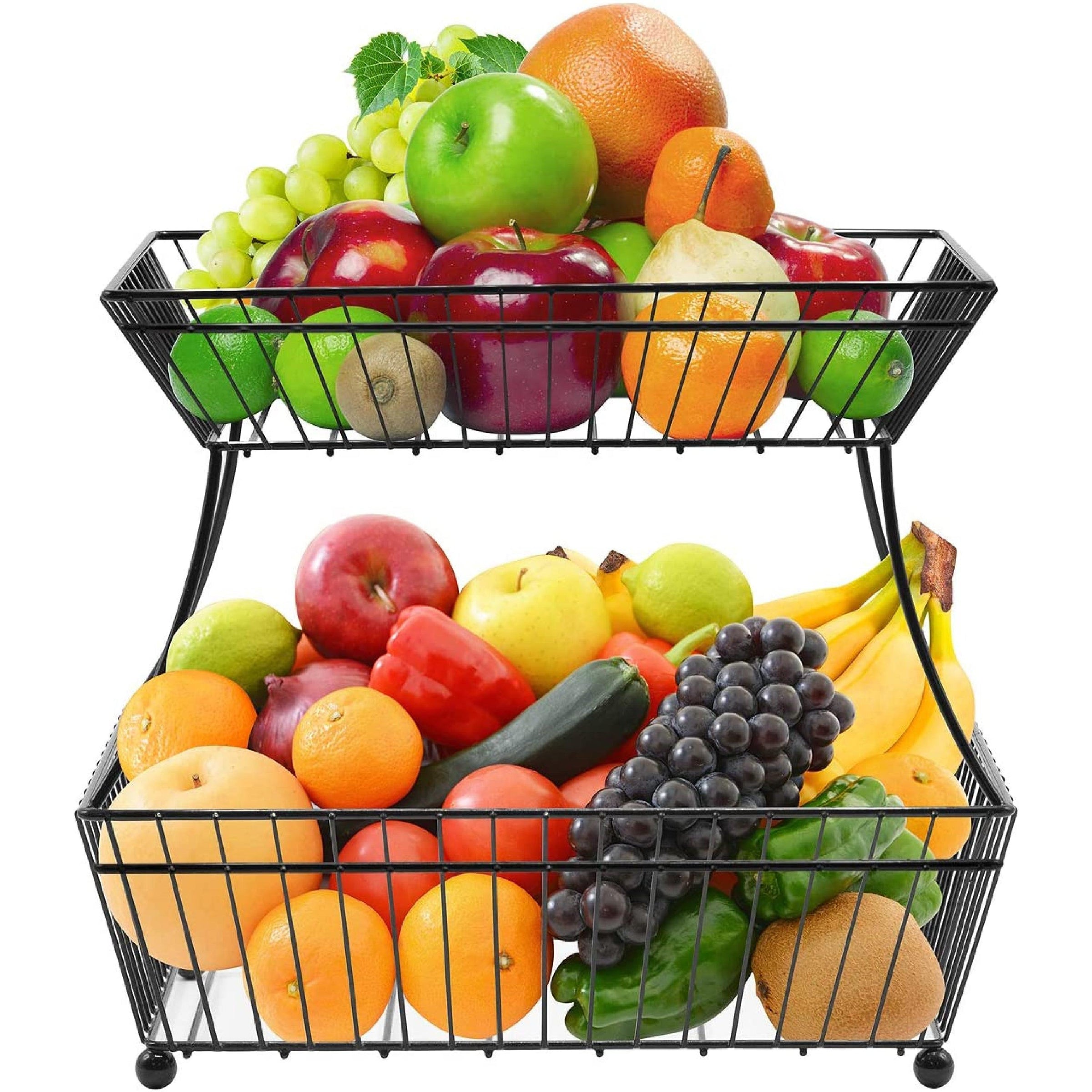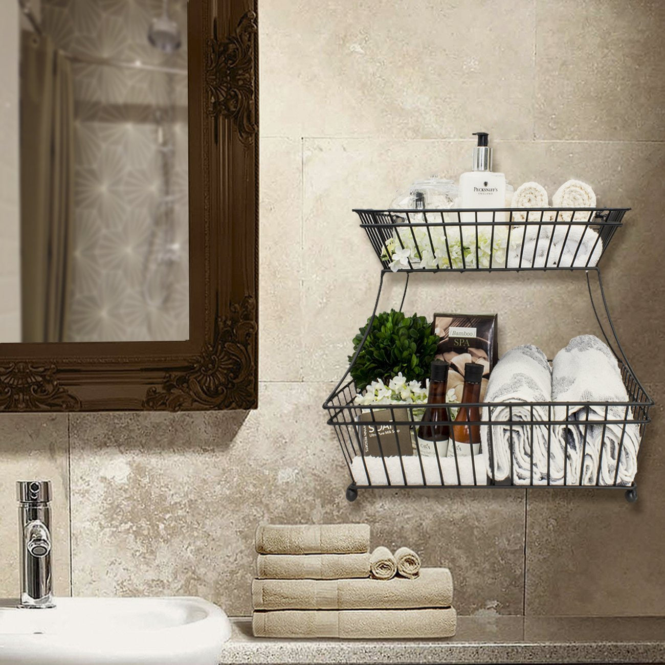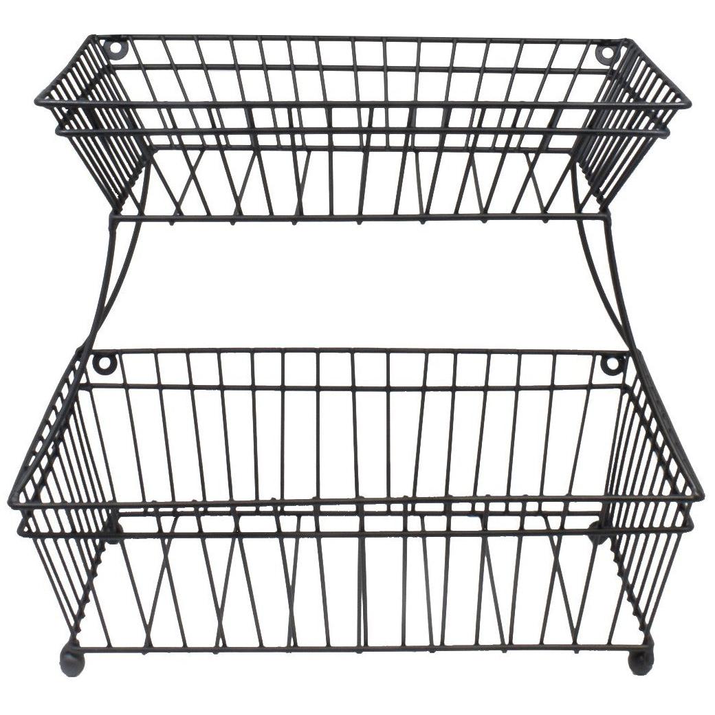 Display your favorite pastries and produce in this 2-Tier Basket Stand! As a stunning addition to your countertop, wall, or buffet, this generous size stand features a decorative two-level design for an assortment of food and household items. Use it to de-clutter counters or mount it to the wall for space-saving storage. It's practical for everyday use yet sophisticated for entertaining. When hosting calls, place on serving tables with neatly arranged muffins, scones, or fresh bread reminiscent of an upscale bakery. For versatility, keep it stocked with treats for the kids or bathroom toiletries to welcome overnight guest.