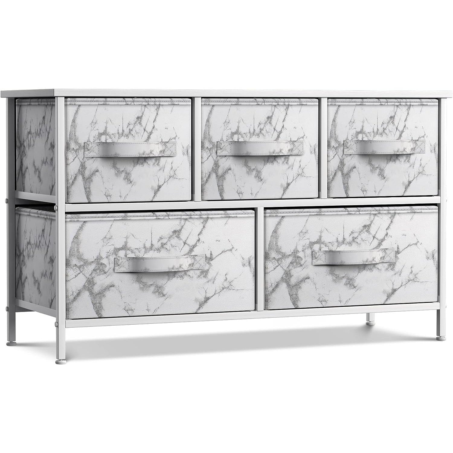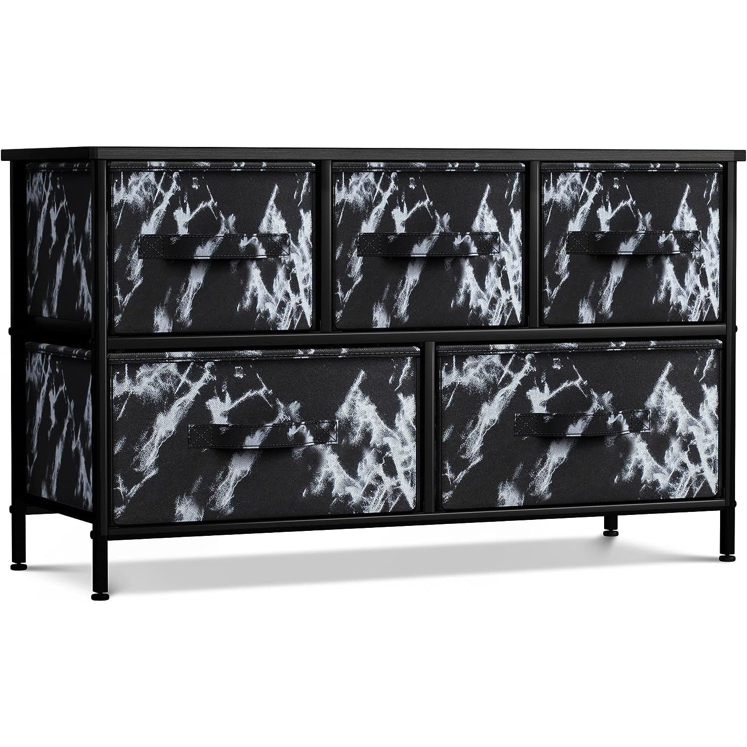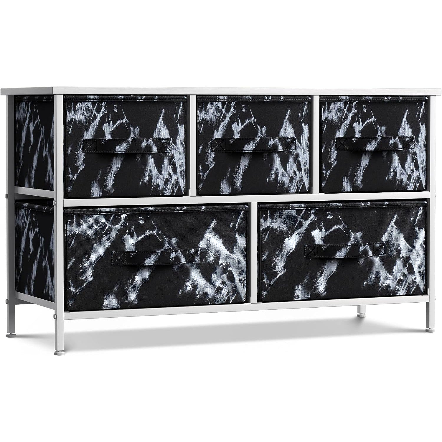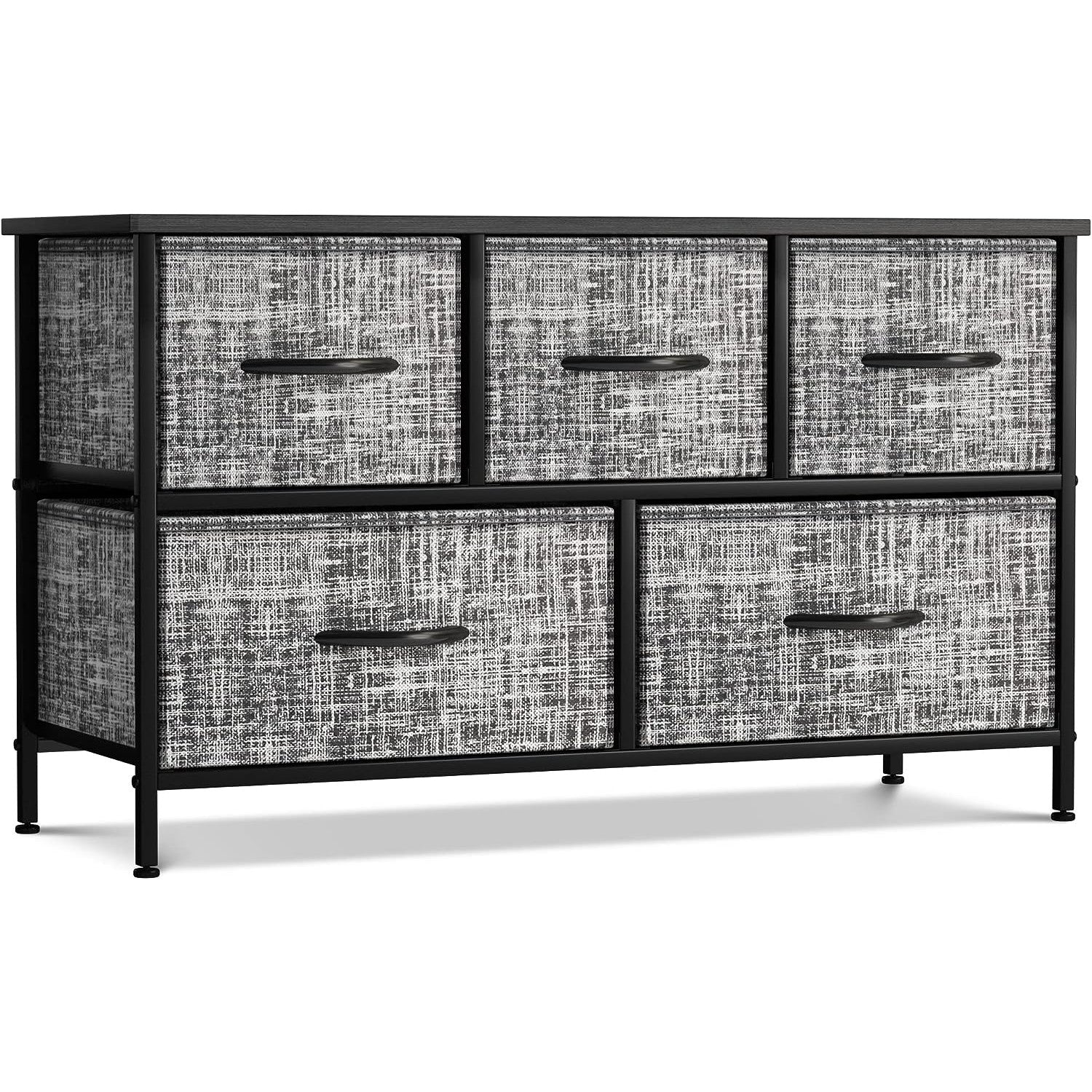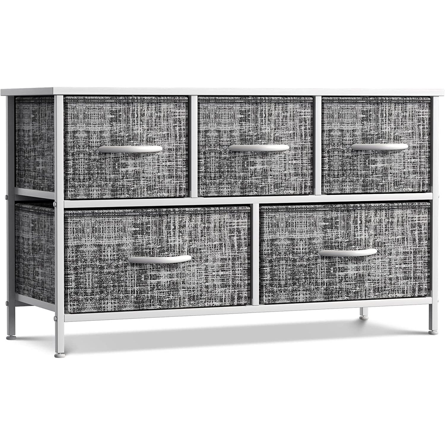 Give your household essentials a cozy landing spot with the Sorbus 5-Drawer Dresser. This wide dresser chest features a tabletop surface and pull-out drawers to tuck away household clutter. The thoughtful design is great for small living spaces and works equally well near the bed or sofa. Organization enthusiasts will enjoy filling each drawer with clothing, linens, and knick-knicks from around the home. The lightweight frame makes this unit easy to transport and when not in use, simply dissemble the frame and fold the fabric drawers flat for storage. Use alone as a single unit or pair with matching styles from the Sorbus Furniture Collection.
