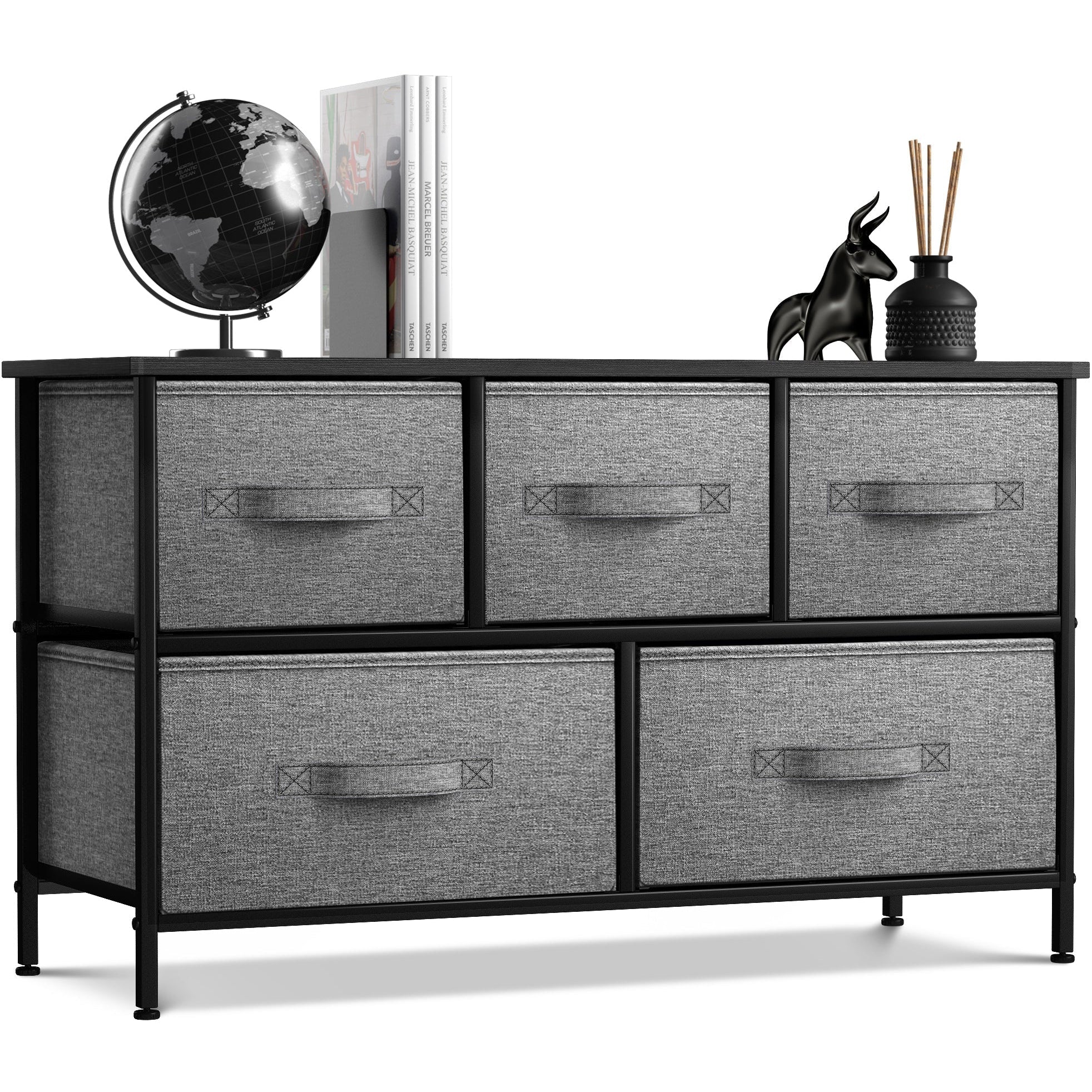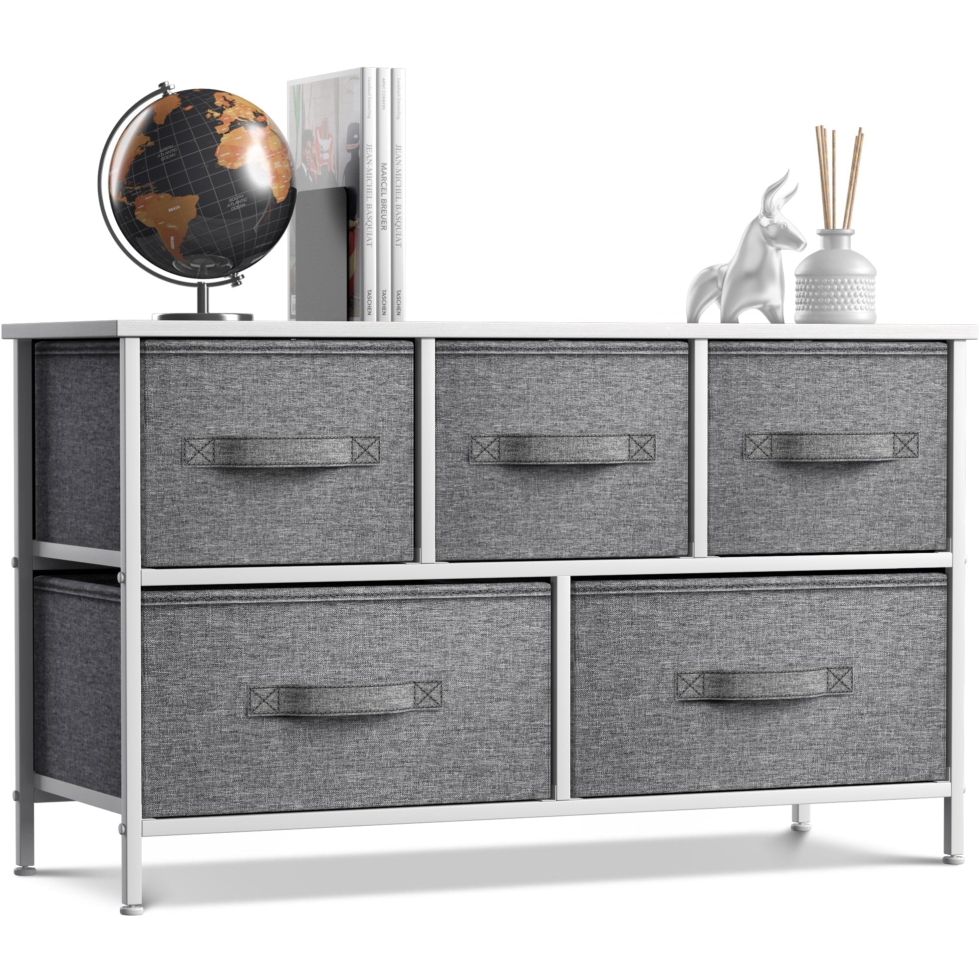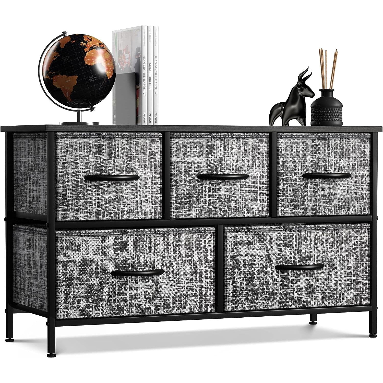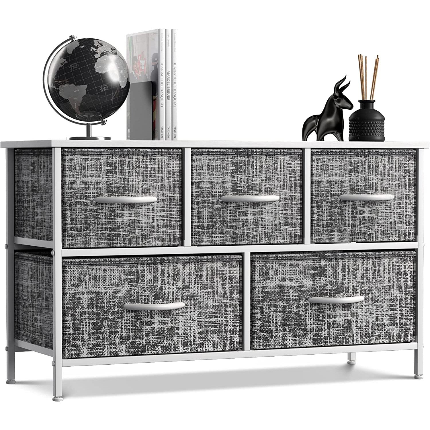 Give your household essentials a cozy landing spot with the Sorbus 5-Drawer Dresser. This wide dresser chest features a tabletop surface and pull-out drawers to tuck away household clutter. The thoughtful design is great for small living spaces and works equally well near the bed or sofa. Organization enthusiasts will enjoy filling each drawer with clothing, linens, and knick-knicks from around the home. The lightweight frame makes this unit easy to transport and when not in use, simply dissemble the frame and fold the fabric drawers flat for storage. Use alone as a single unit or pair with matching styles from the Sorbus Furniture Collection.