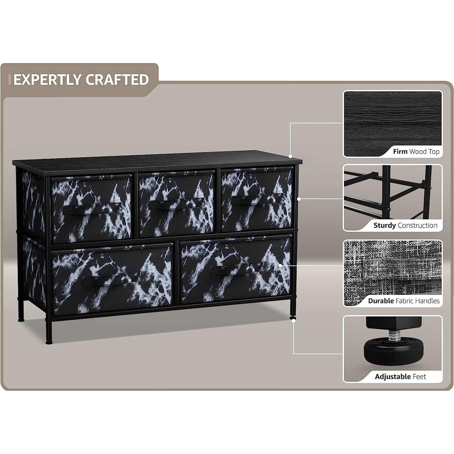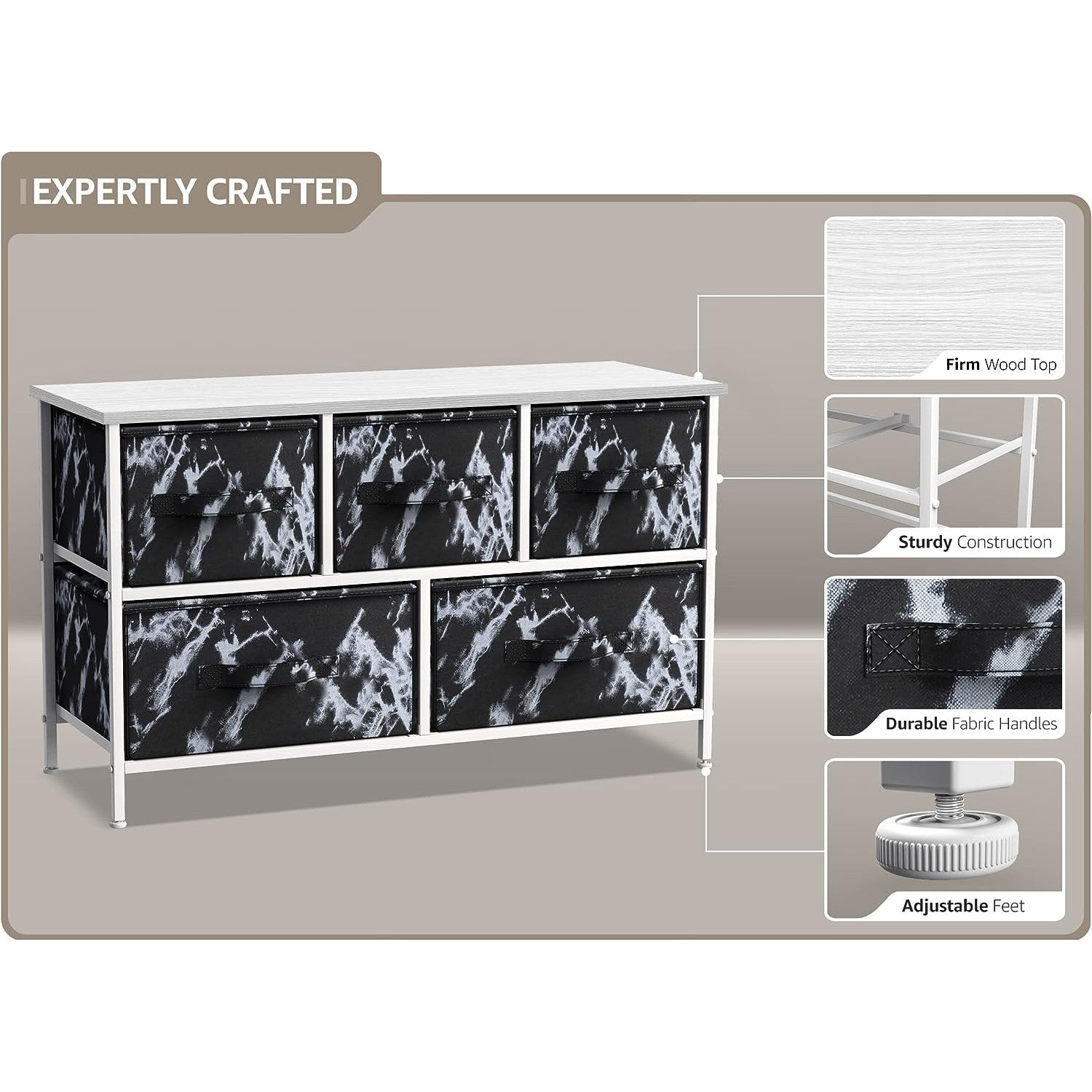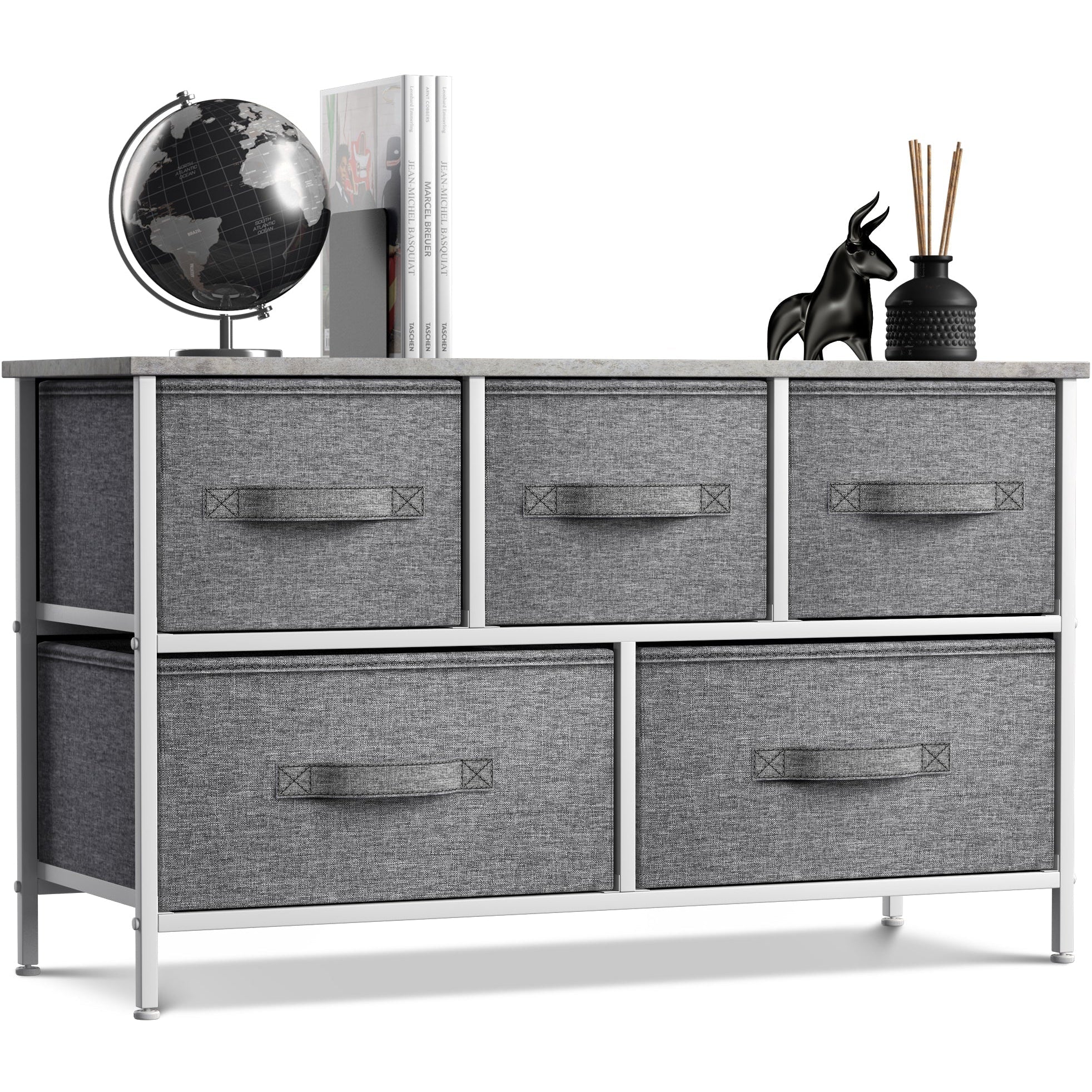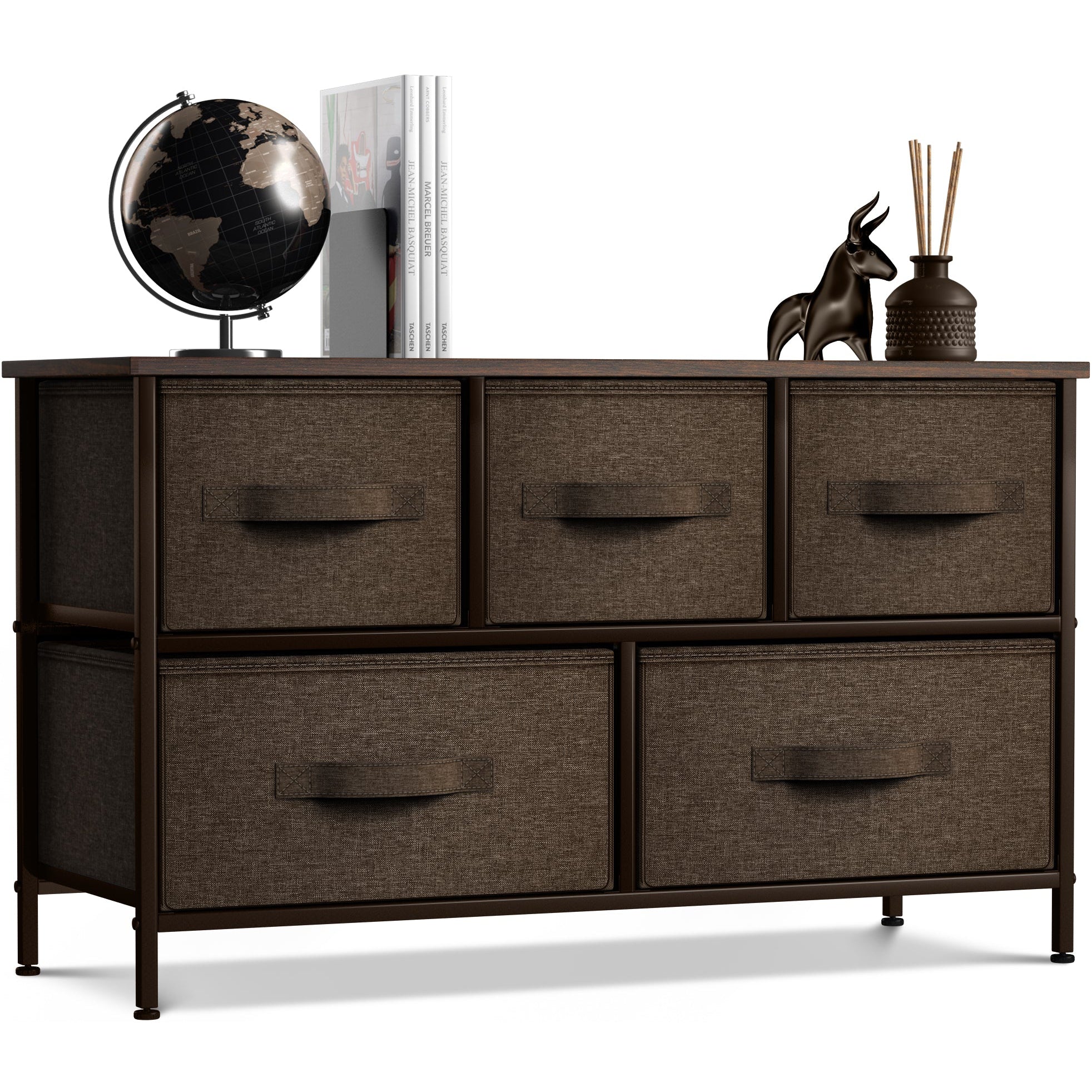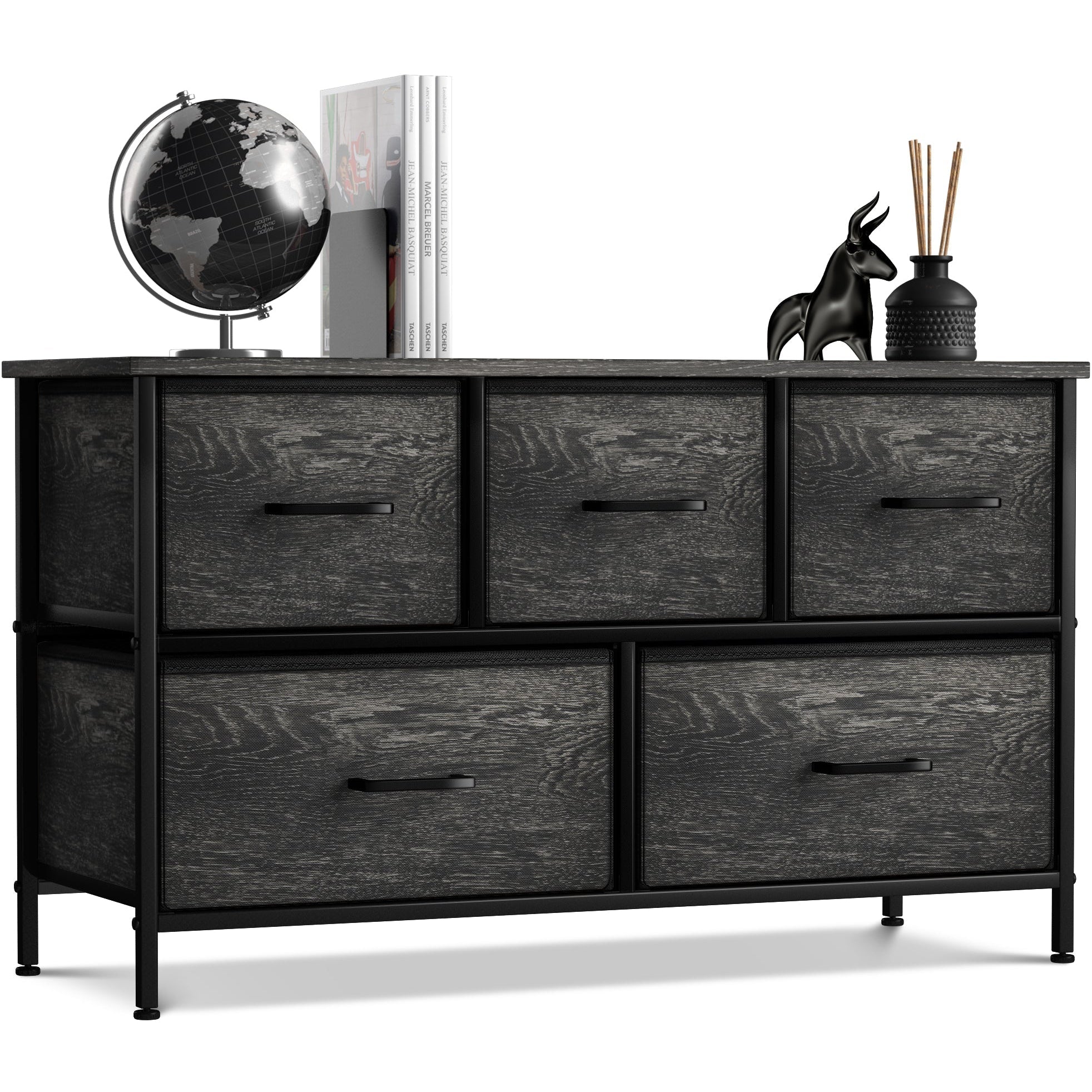 Give your household essentials a cozy landing spot with the Sorbus 5-Drawer Dresser. This wide dresser chest features a tabletop surface and pull-out drawers to tuck away household clutter. The thoughtful design is great for small living spaces and works equally well near the bed or sofa. Organization enthusiasts will enjoy filling each drawer with clothing, linens, and knick-knicks from around the home. The lightweight frame makes this unit easy to transport and when not in use, simply dissemble the frame and fold the fabric drawers flat for storage. Use alone as a single unit or pair with matching styles from the Sorbus Furniture Collection.