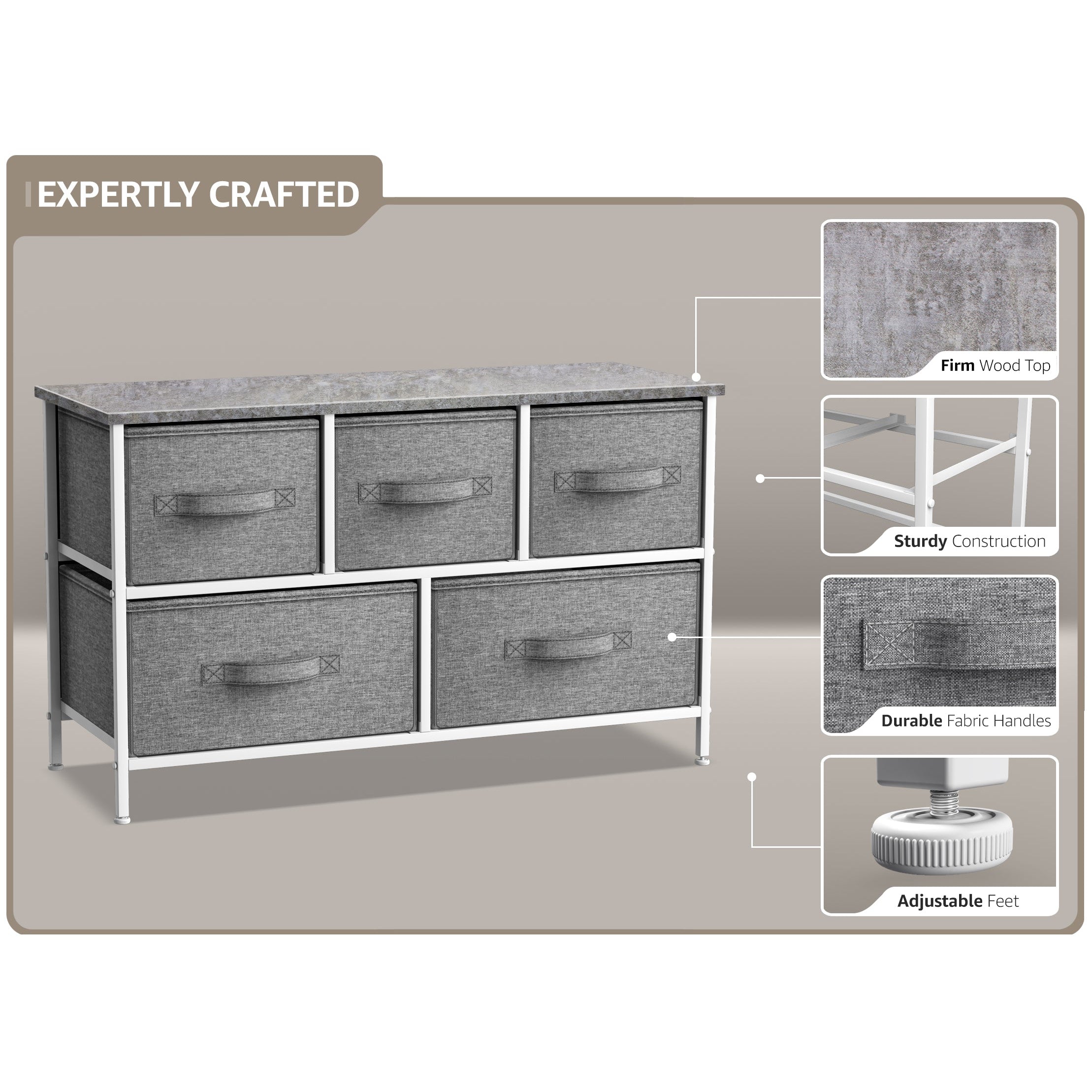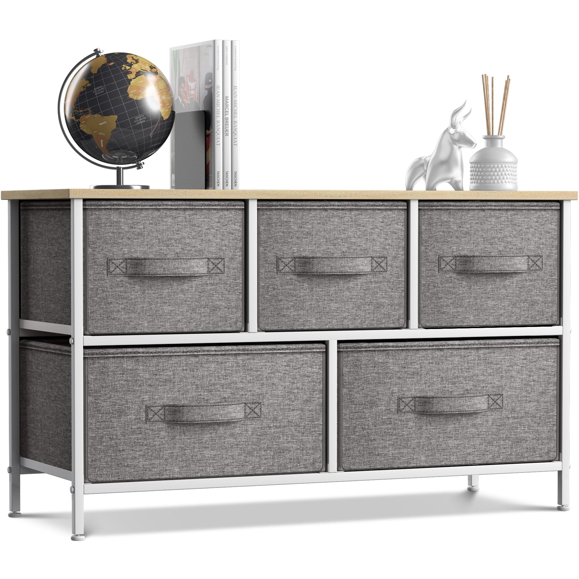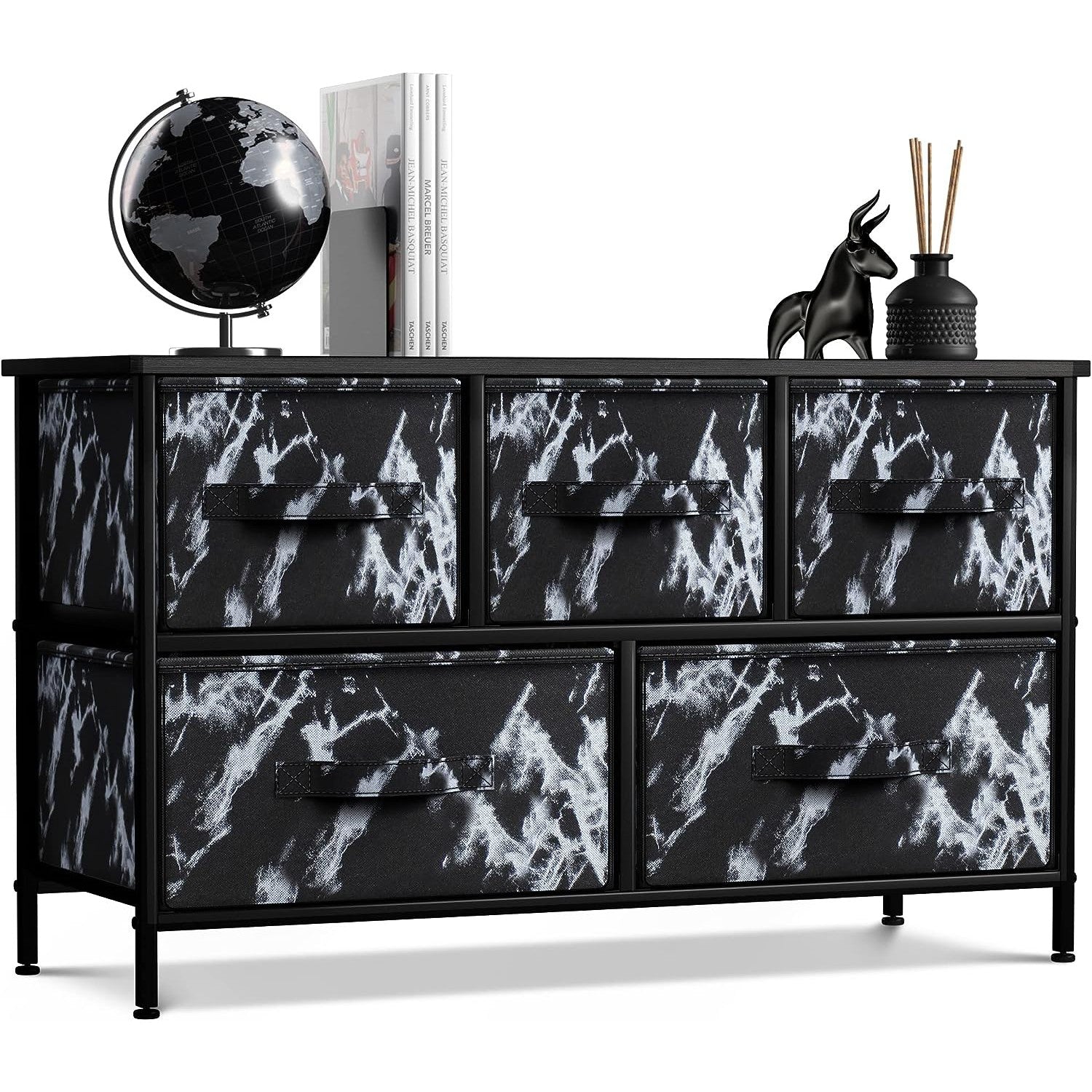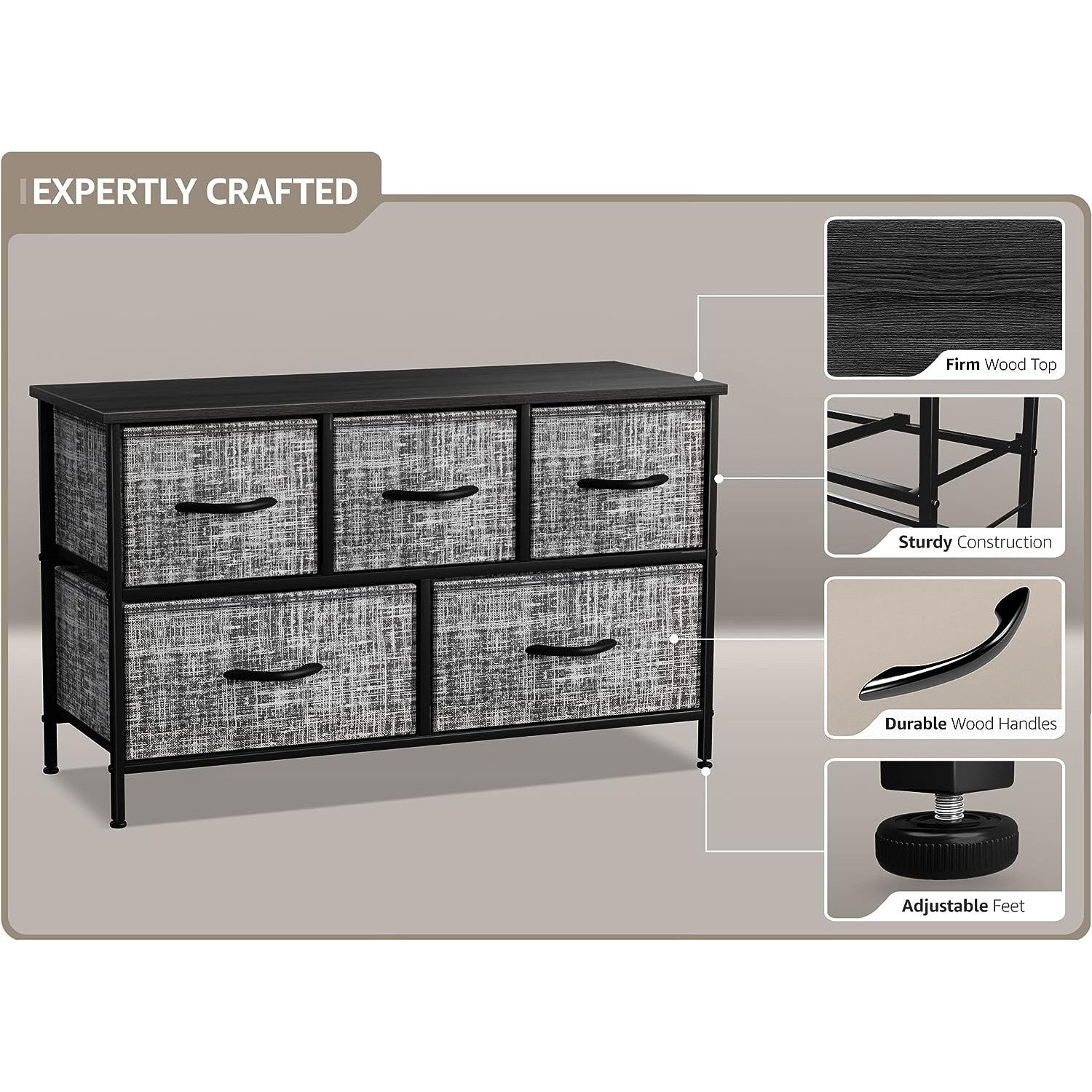 Give your household essentials a cozy landing spot with the Sorbus 5-Drawer Dresser. This wide dresser chest features a tabletop surface and pull-out drawers to tuck away household clutter. The thoughtful design is great for small living spaces and works equally well near the bed or sofa. Organization enthusiasts will enjoy filling each drawer with clothing, linens, and knick-knicks from around the home. The lightweight frame makes this unit easy to transport and when not in use, simply dissemble the frame and fold the fabric drawers flat for storage. Use alone as a single unit or pair with matching styles from the Sorbus Furniture Collection.