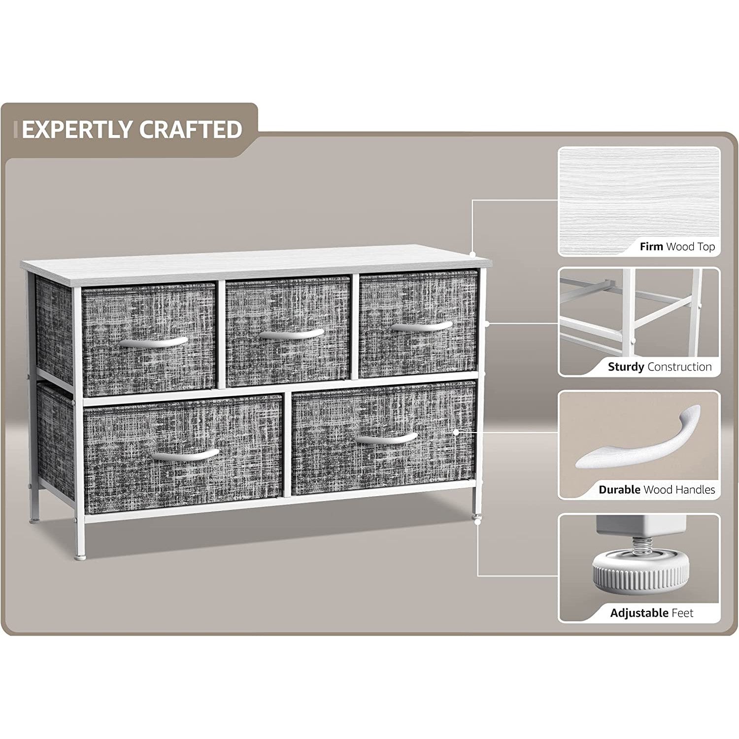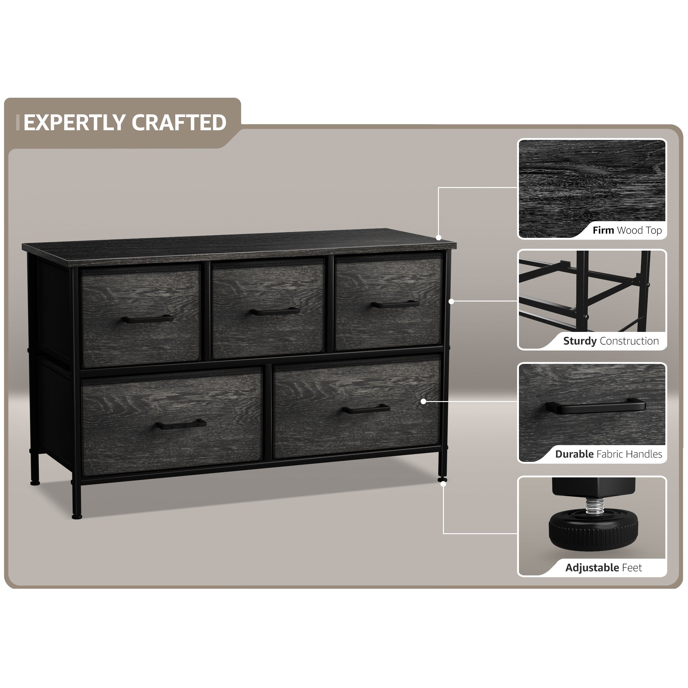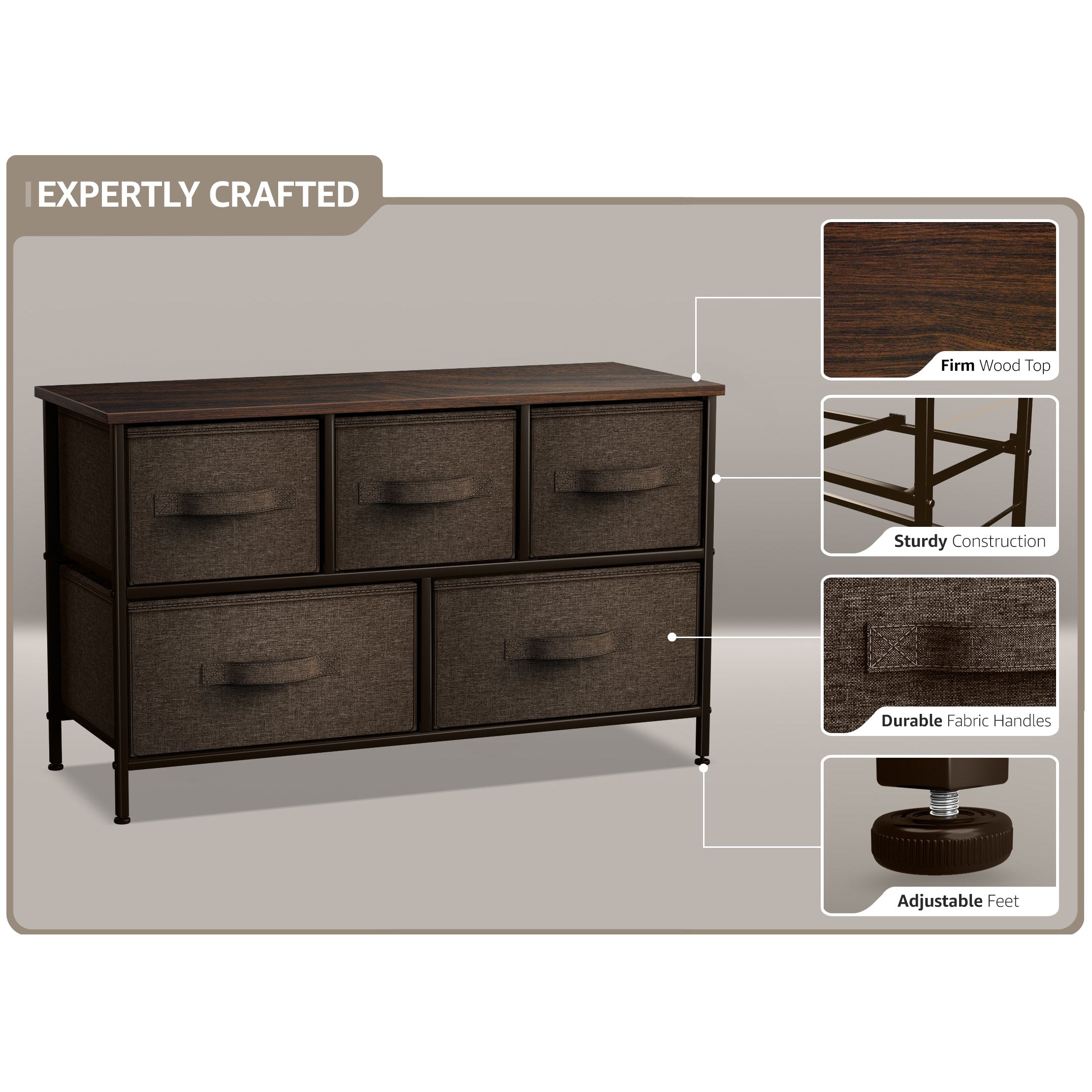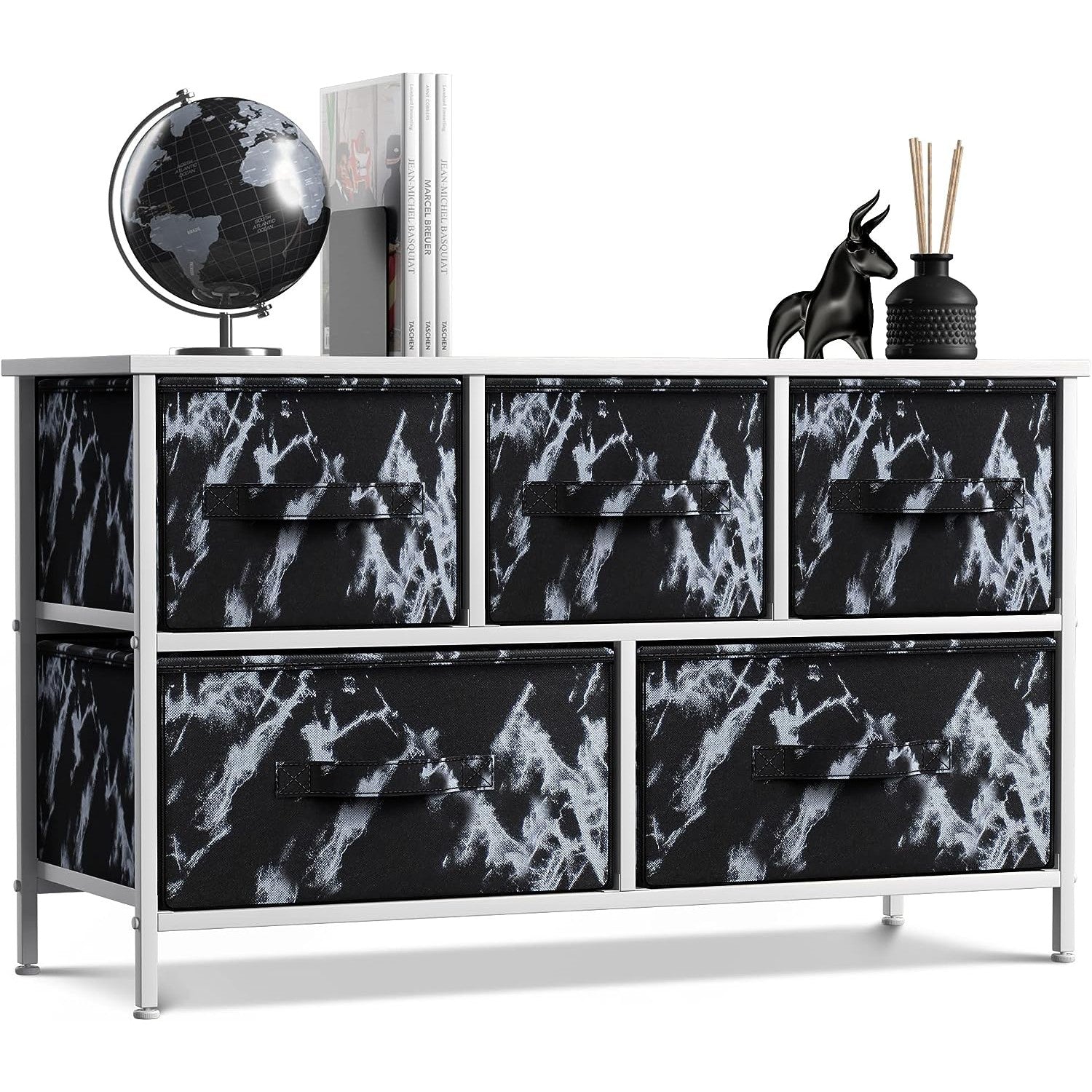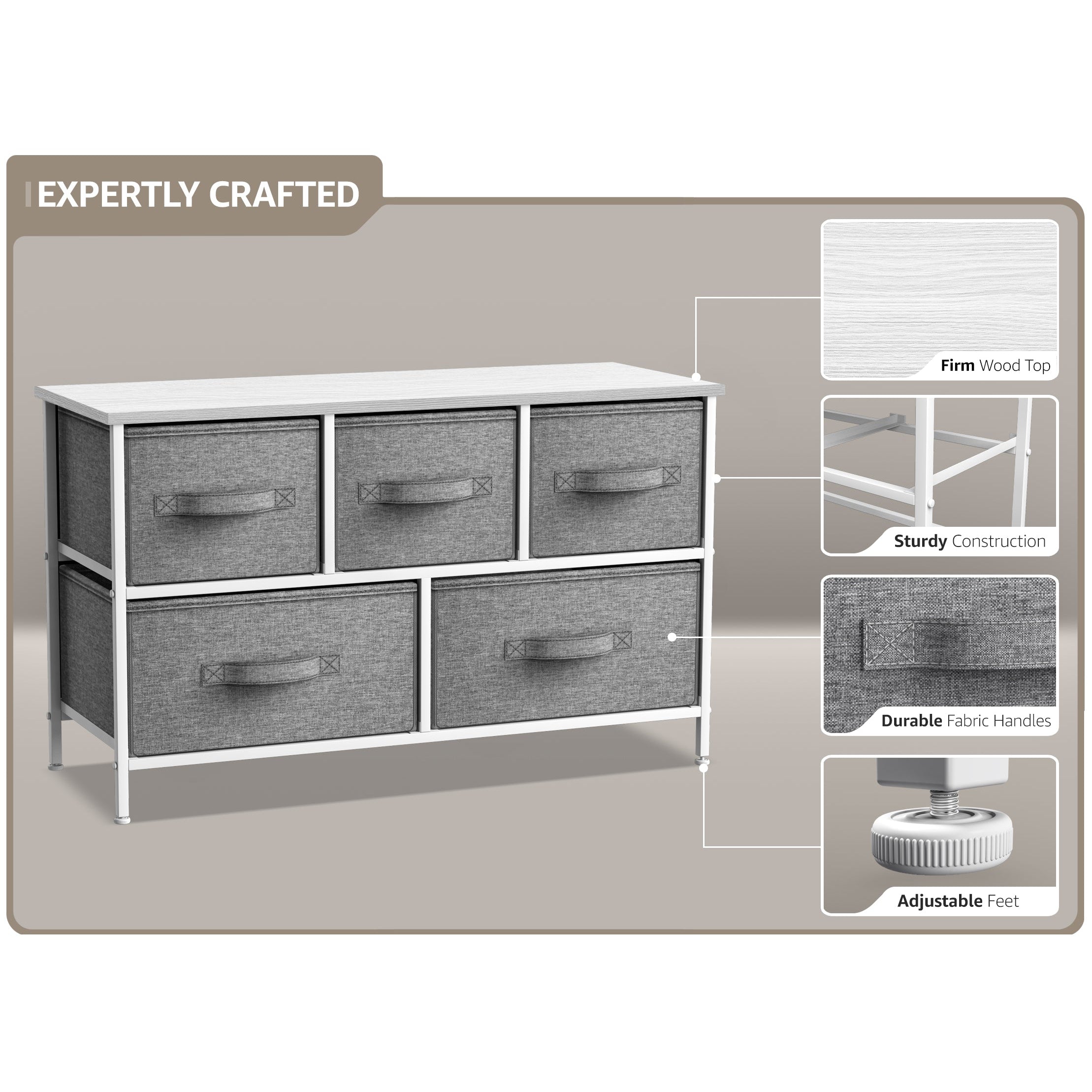 Give your household essentials a cozy landing spot with the Sorbus 5-Drawer Dresser. This wide dresser chest features a tabletop surface and pull-out drawers to tuck away household clutter. The thoughtful design is great for small living spaces and works equally well near the bed or sofa. Organization enthusiasts will enjoy filling each drawer with clothing, linens, and knick-knicks from around the home. The lightweight frame makes this unit easy to transport and when not in use, simply dissemble the frame and fold the fabric drawers flat for storage. Use alone as a single unit or pair with matching styles from the Sorbus Furniture Collection.
