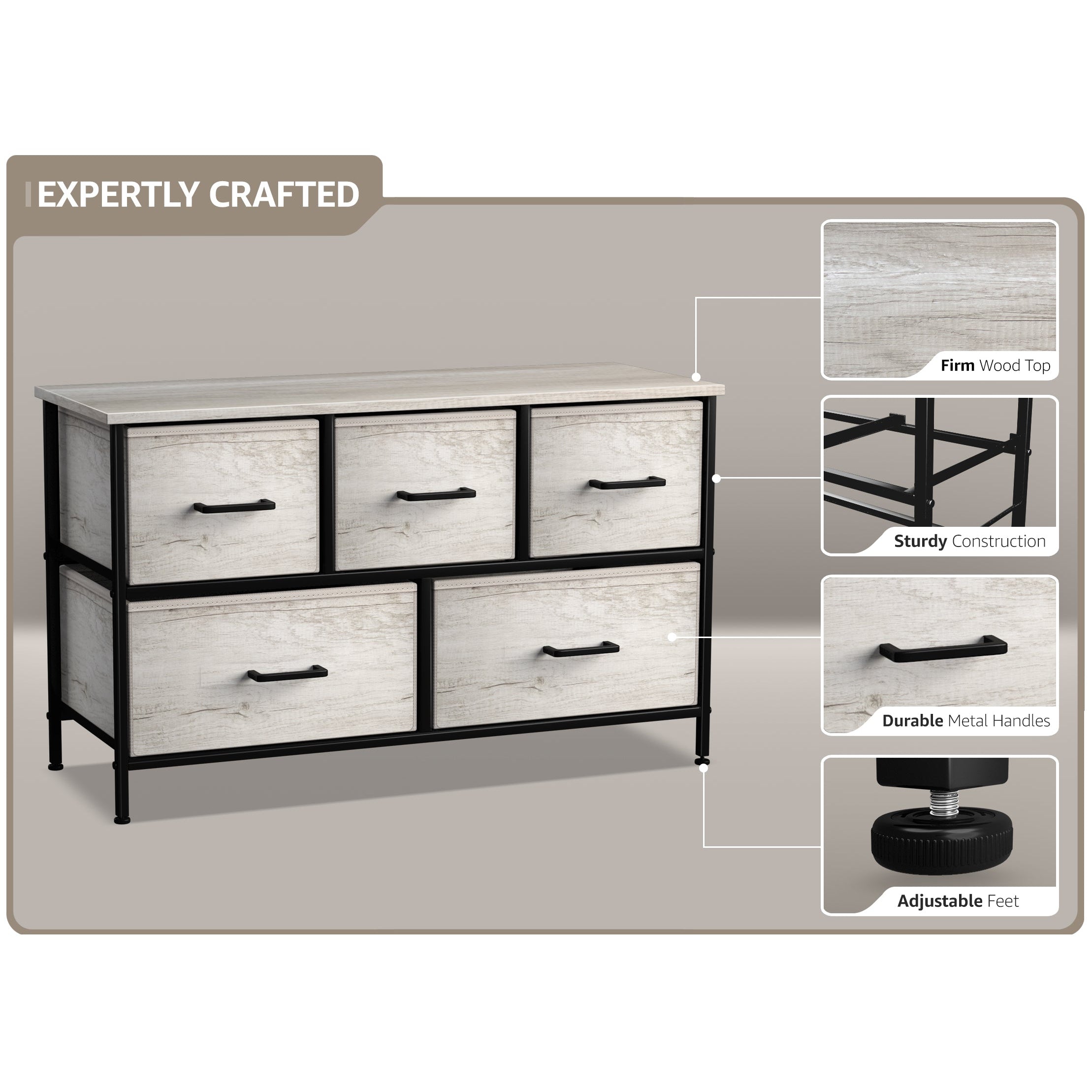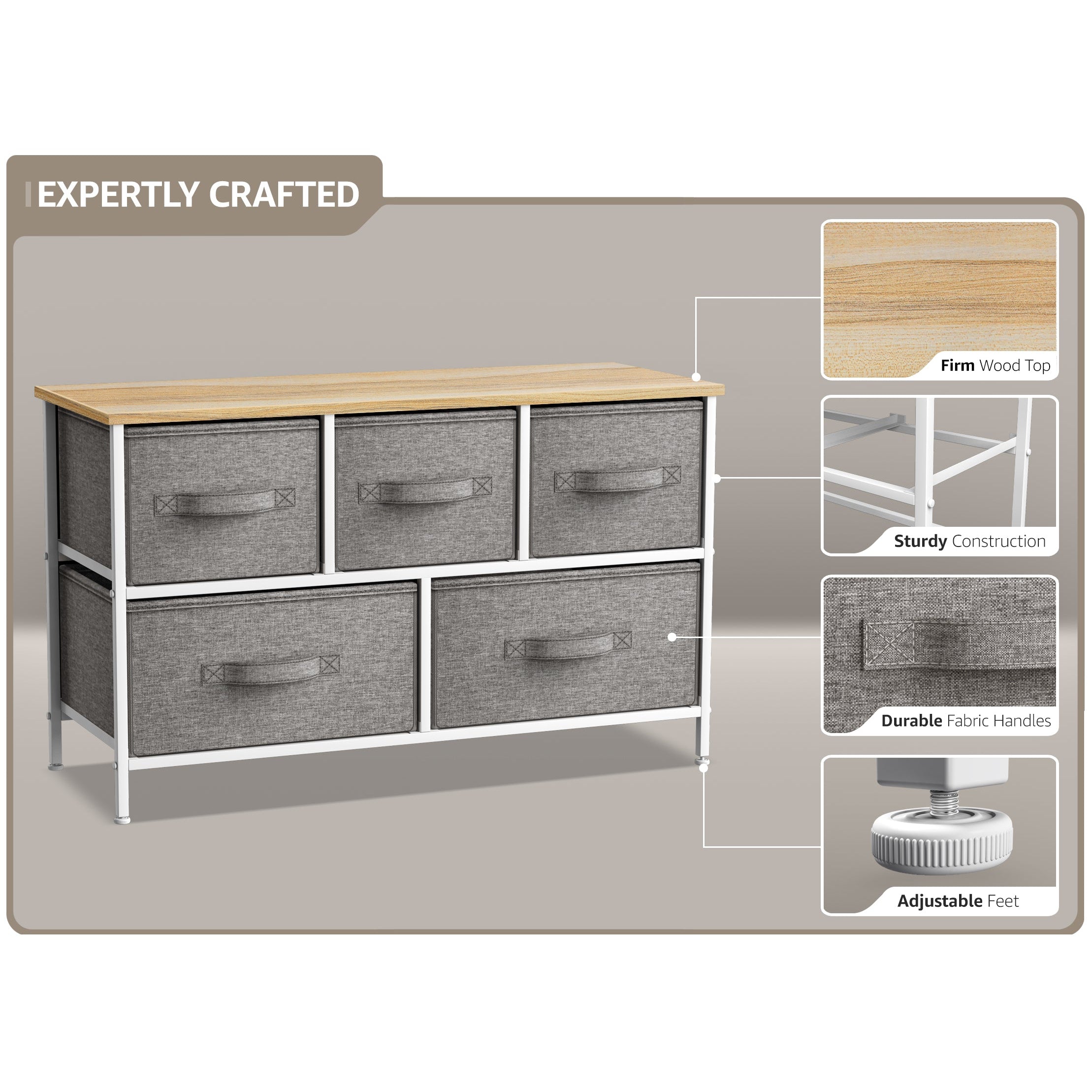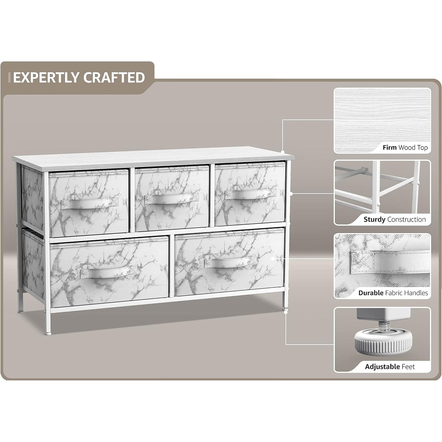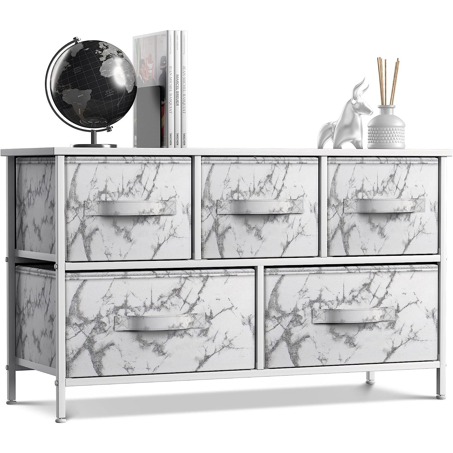 Give your household essentials a cozy landing spot with the Sorbus 5-Drawer Dresser. This wide dresser chest features a tabletop surface and pull-out drawers to tuck away household clutter. The thoughtful design is great for small living spaces and works equally well near the bed or sofa. Organization enthusiasts will enjoy filling each drawer with clothing, linens, and knick-knicks from around the home. The lightweight frame makes this unit easy to transport and when not in use, simply dissemble the frame and fold the fabric drawers flat for storage. Use alone as a single unit or pair with matching styles from the Sorbus Furniture Collection.