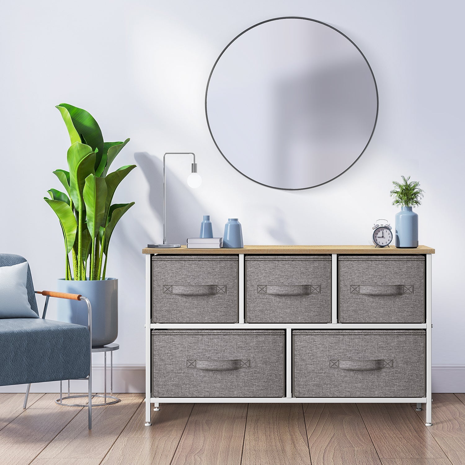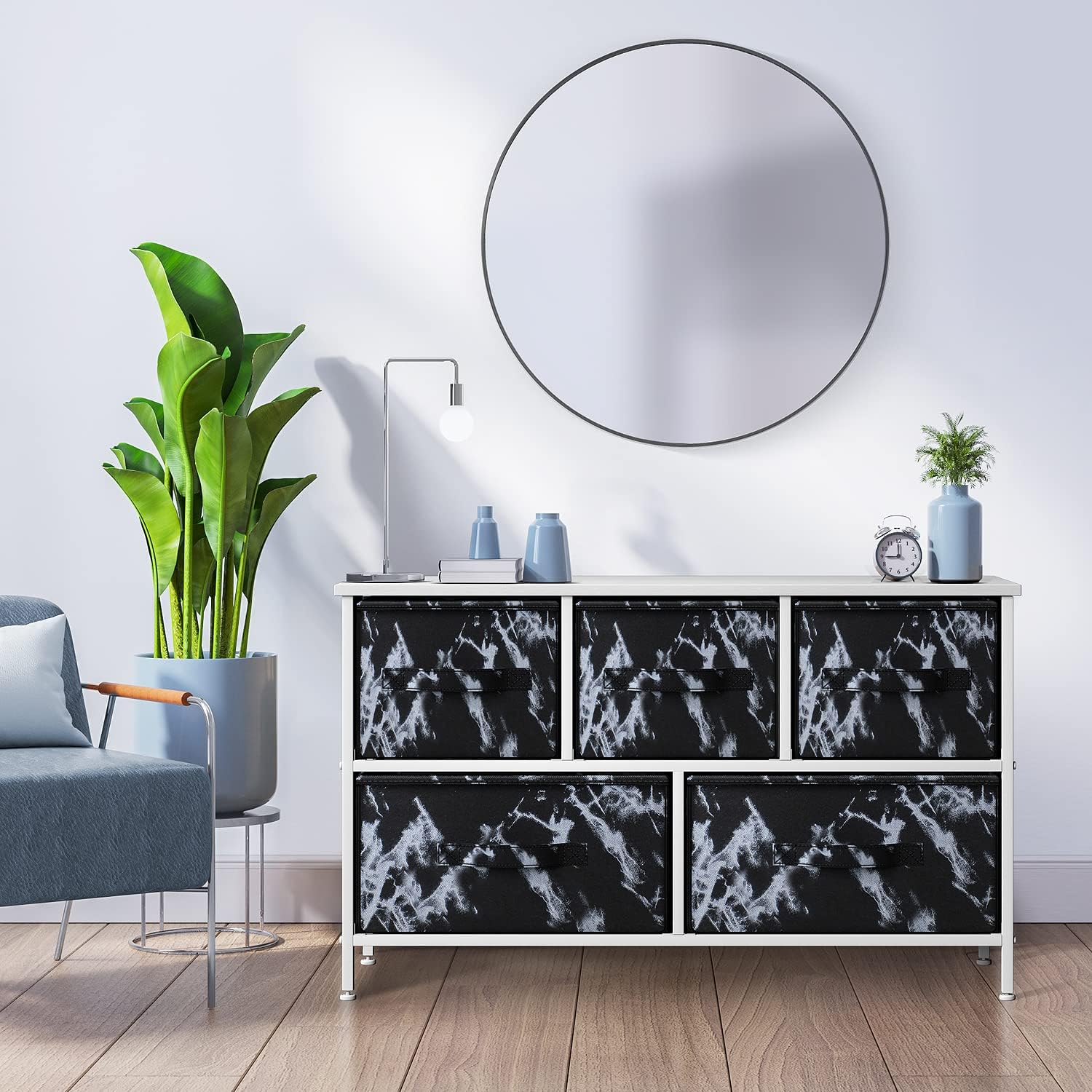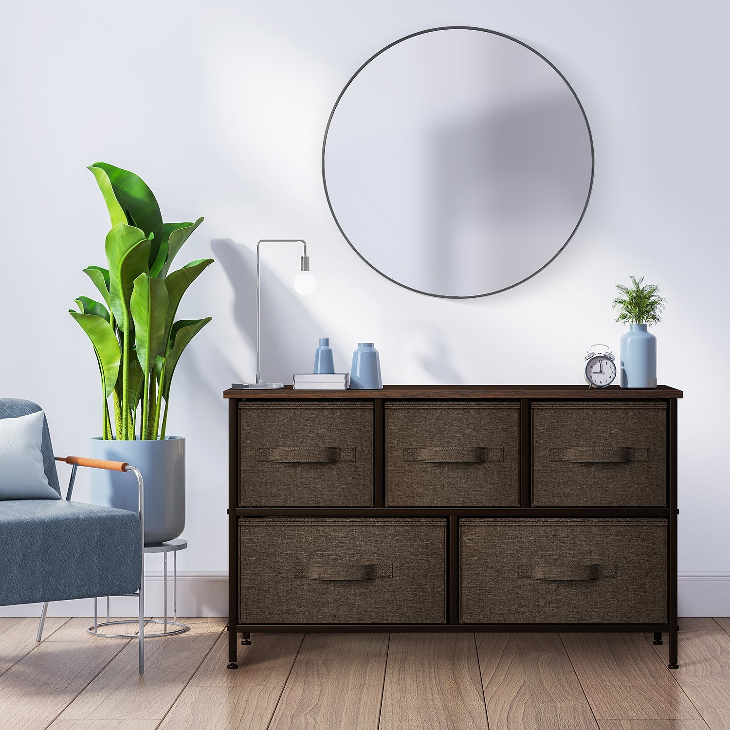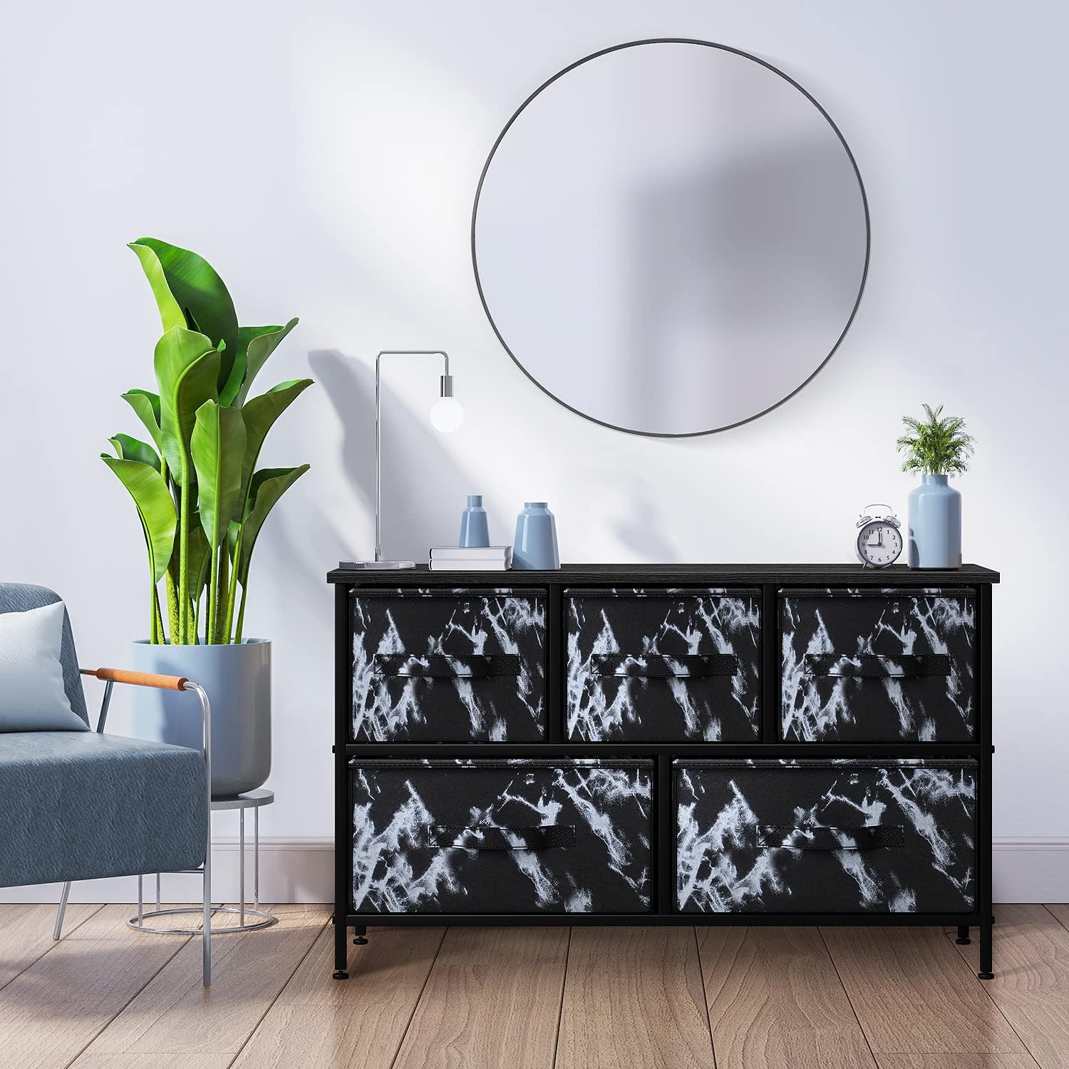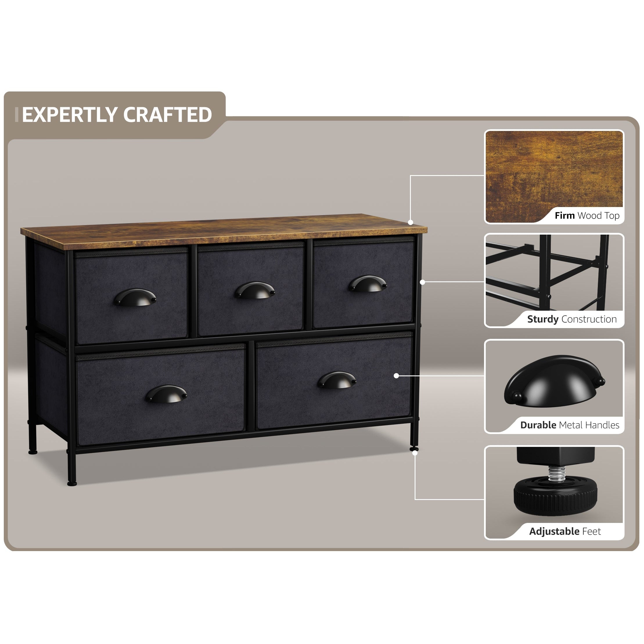Give your household essentials a cozy landing spot with the Sorbus 5-Drawer Dresser. This wide dresser chest features a tabletop surface and pull-out drawers to tuck away household clutter. The thoughtful design is great for small living spaces and works equally well near the bed or sofa. Organization enthusiasts will enjoy filling each drawer with clothing, linens, and knick-knicks from around the home. The lightweight frame makes this unit easy to transport and when not in use, simply dissemble the frame and fold the fabric drawers flat for storage. Use alone as a single unit or pair with matching styles from the Sorbus Furniture Collection.