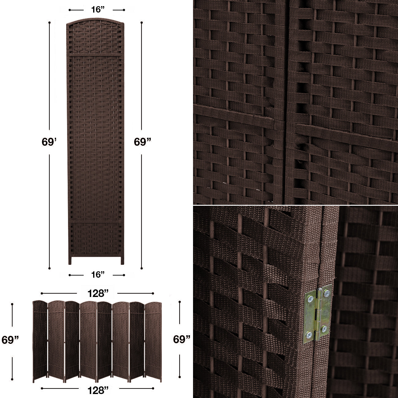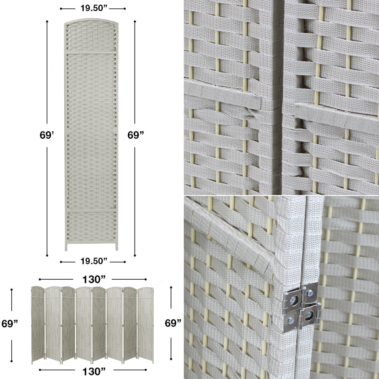 4 Panel - Equipped with 4 double hinged panels and measuring 6 ft. tall, this room divider is extra wide for maximum coverage. Each panel measures 16.5 inches - When fully extended, the partition room divider measures 69 x 4.25 x 69 in -