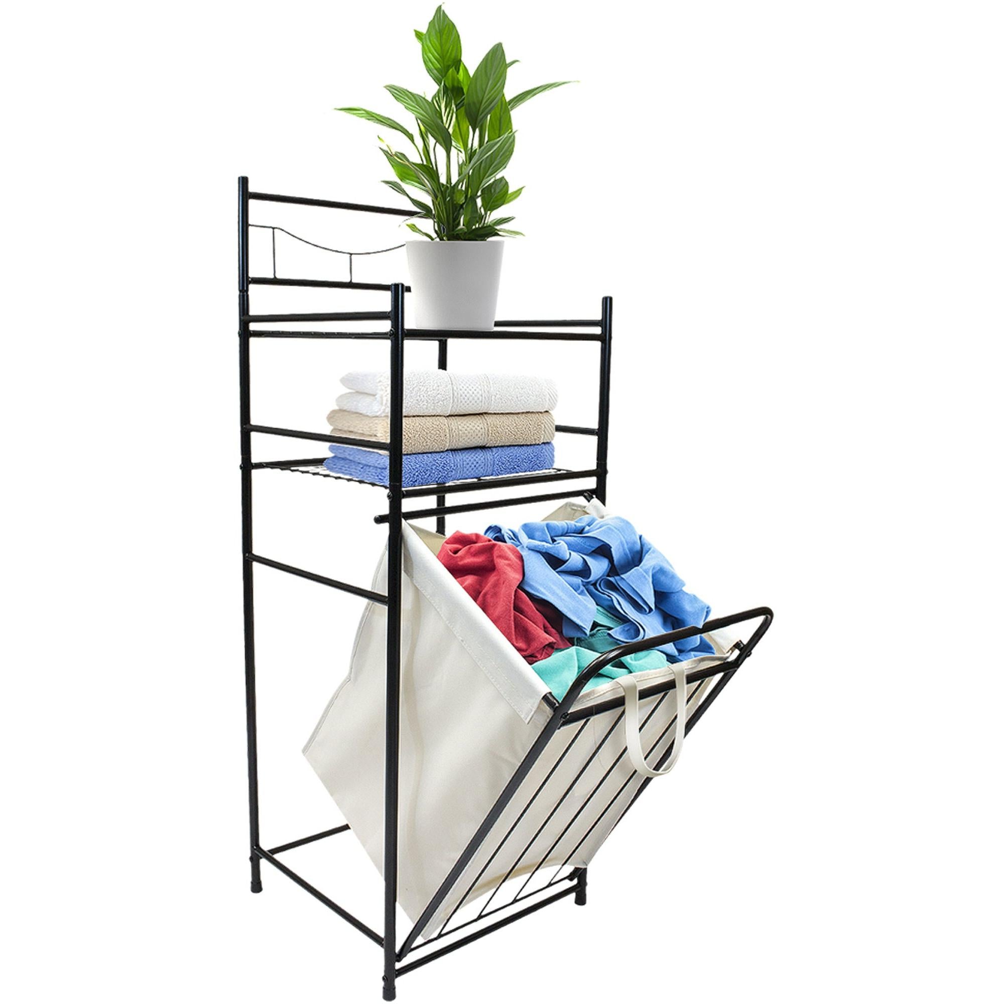 The Sorbus Bathroom Tower Shelf Hamper makes laundry chores simple and convenient. It features 2 shelves for household items and a removable hamper to keep dirty laundry a disguise! With a convenient slatted front, it tilts forward to quickly store and retrieve laundry. When you're ready to move your pile to the washer, simply detach the hamper and use the carry handles for grab-and-go transporting. The laundry compartment holds a single load and keeps clothes, linens, towels, and more off the floor and organized. Now you can get a head start on your laundry chores and take a load off! The hamper shelf provides style and function in the bathroom, laundry room, closet, or anywhere storage is needed.