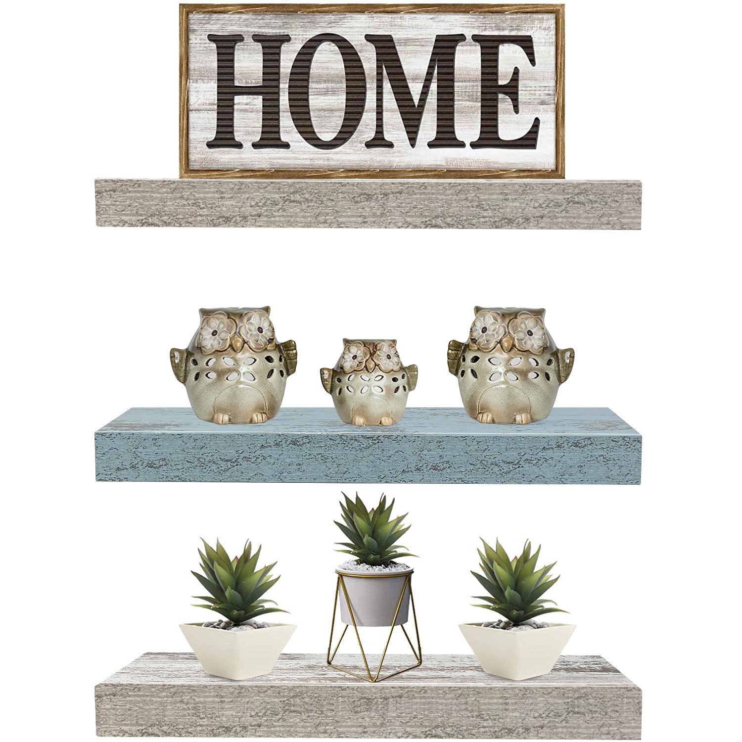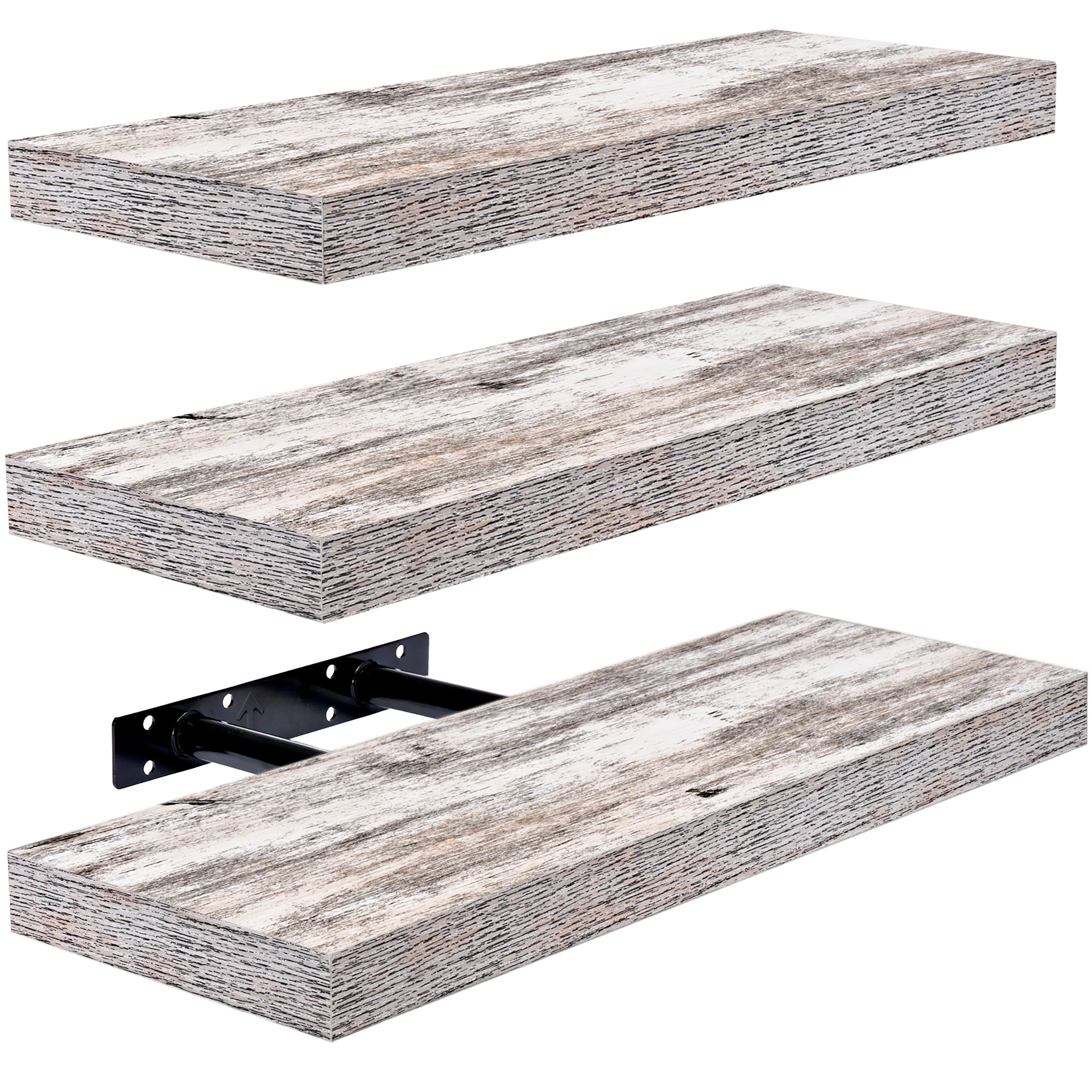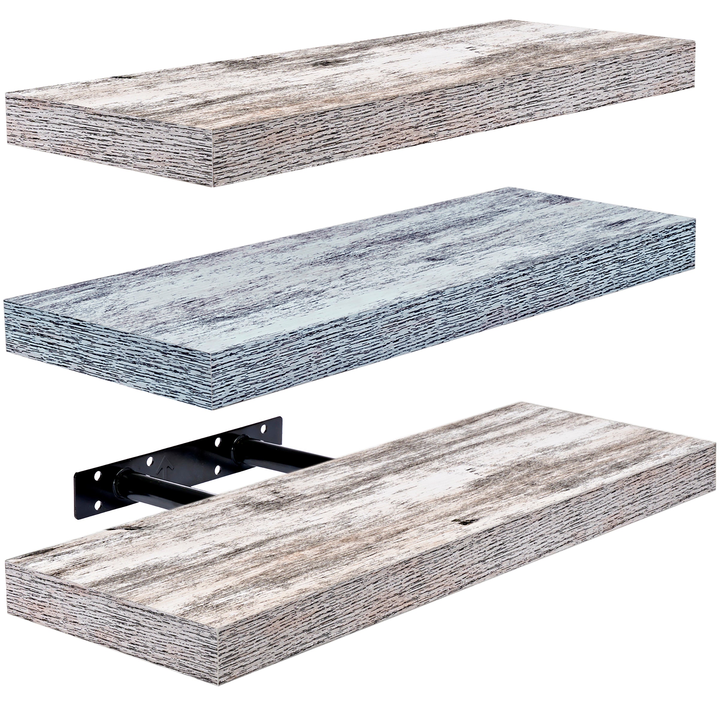 Part rustic, part coastal, this floating shelf trio is the perfect platform for storage and display. It features a rectangle silhouette with a faux wood finish, ideal for showcasing framed photos, succulents, and other home decor. Beautifully accent in your beach home, shabby chic themed space, or modern farmhouse living area. Installation is easy with the included mounting hardware. Hang on an empty wall above a desk, fireplace, between windows, or wherever you need visual interest