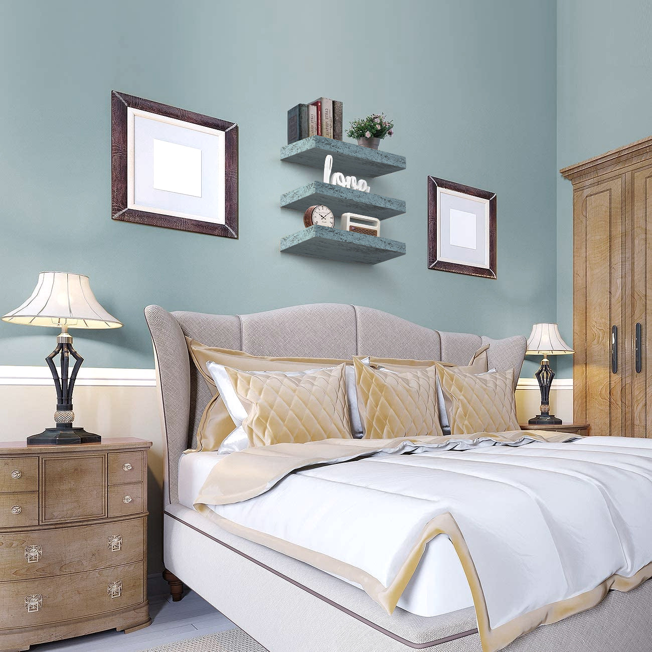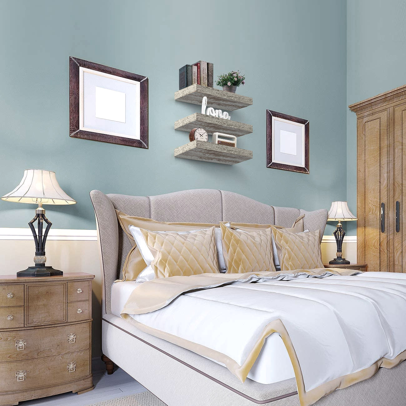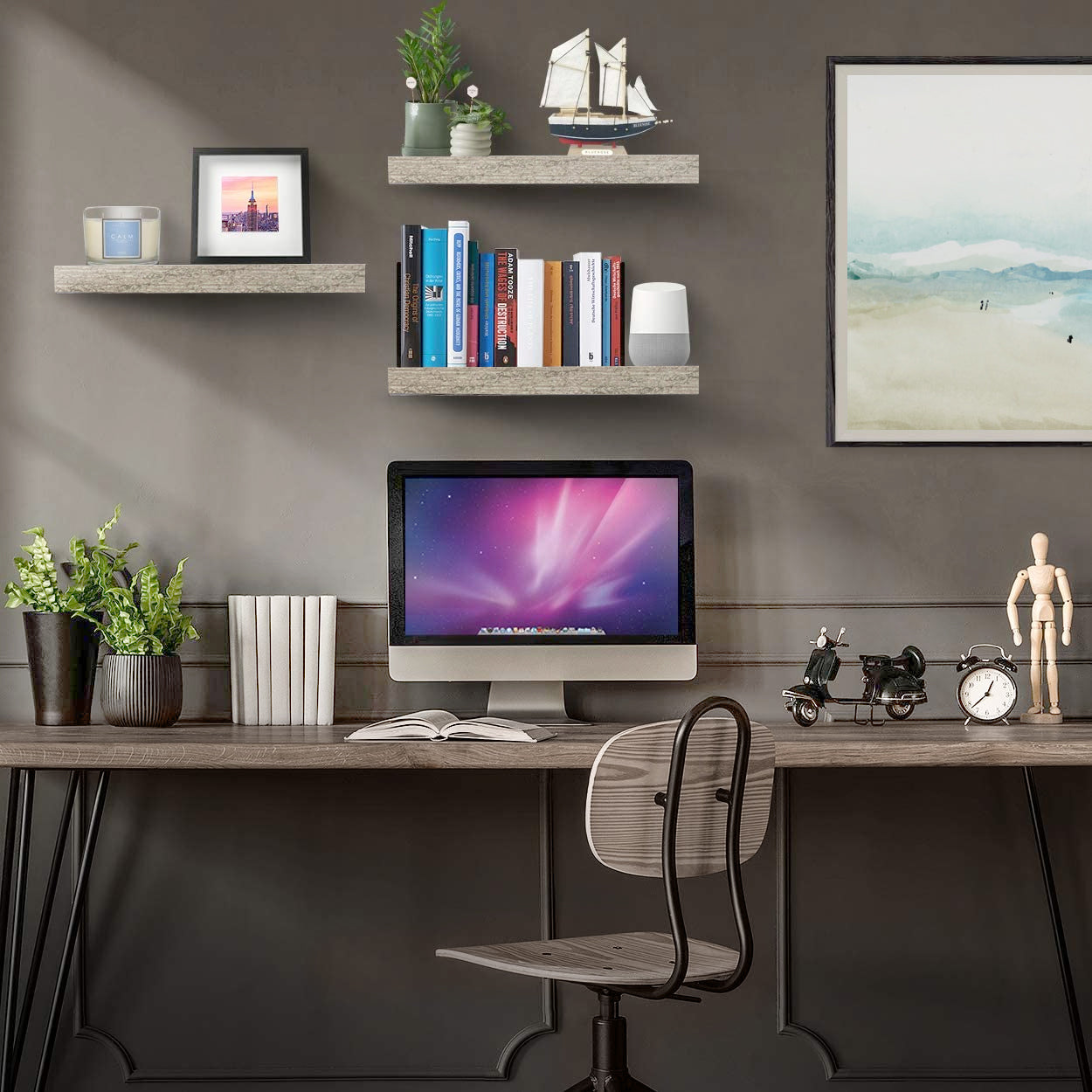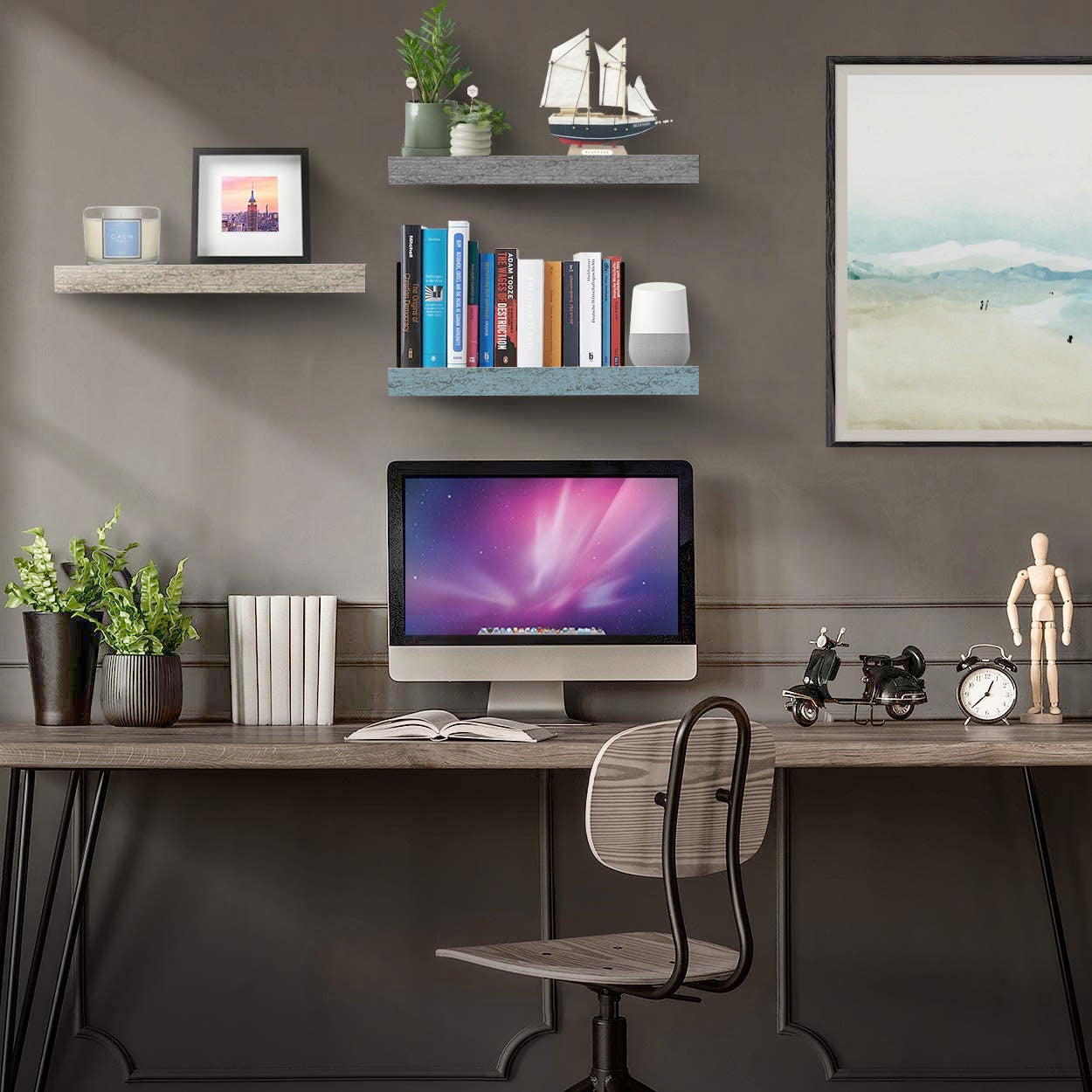 Part rustic, part coastal, this floating shelf trio is the perfect platform for storage and display. It features a rectangle silhouette with a faux wood finish, ideal for showcasing framed photos, succulents, and other home decor. Beautifully accent in your beach home, shabby chic themed space, or modern farmhouse living area. Installation is easy with the included mounting hardware. Hang on an empty wall above a desk, fireplace, between windows, or wherever you need visual interest