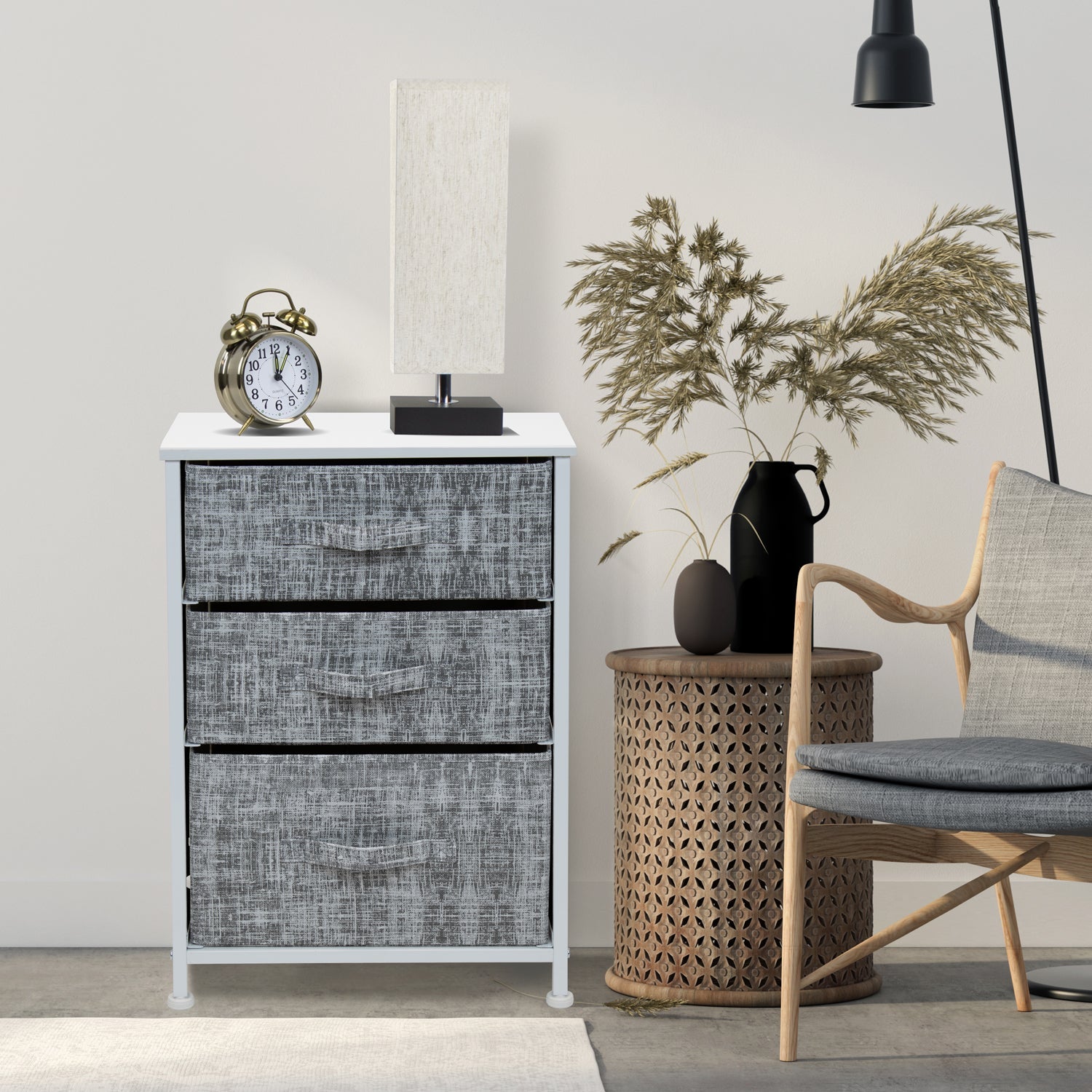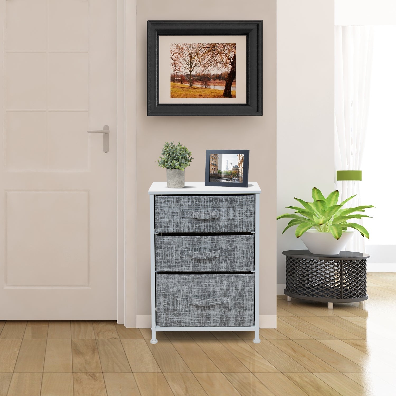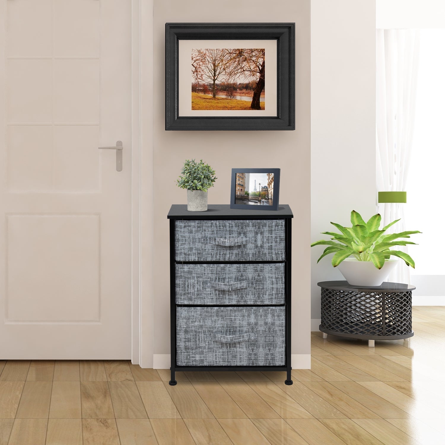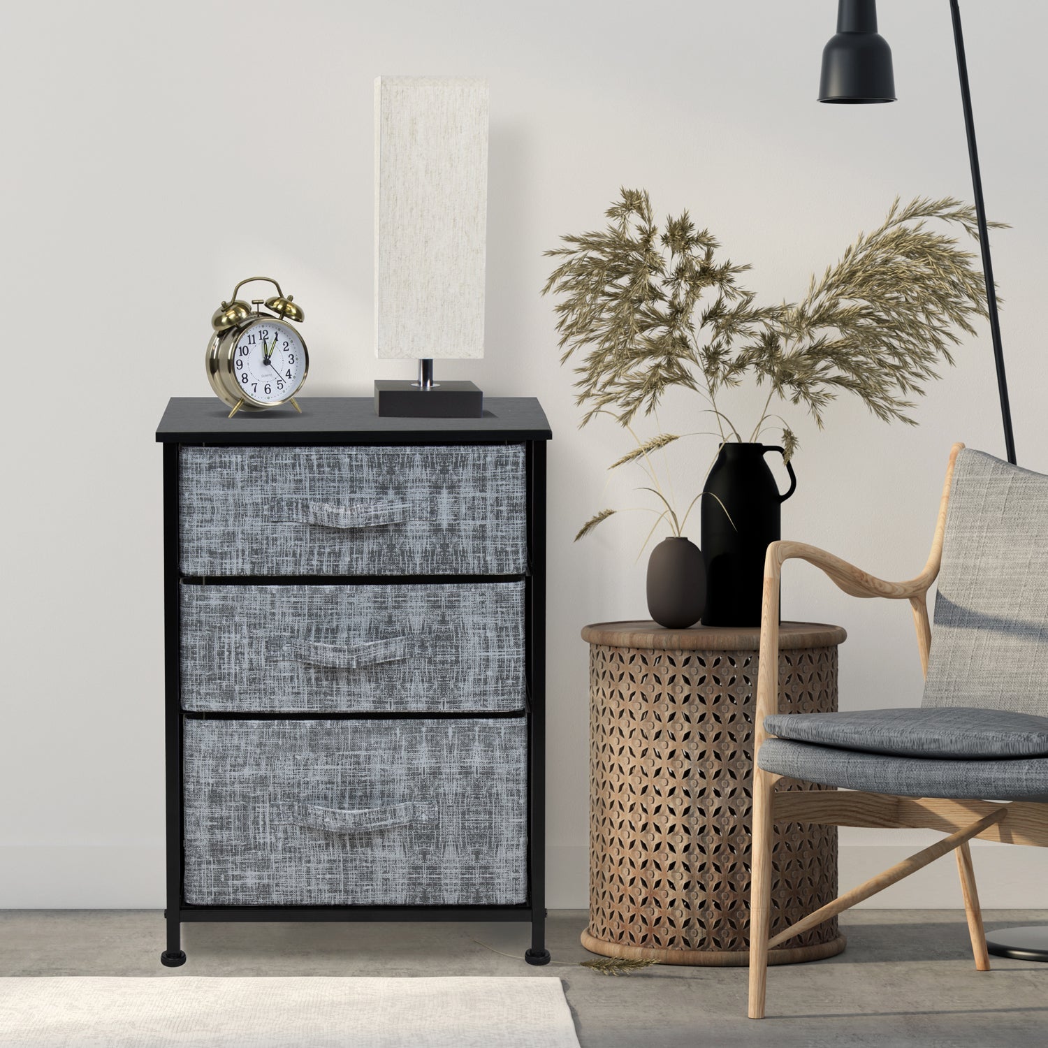 Give your bedside essentials a cozy landing spot with our 3-Drawer Nightstand. This beautiful chest features a tabletop surface and pull-out drawers to tuck away household clutter. The thoughtful design is compact for small living spaces and works equally well by the bed or sofa. Store anything from books, reading glasses, alarm clocks, and other knickknacks. The lightweight frame makes this unit easy to transport around the home and when not in use, simply fold the fabric drawers flat for storage. Use alone as a single nightstand or pair with any drawer configuration from the Sorbus Furniture Collection.