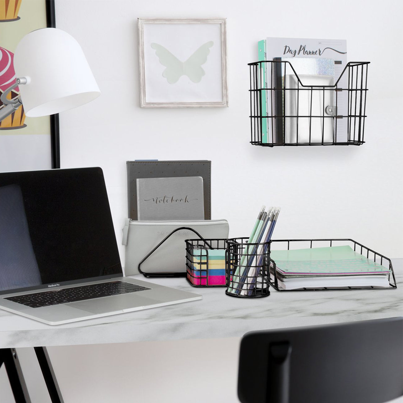 This trendy desk collection features a pencil cup holder, letter sorter divider, hanging file organizer, letter tray, and sticky note holder to de-clutter your workstation. It keeps everything from papers, files, writing tools, and mail to your favorite notebooks, folders, and magazines neatly organized. As a bonus, the hanging file organizer can be used on your desk or mounted to the wall to free up space. With a sleek aesthetic, this organizer set brings a modern twist to even the most mundane tasks! Quickly jot your to-do lists, organize messages, bills, and stationary, or simply keep documents in place until your next meeting. From the home to the office, this set de-clutters your desktop with style and efficiency.