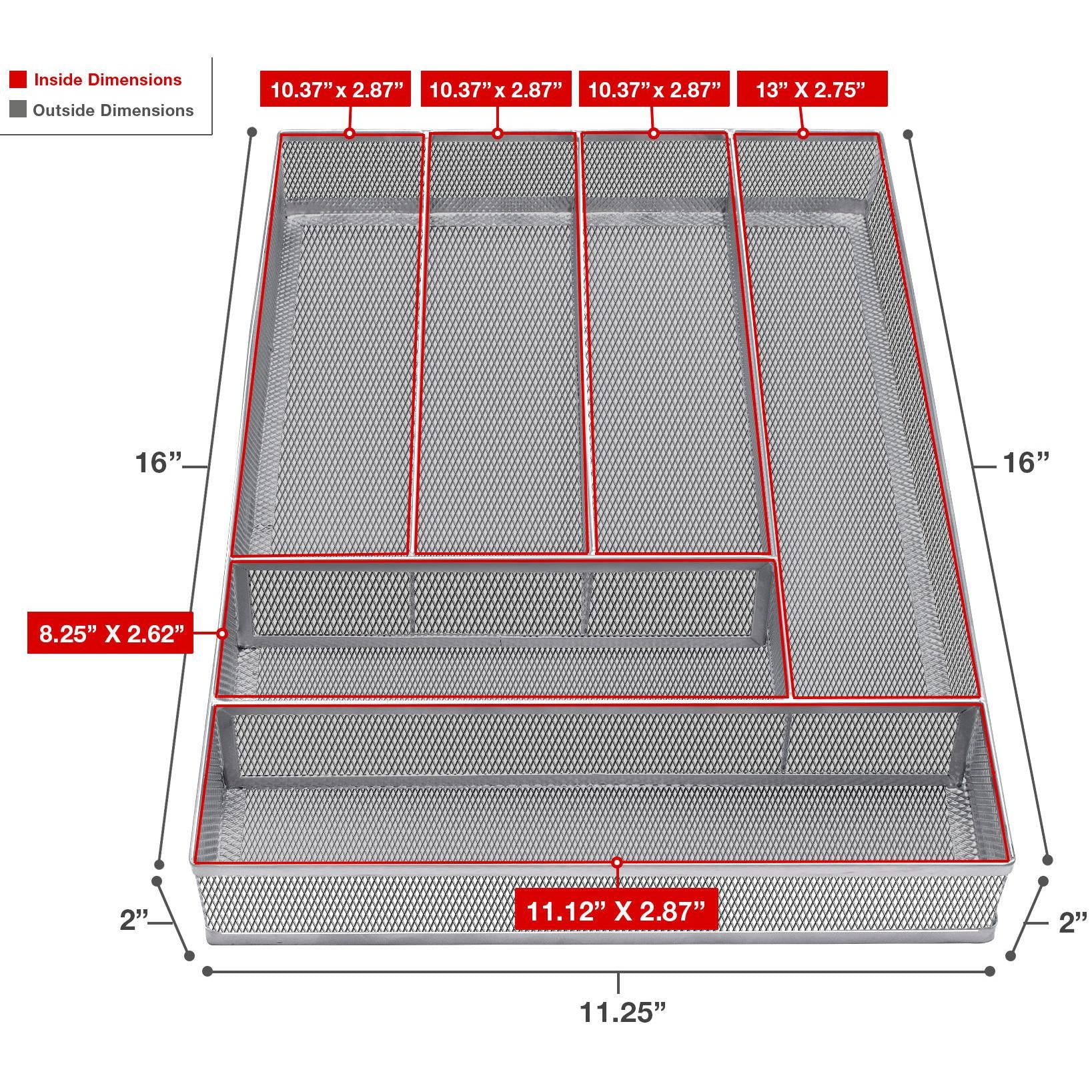 Tired of overflowing kitchen drawers? Keep your kitchen tools neatly arranged with the Sorbus® Cutlery Tray Organizer! This non-slip cutlery tray features six divided sections for a variety of silverware and serving utensils. The shorter sections are great for forks, knives, spoons, and more while the longer sections fit oversized tools like spatulas, whisks, and rolling pins. From beginner cook to gourmet chef, this tray keeps drawers organized and ready for the next meal. For multi-purpose use, slide this mesh tray inside desk or bathroom counter drawers for office supplies and bath toiletries. With divided sections, you'll avoid the common clutter and see everything at a glance.