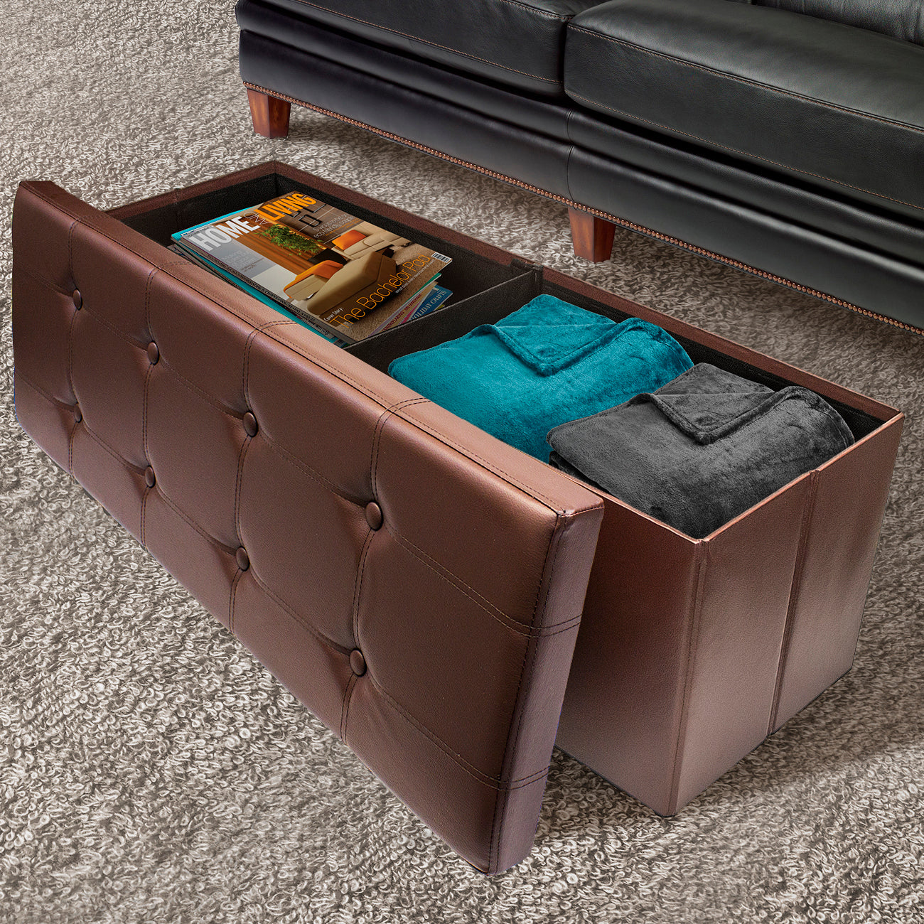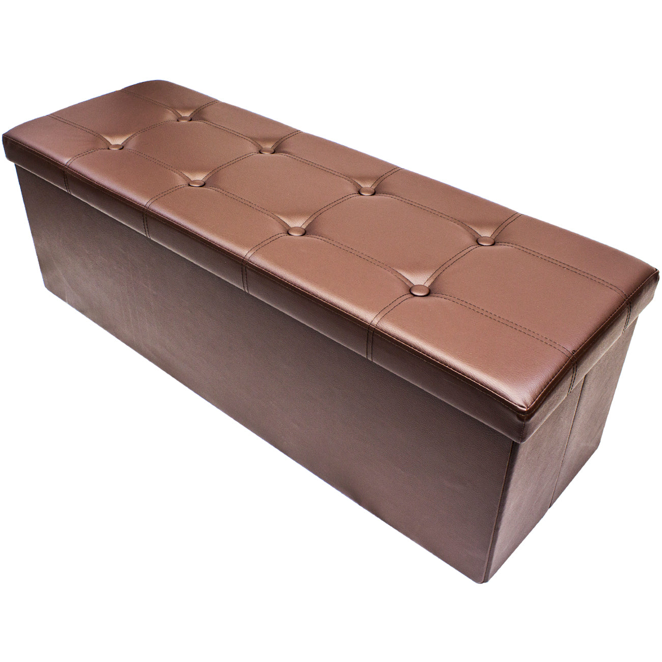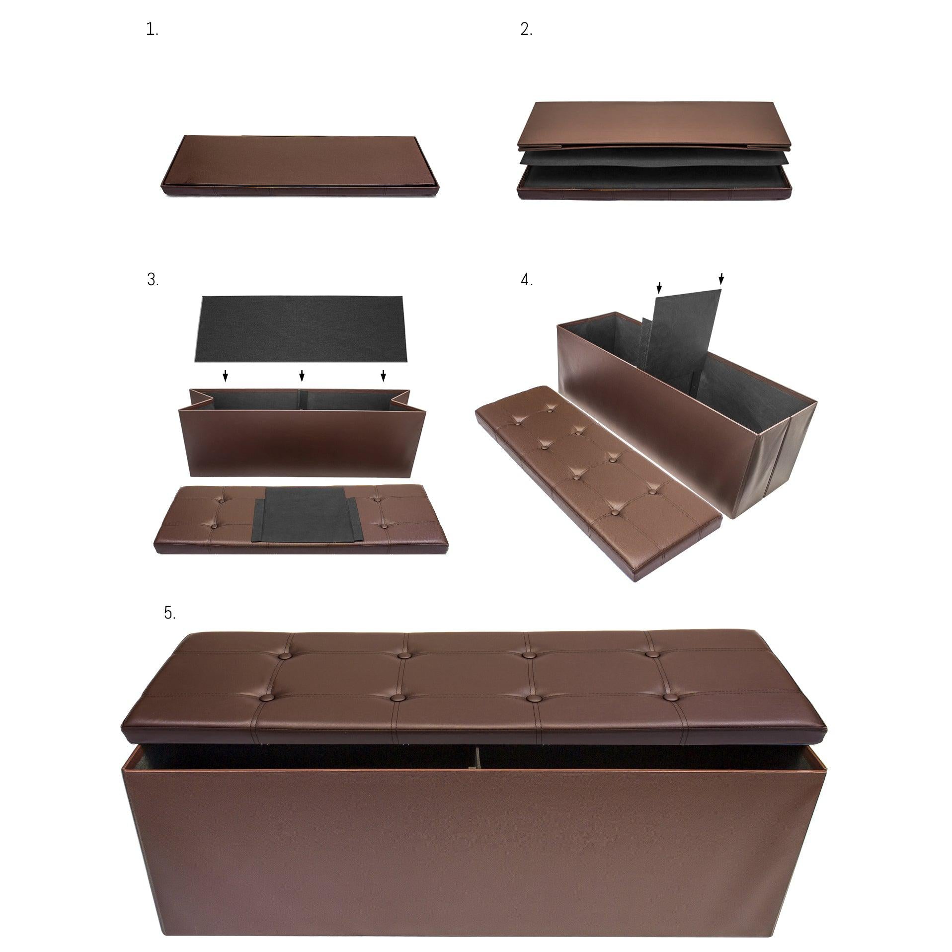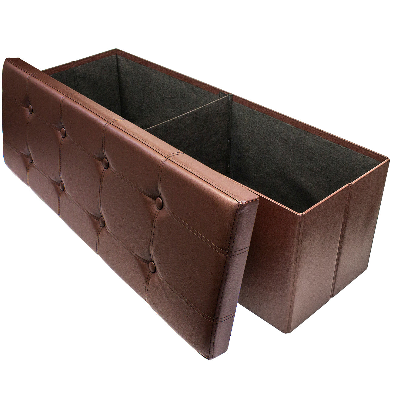 The Sorbus Storage Bench Chest is an attractive accent piece and functional storage compartment. Finely crafted with superior faux leather, this multi-purpose bench features cushioned padding for seating, meticulous top stitching, and classic button-tufting details. For storage, use it to stow small pillows, blankets, magazines, clothes, crafts, linens, and more. The standout design doubles as a pouf ottoman in front of the sofa or to replace the traditional toy box in the playroom. To use, simply lift the lid on the storage bench to stow or retrieve items. When not in use, simply fold the entire unit flat for easy storage. Keep in your home, office, or college dorm for stylish organization.