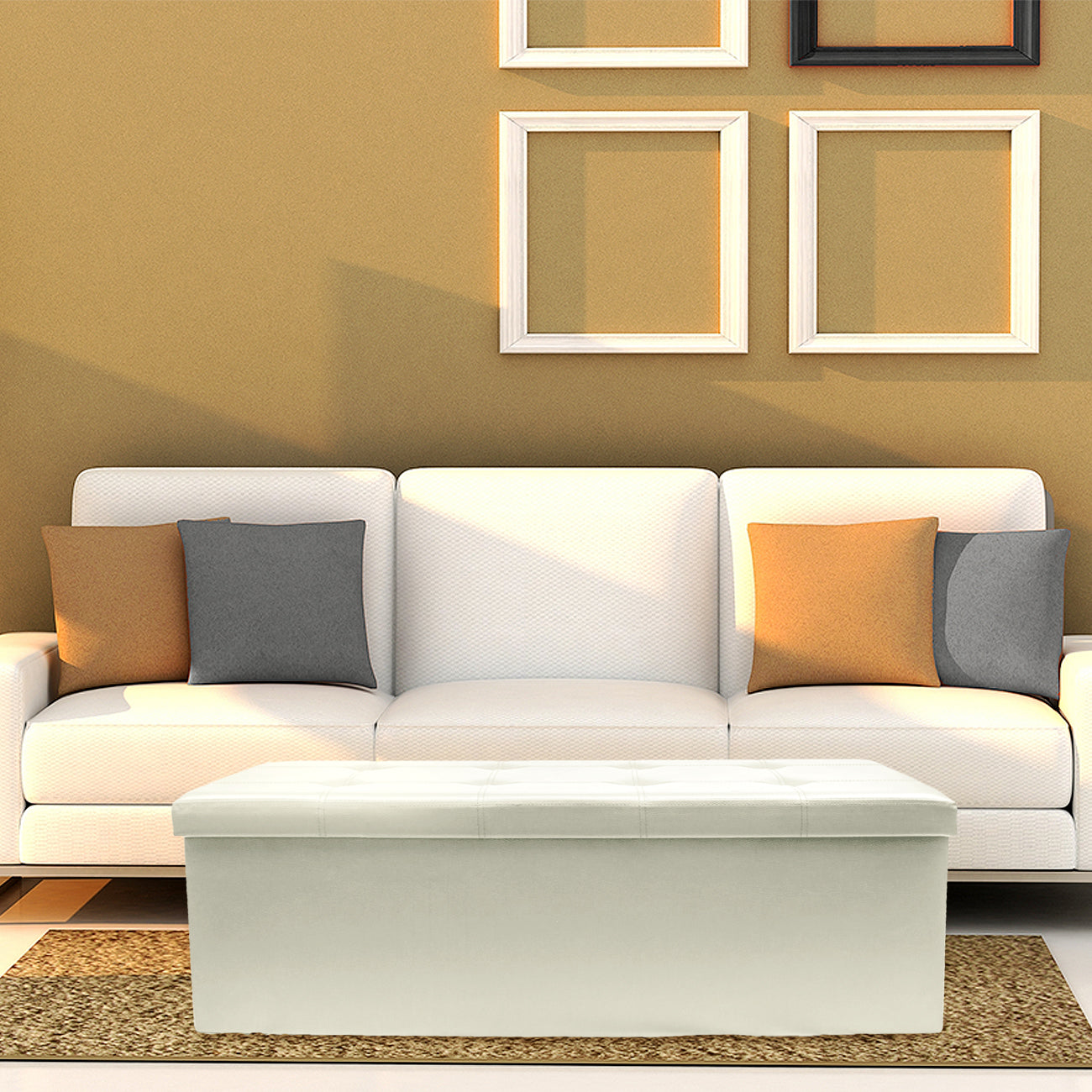 - Sleek rectangular design for storage and seating