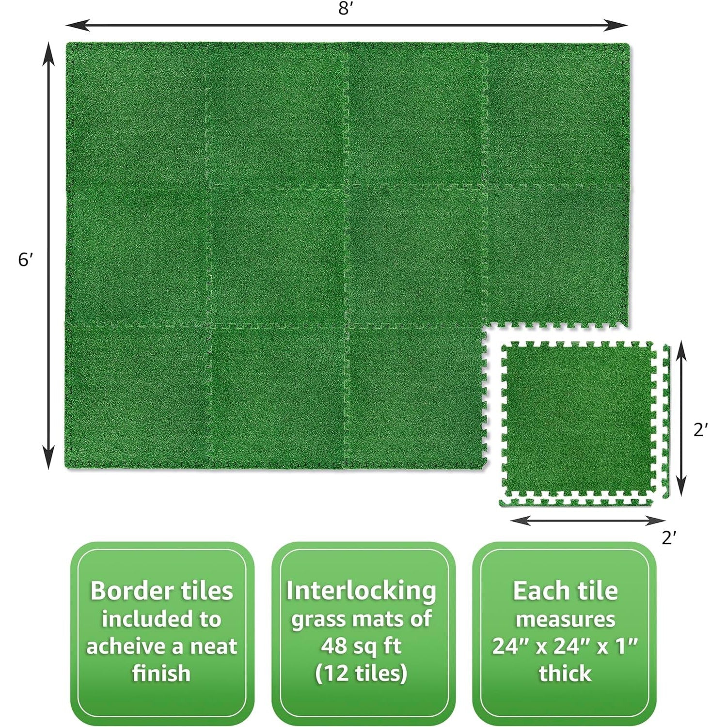 - Set of 24 covers a total of 96 Sq ft borders Included. Includes 24 puzzle interlocking grass tile pieces, suitable for your indoor/outdoor space