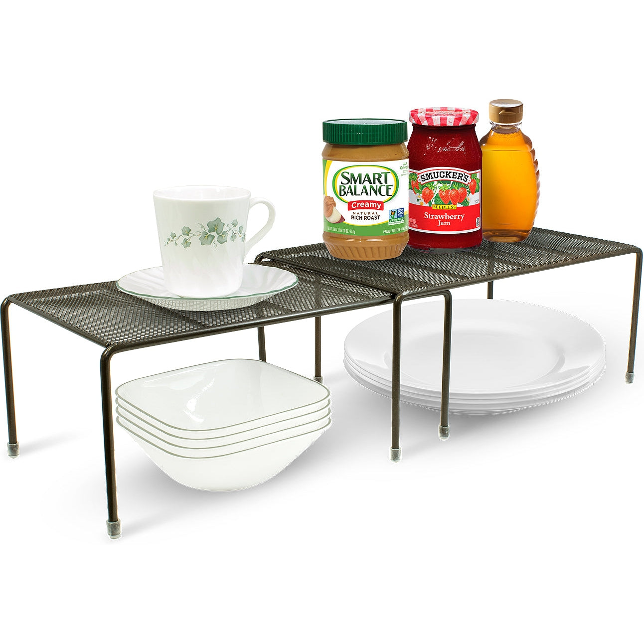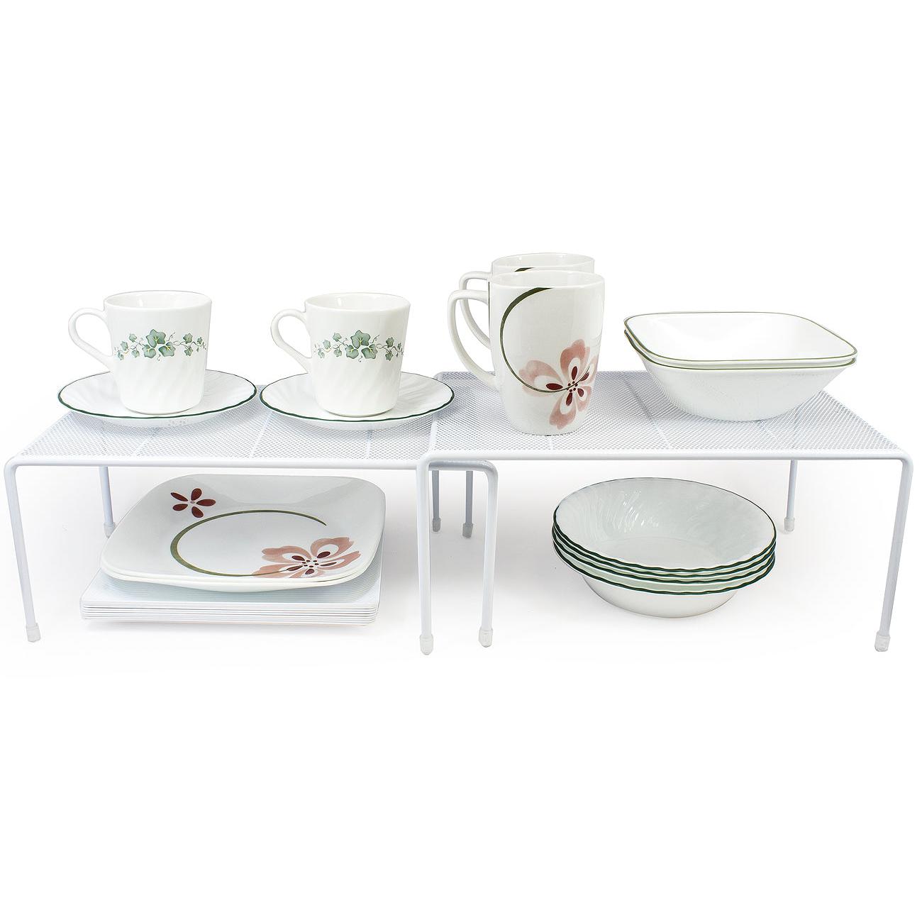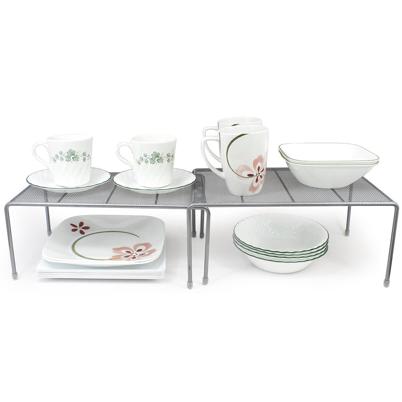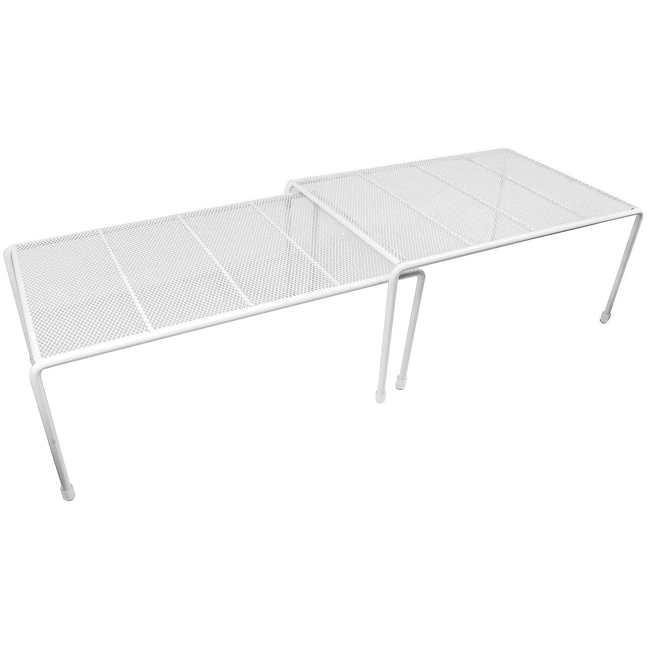 Maximize your cabinet space with the Sorbus Pantry Shelf Organizers. This set of 2 features a flat perforated surface and steel finish. For convenience, the smaller shelf stacks beneath the medium shelf and expands to instantly create more storage. It's ideal for organizing all your dishware, kitchen accessories, canned goods, and more! Store inside cabinets, on pantry shelves, or place on countertops to quickly grab household items.