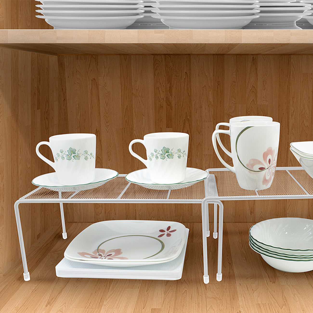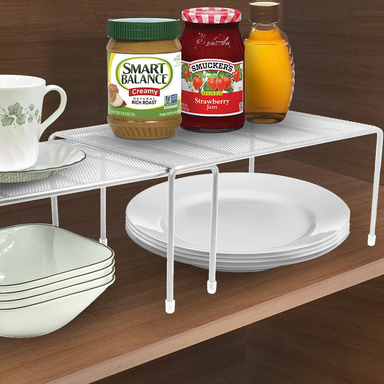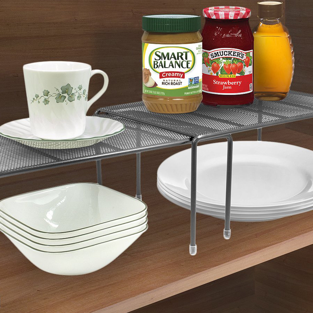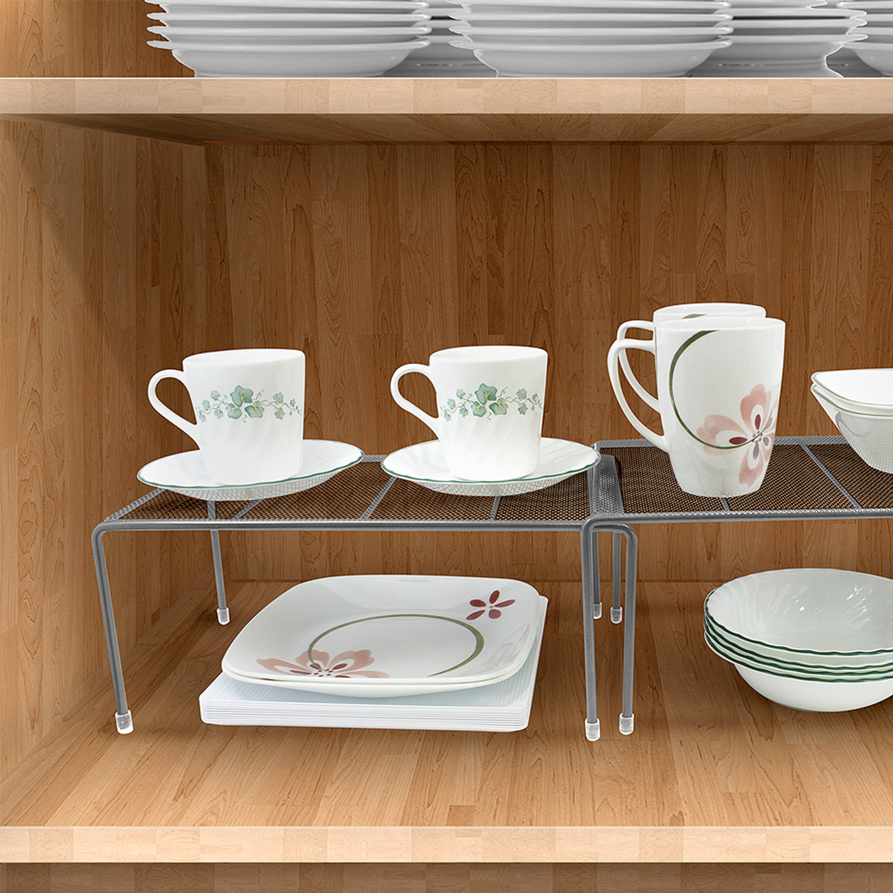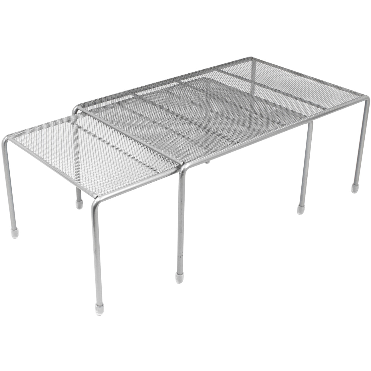 Maximize your cabinet space with the Sorbus Pantry Shelf Organizers. This set of 2 features a flat perforated surface and steel finish. For convenience, the smaller shelf stacks beneath the medium shelf and expands to instantly create more storage. It's ideal for organizing all your dishware, kitchen accessories, canned goods, and more! Store inside cabinets, on pantry shelves, or place on countertops to quickly grab household items.
