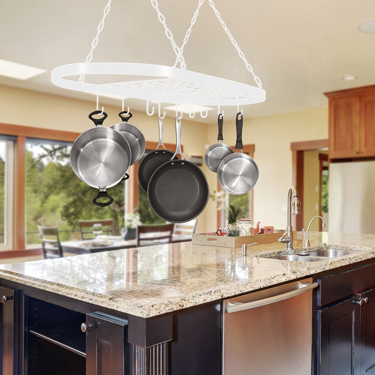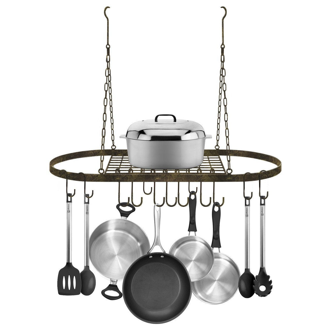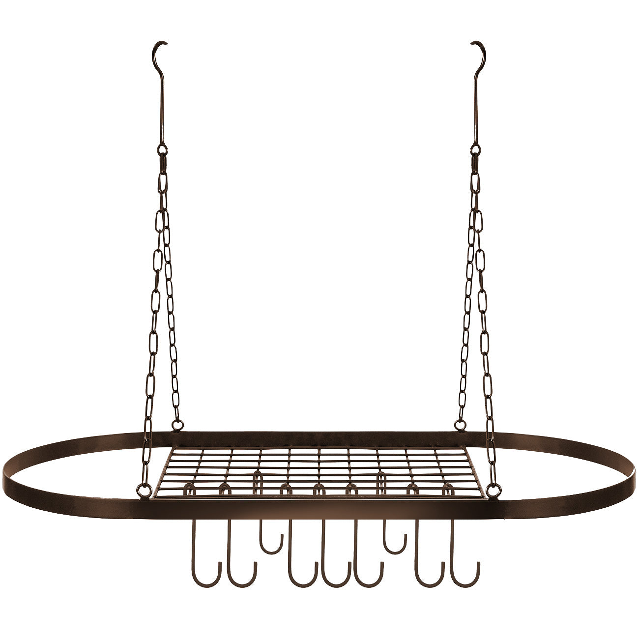 - Oval grid style pot rack with hanging chains and 10 hooks.