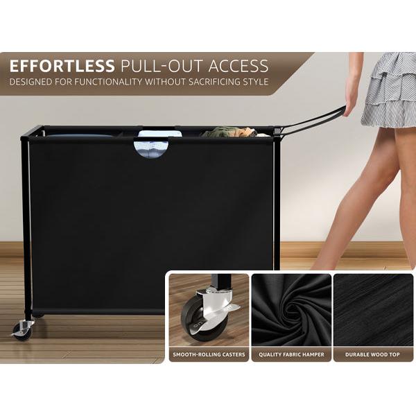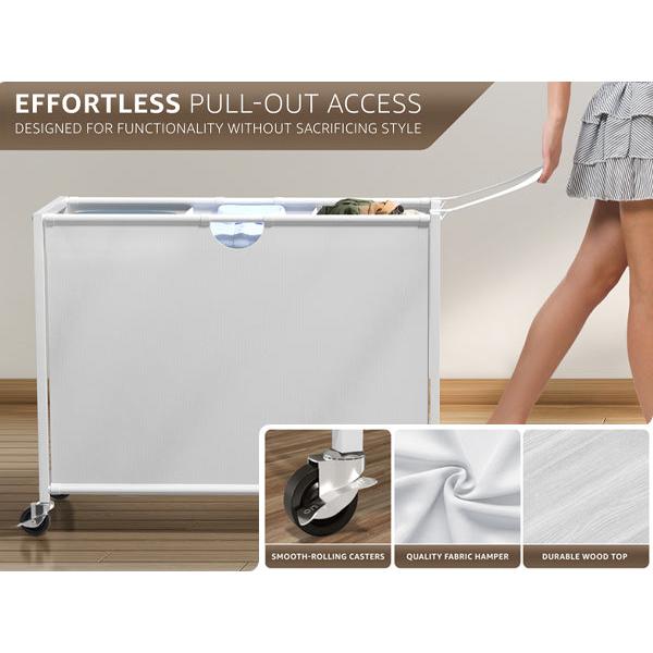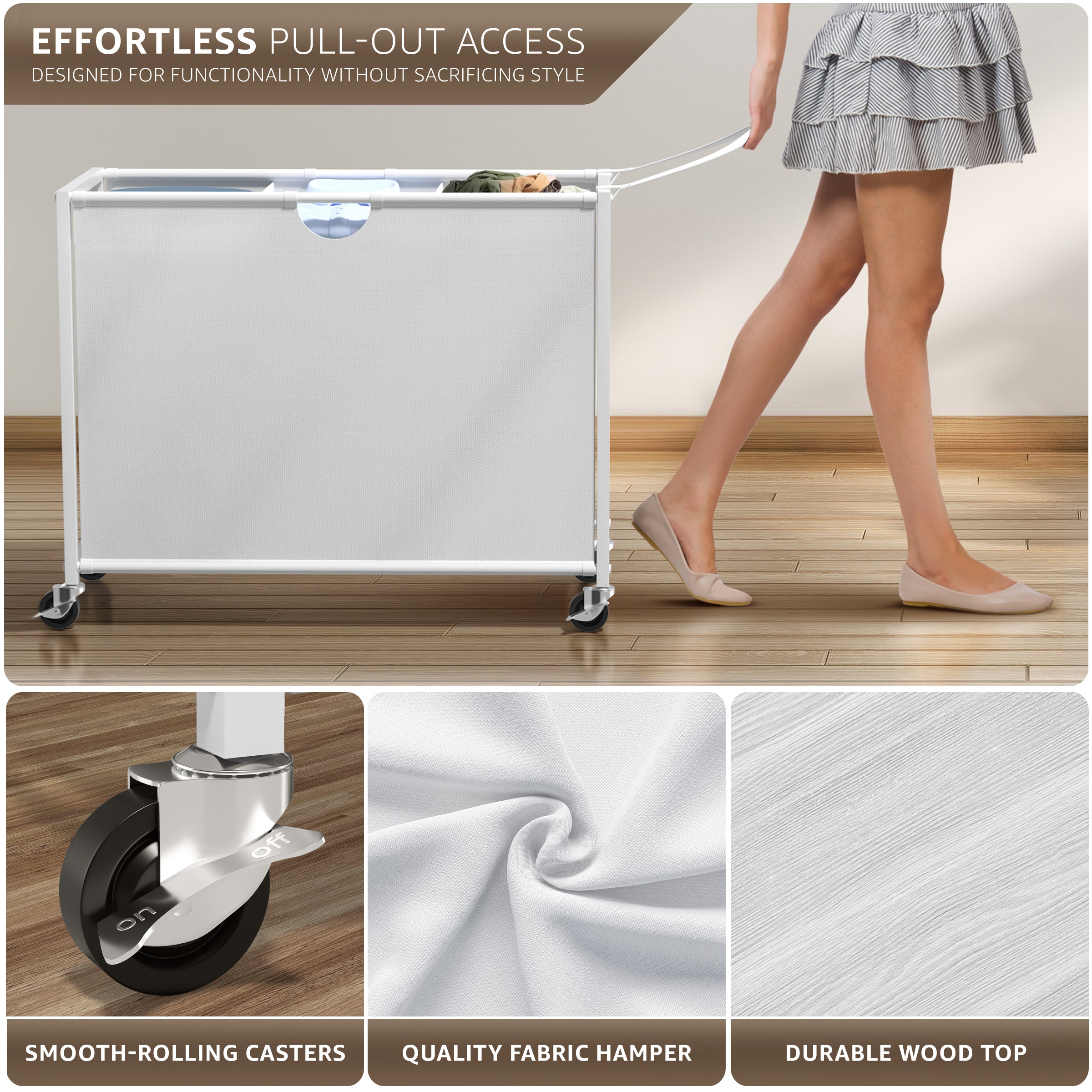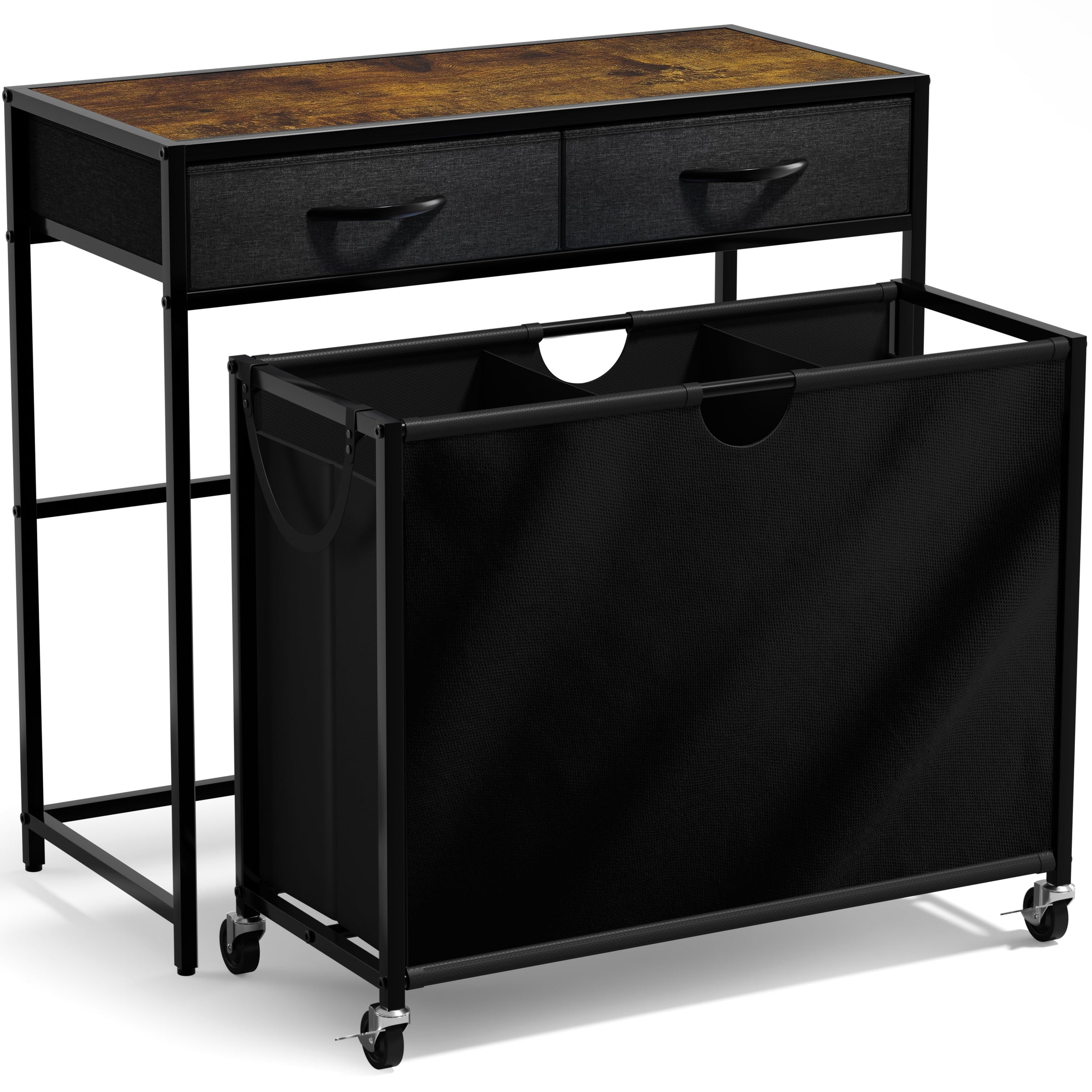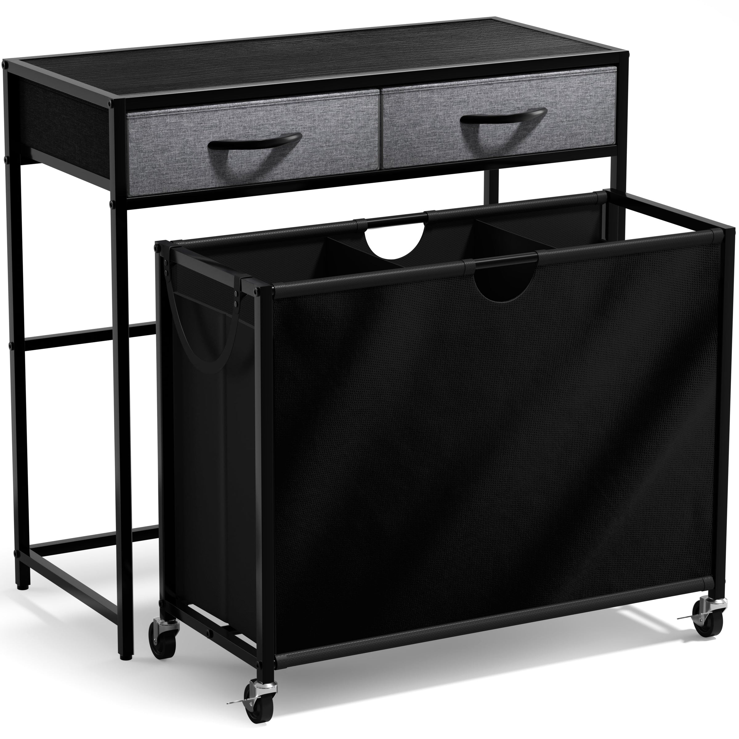 - Durable Quality Laundry Cart Hamper Construction: The laundry hamper dresser is made of a metal frame, a polyester pull-out hamper with fabric drawers, an MDF shelf top, and steel lockable caster wheels.