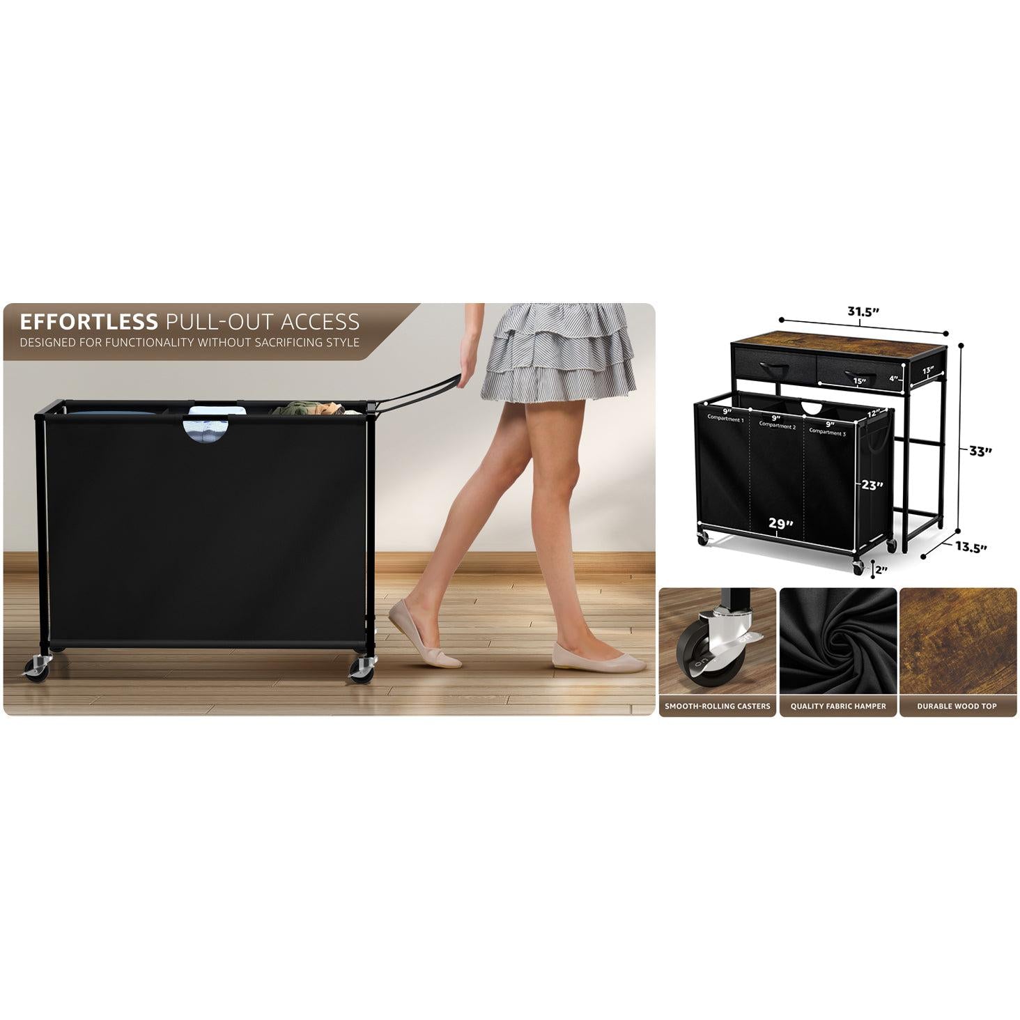 The Sorbus laundry cabinet features a metal frame and an MDF wood top with a spacious 3-compartment polyester laundry hamper bag that includes carry handles and lockable caster wheels. Ideal for storing detergent, fabric softeners, and other laundry essentials.