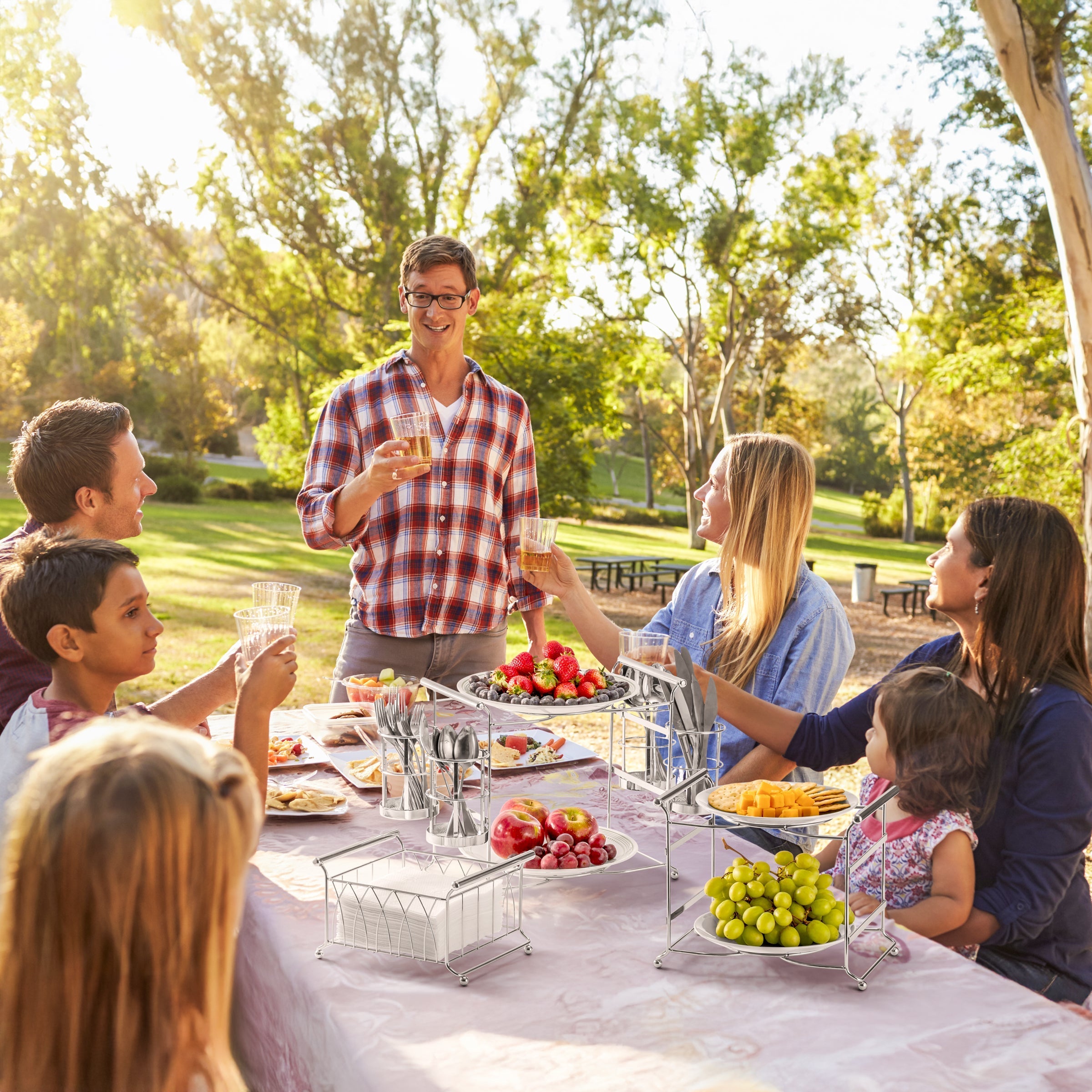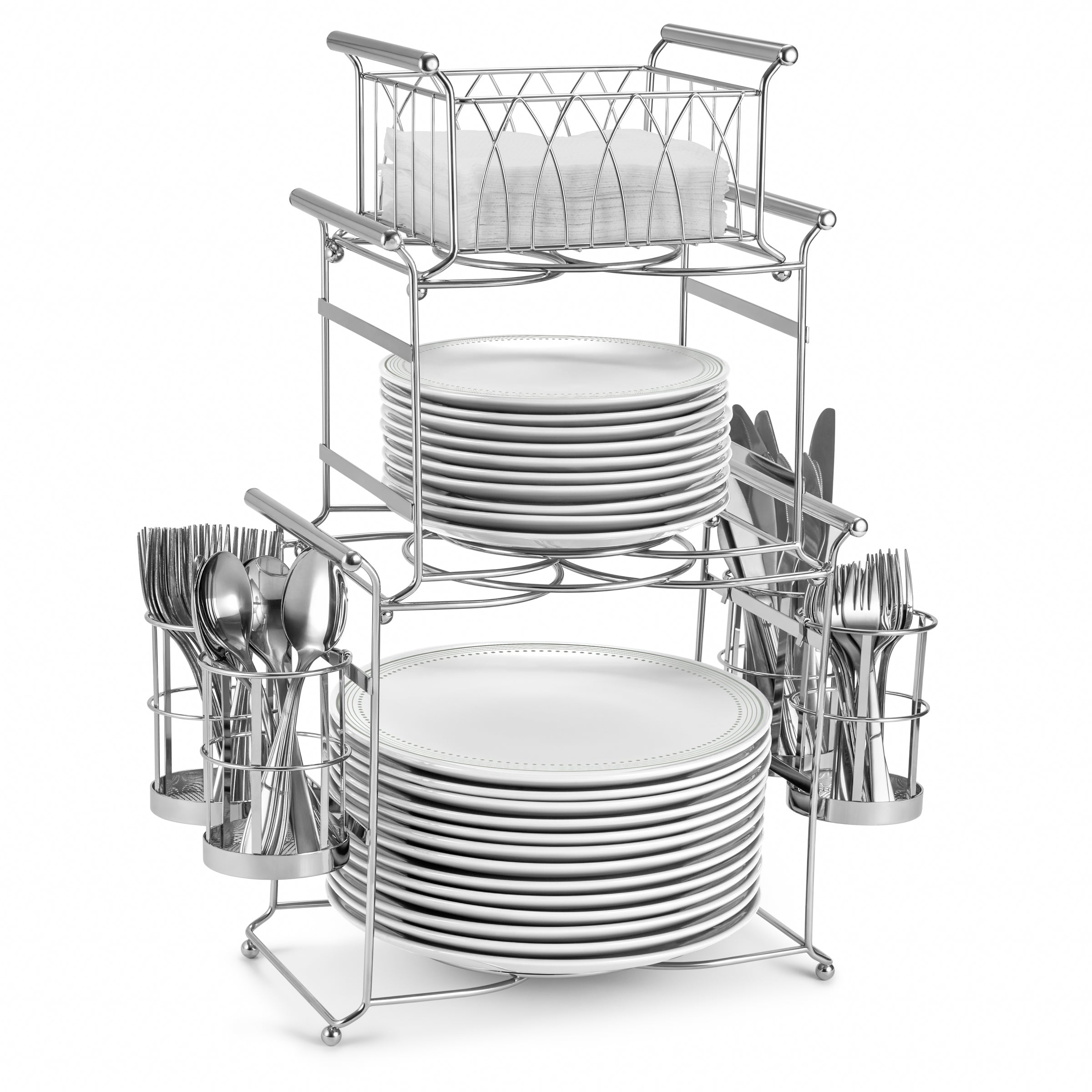When presentation is everything, serve guests in style with the Sorbus Buffet Caddy! Both elegant and functional, this 7-piece service station keeps dining essentials organized and accessible. It features (1) bottom tier stand for dinner plates, (1) middle tier stands for salad, appetizer, or dessert plates, (4) side flatware compartments, and (1) napkin basket. The stackable pieces can be used together for a compact presentation or taken apart as separate serving pieces. Portable side handles allow for easy transport around the buffet. For multi-purpose use, display your favorite appetizers on the plate holder stand or use the napkin basket as a condiment server. The convenient design is ideal for special occasions or everyday dining. Great for dinner parties, holidays, and special occasions. Hosting a party shouldn't be a hassle! This premier buffet caddy lets you serve multiple guests a meal made from love.