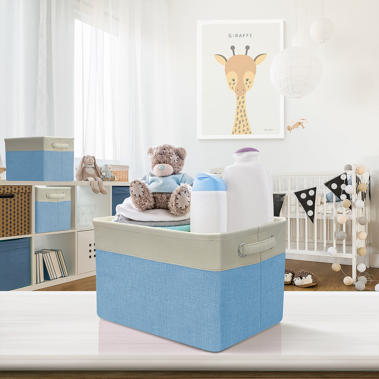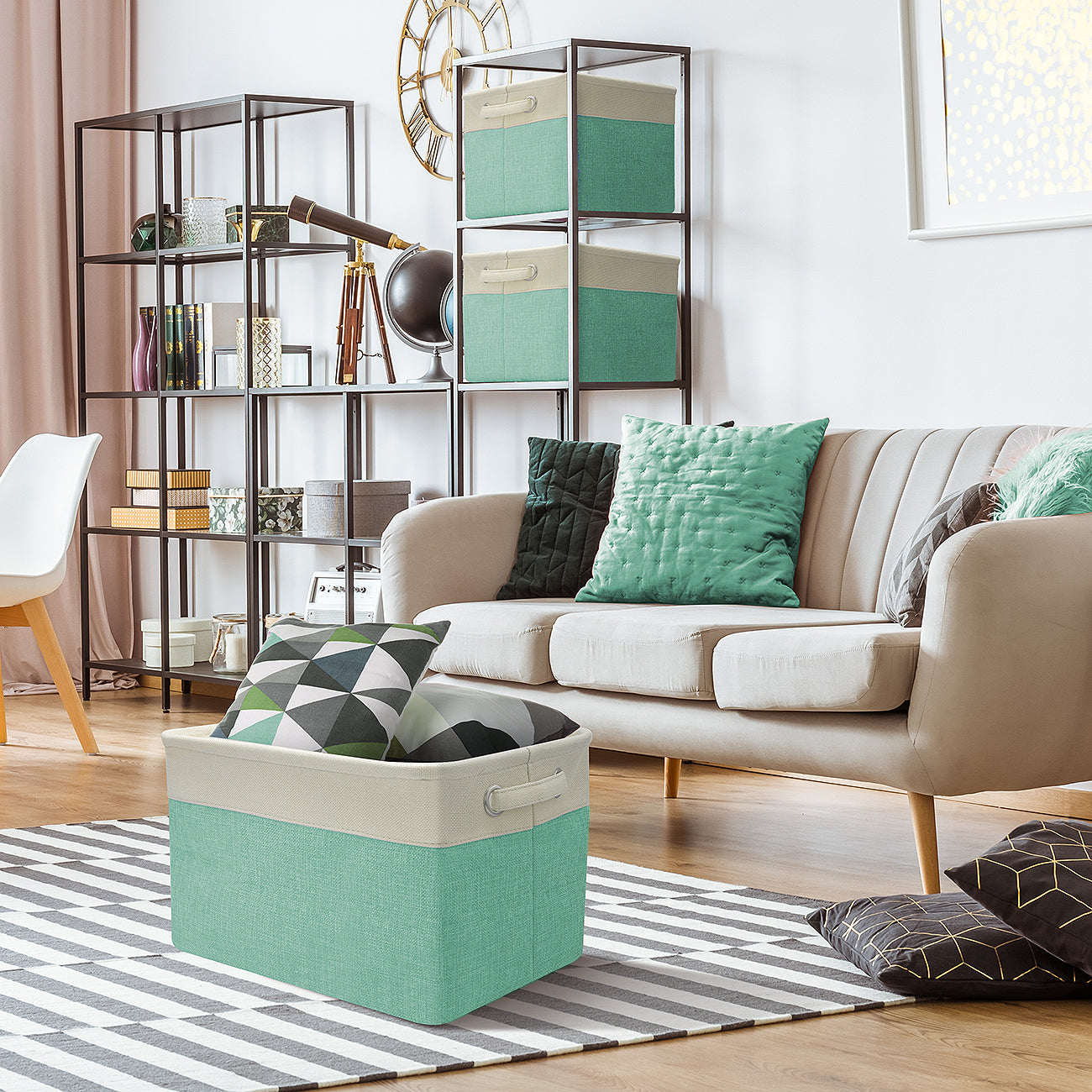 From household items to unruly toys, store some of the most common clutter with the Storage Baskets! This set of three bins feature a beautiful color combination, side carry handles, and collapsible frame. Store anything from books, toys, and crafts, to clothes, linens, and more. Portable carry handles make it easy to lift and tote around the home or slide onto a shelf. When not in use, the space-saving design collapses flat for storage.