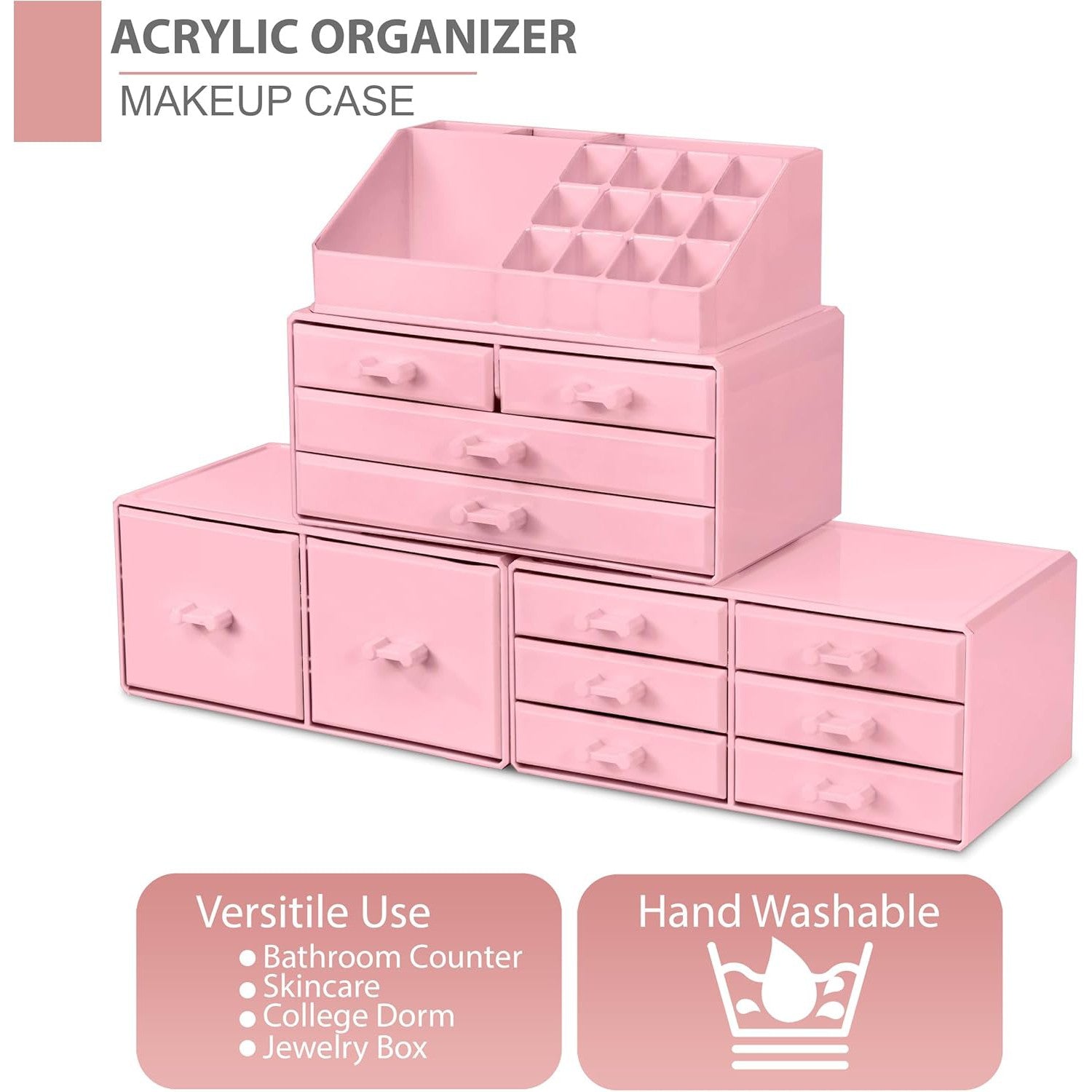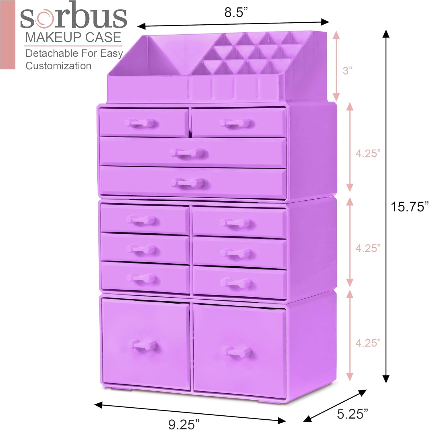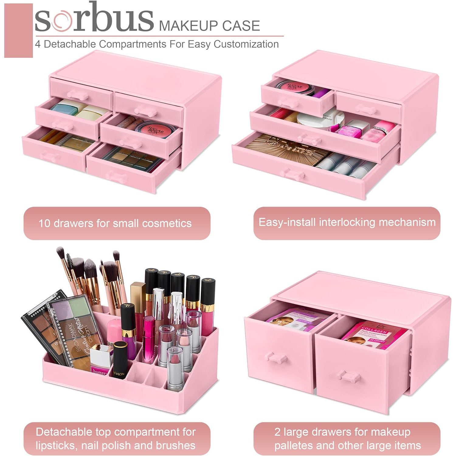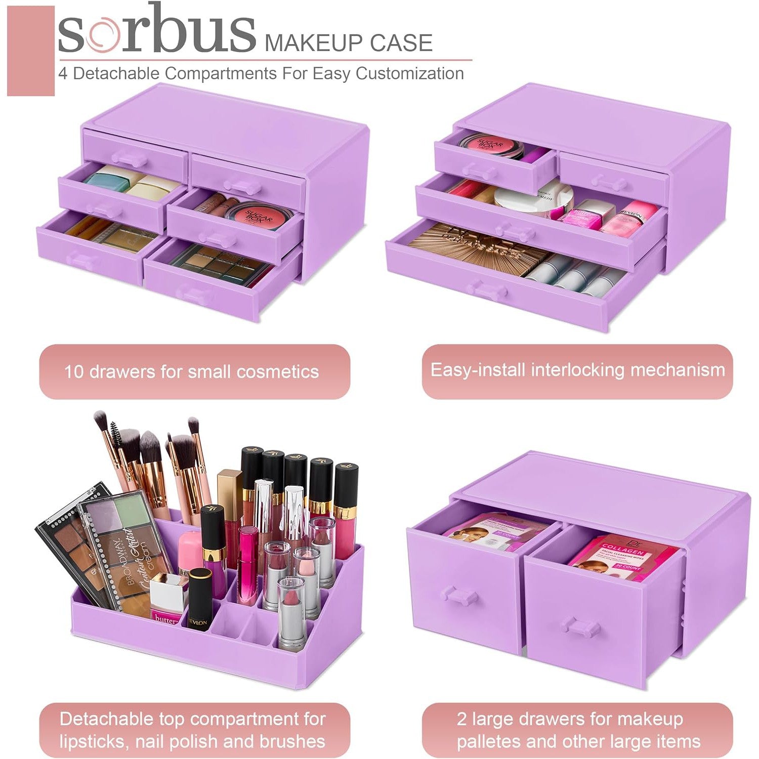 Its detachable 4-piece set includes various compartments and drawers to suit your preferences, stackable and interchangeable for versatility. Compatible with additional Sorbus organizers, it's perfect for any beauty enthusiast and makes a great gift for teens, college students, or adults. With its stylish design and durable acrylic construction, this organizer beautifully displays and protects your makeup and accessories, making it a must-have for any makeup lover.