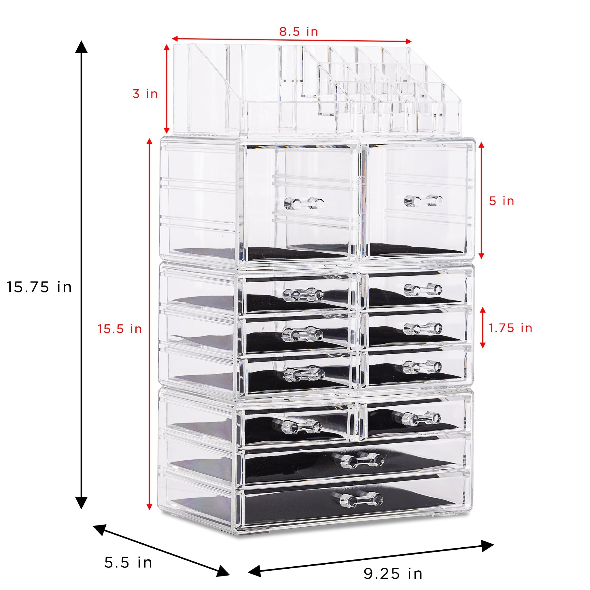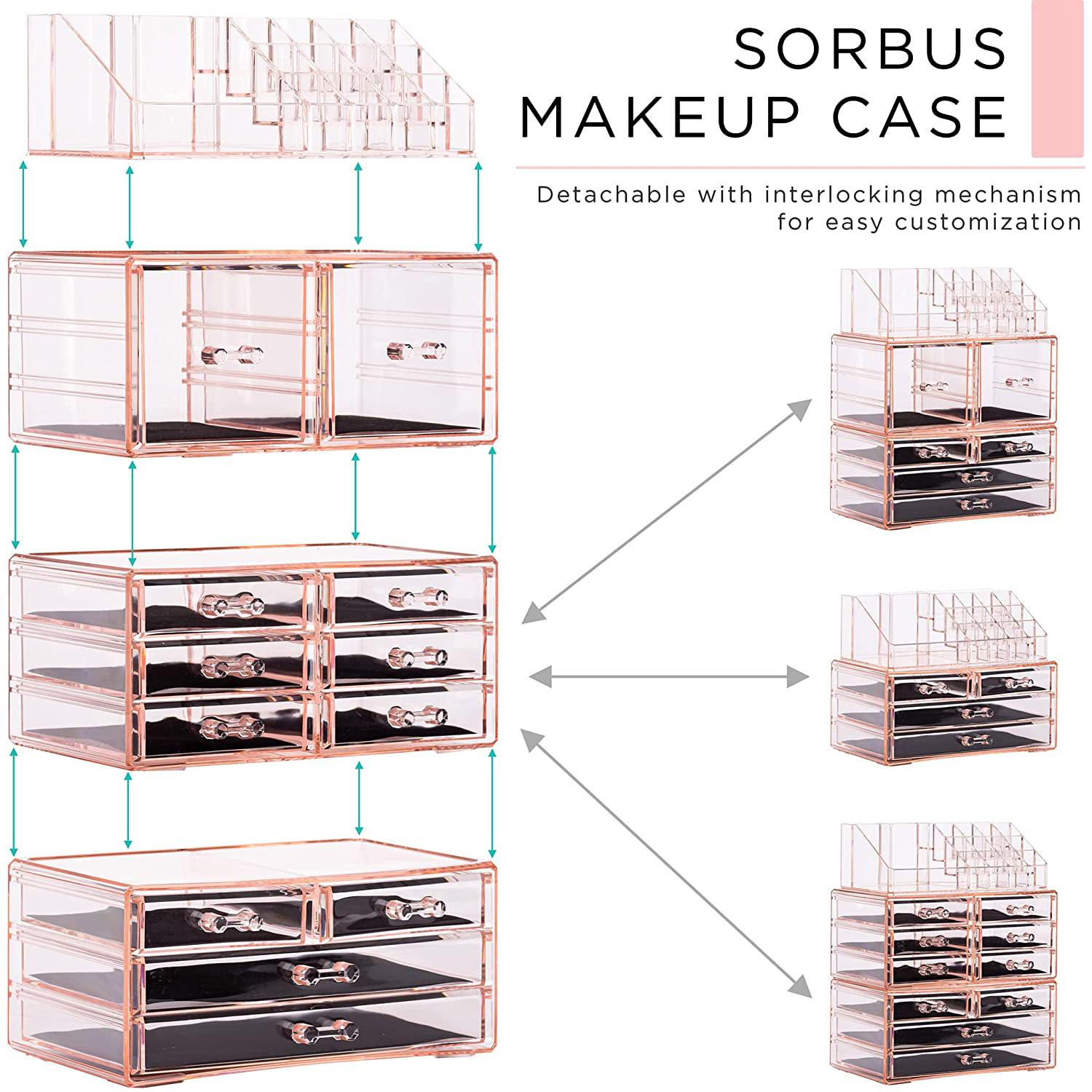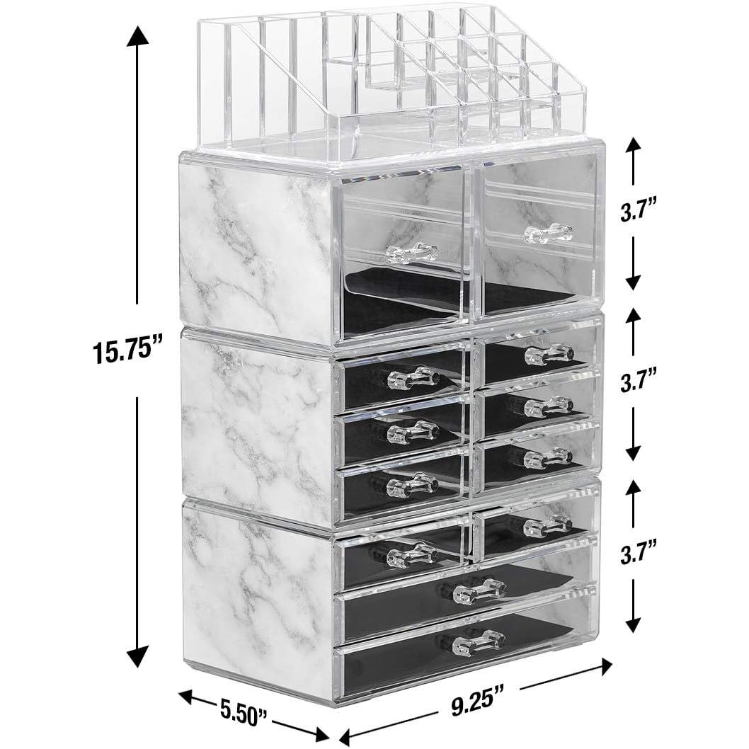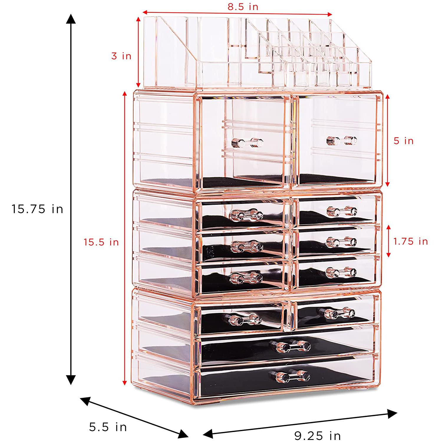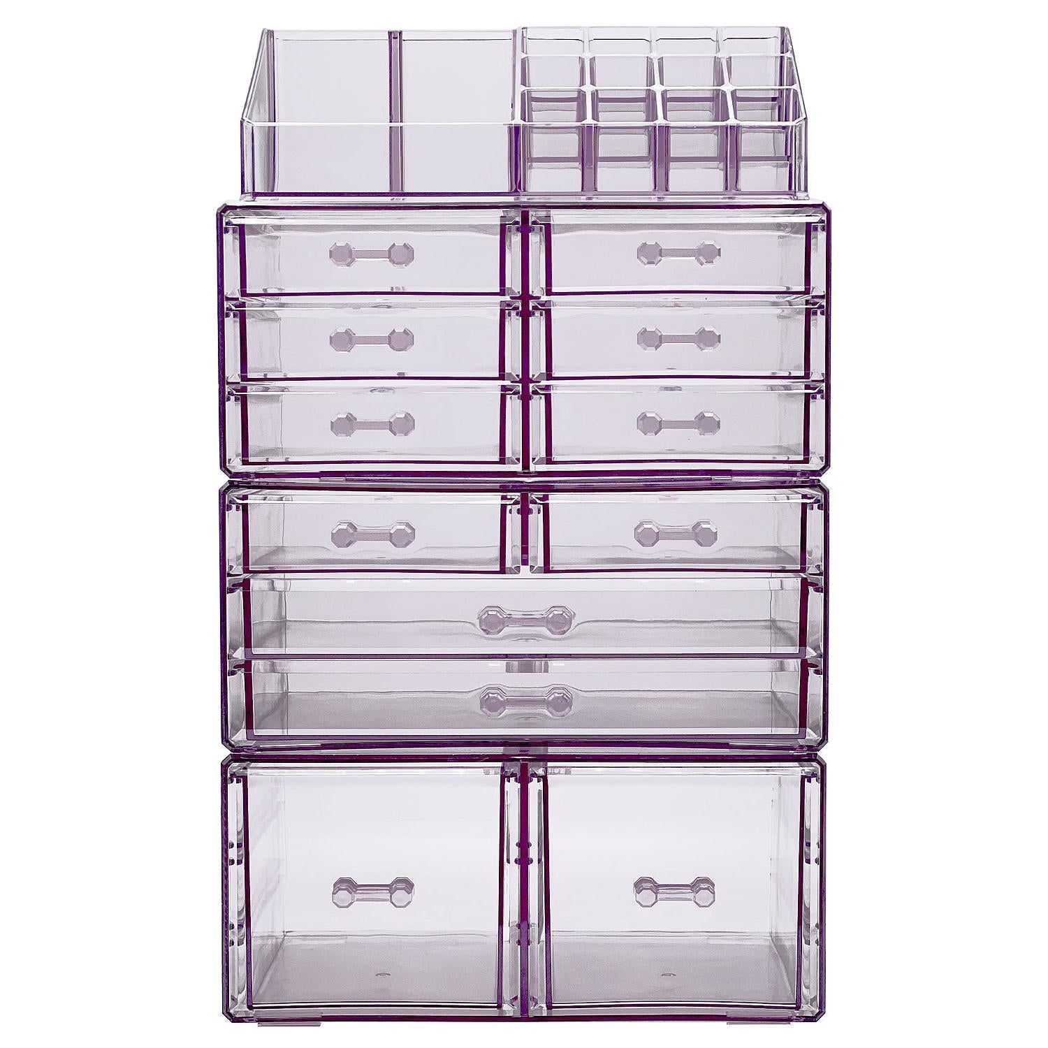 Whether you're a beauty beginner or glam guru, you now have a place to display your essentials. This extra-large 4-piece makeup organizer by Sorbus is a stylish way to store your beauty collection. It features twelve drawers total (both small and large) with a sleek clear view. The top tray compartment includes sixteen slots, perfect for dividing your makeup brushes, lipsticks, perfume bottles, skincare, and more. With an interchangeable design, this entire unit can remain stacked together or separated to spread out your collection. Don't limit your imagination to beauty needs! Grooming tools, jewelry, and other personal accessories can be beautifully organized within this storage case. Your beauty routine (and countertop) will thank you! (Makeup NOT INCLUDED).