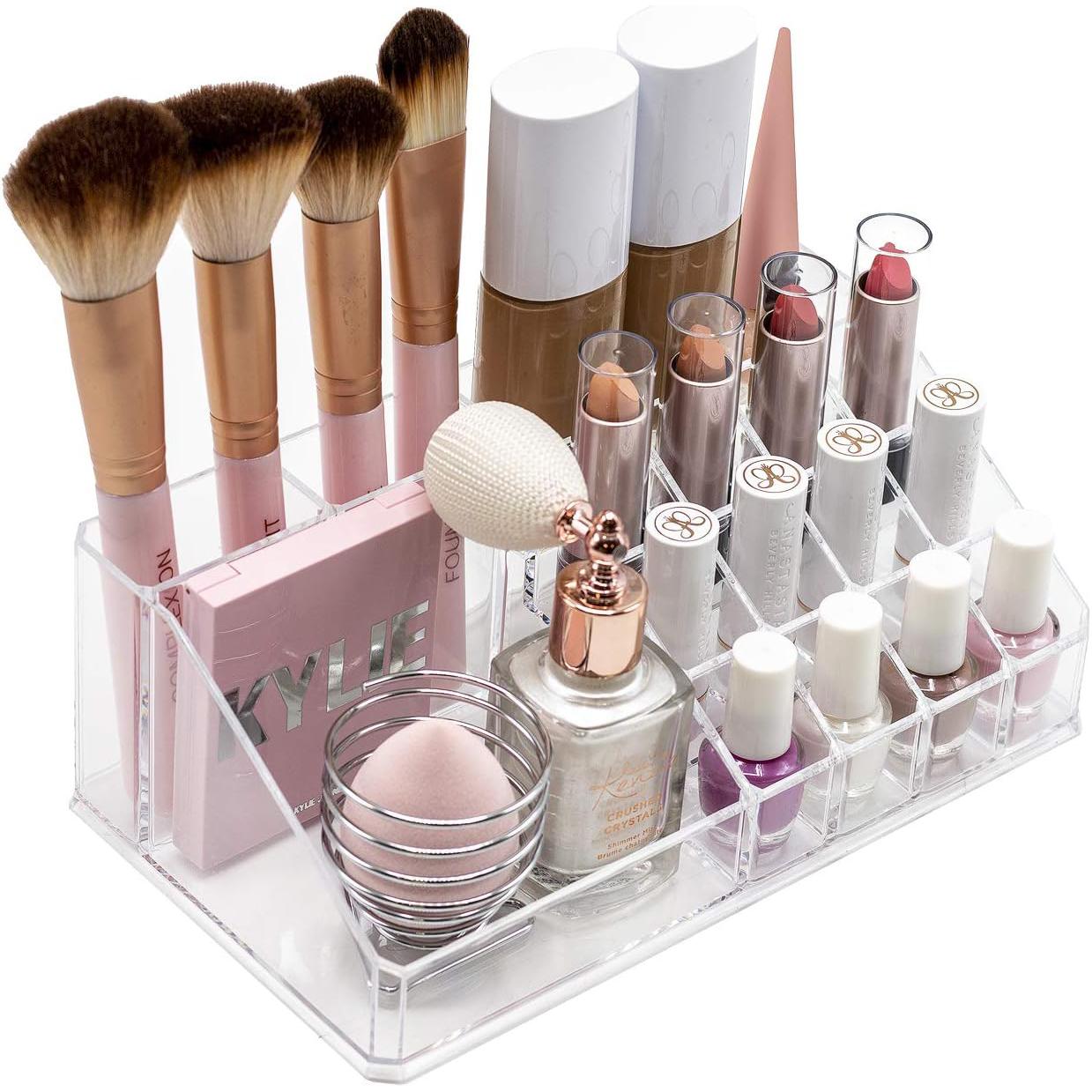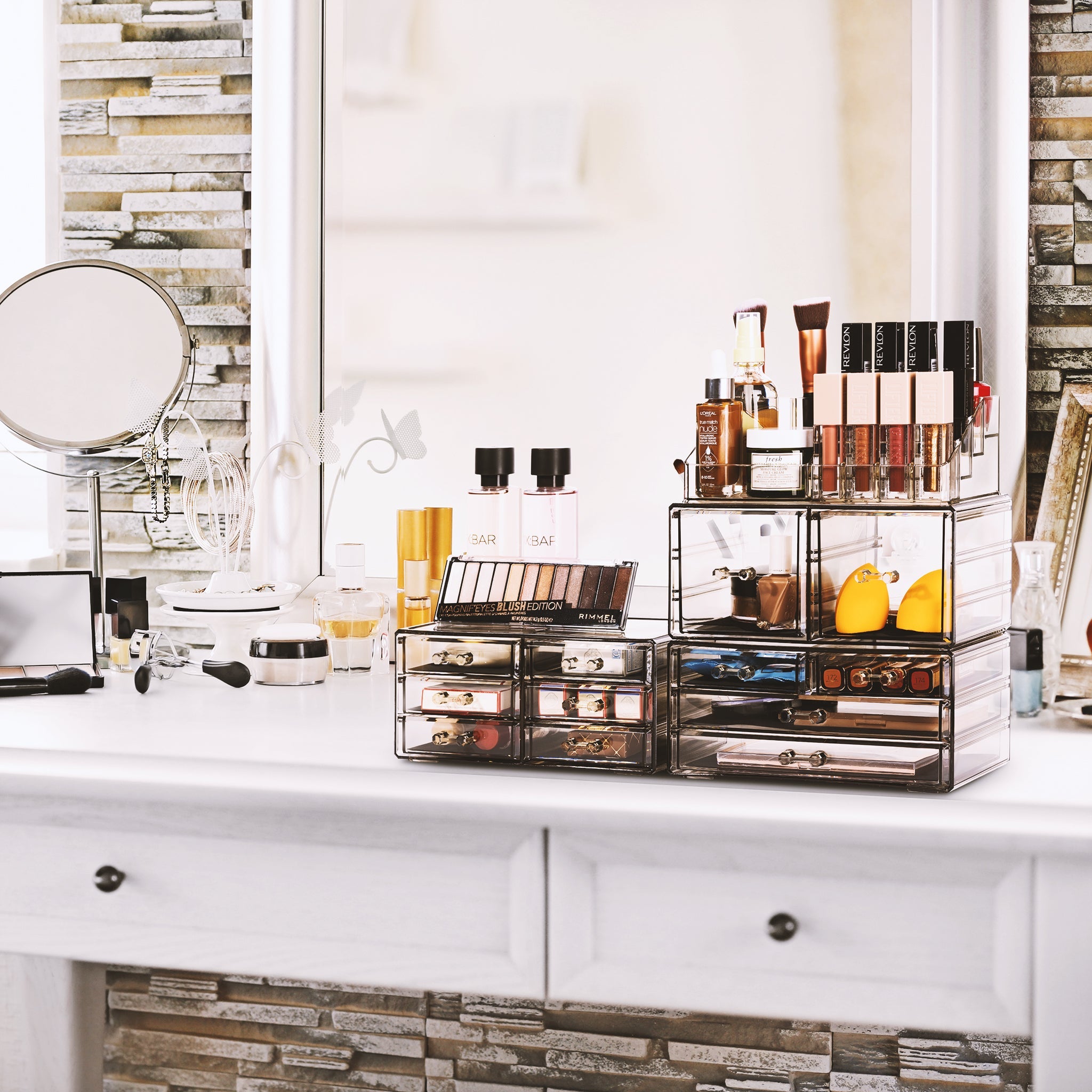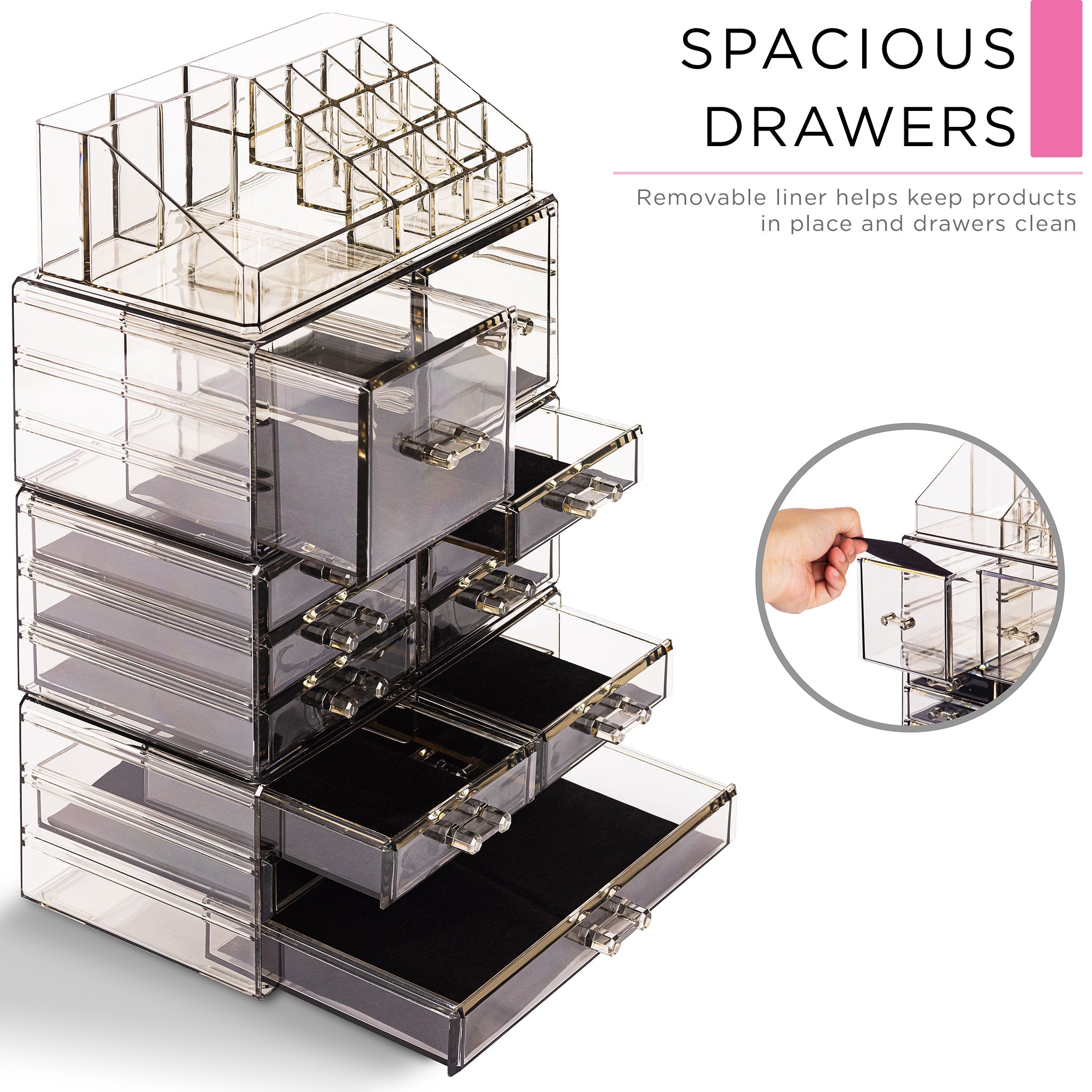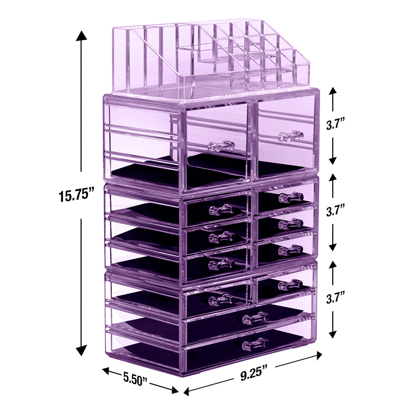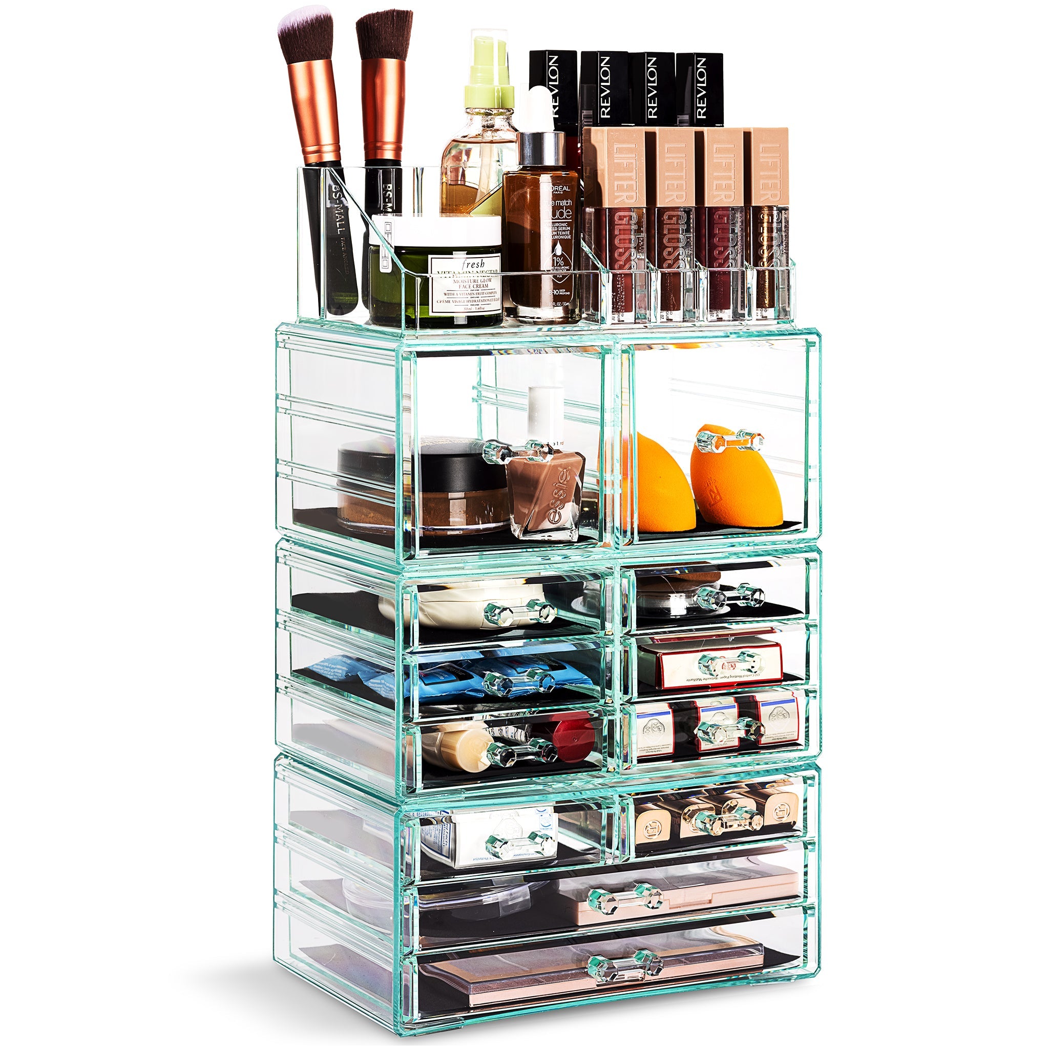 Whether you're a beauty beginner or glam guru, you now have a place to display your essentials. This extra-large 4-piece makeup organizer by Sorbus is a stylish way to store your beauty collection. It features twelve drawers total (both small and large) with a sleek clear view. The top tray compartment includes sixteen slots, perfect for dividing your makeup brushes, lipsticks, perfume bottles, skincare, and more. With an interchangeable design, this entire unit can remain stacked together or separated to spread out your collection. Don't limit your imagination to beauty needs! Grooming tools, jewelry, and other personal accessories can be beautifully organized within this storage case. Your beauty routine (and countertop) will thank you! (Makeup NOT INCLUDED).