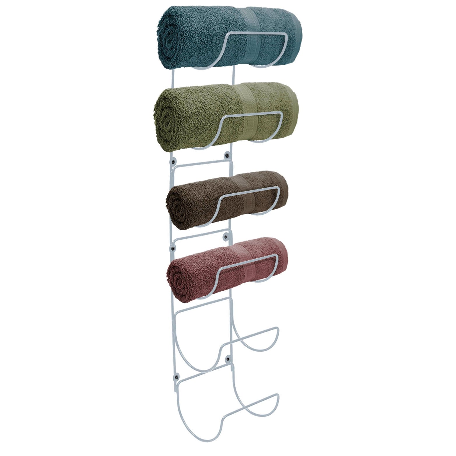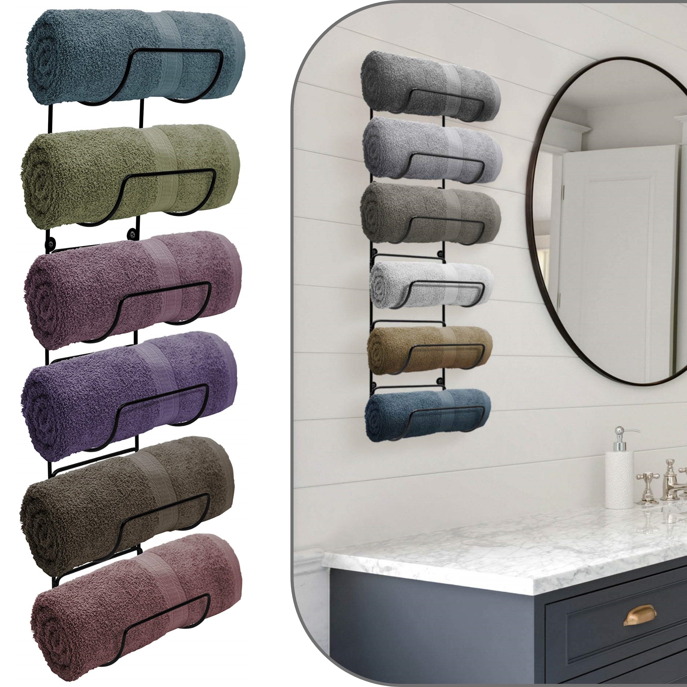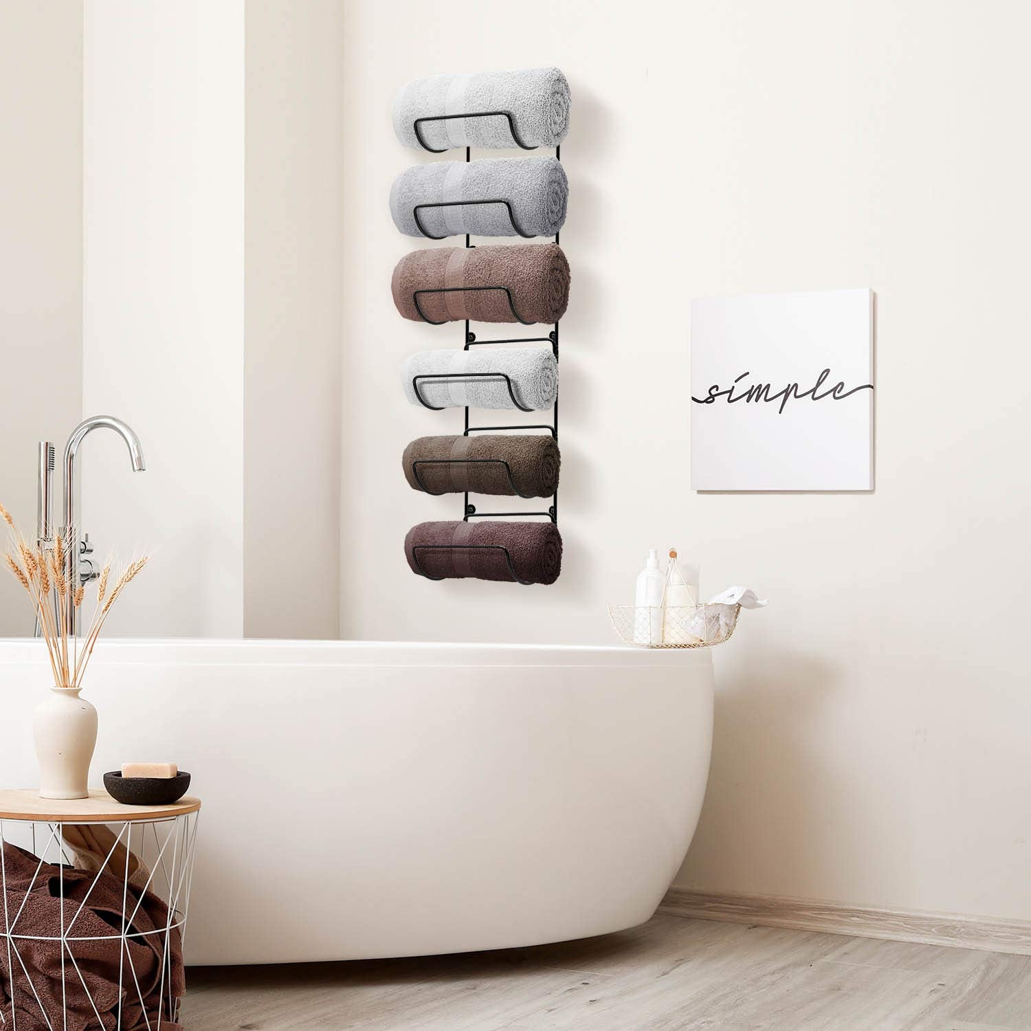Store your linens in vertical style with this 6-Tier Towel Rack. Made of iron, this wall-mounted storage holds up to six towels. Simply roll, hang, or fold! The vertical design comes in two parts so you can hang as one single unit or separately as a set of two. Curved slots help you stay organized with a modern look whiling taking up zero square feet! Hang anywhere from the bathroom to a professional salon with the included hardware. Now your go-to linens are always within reach.