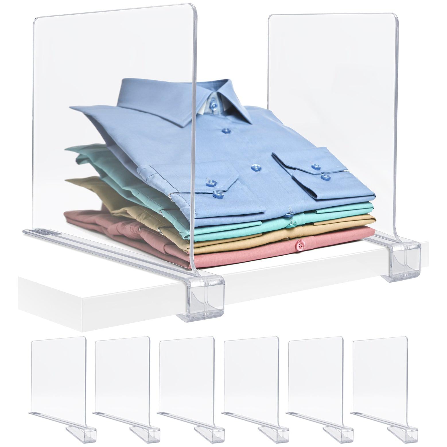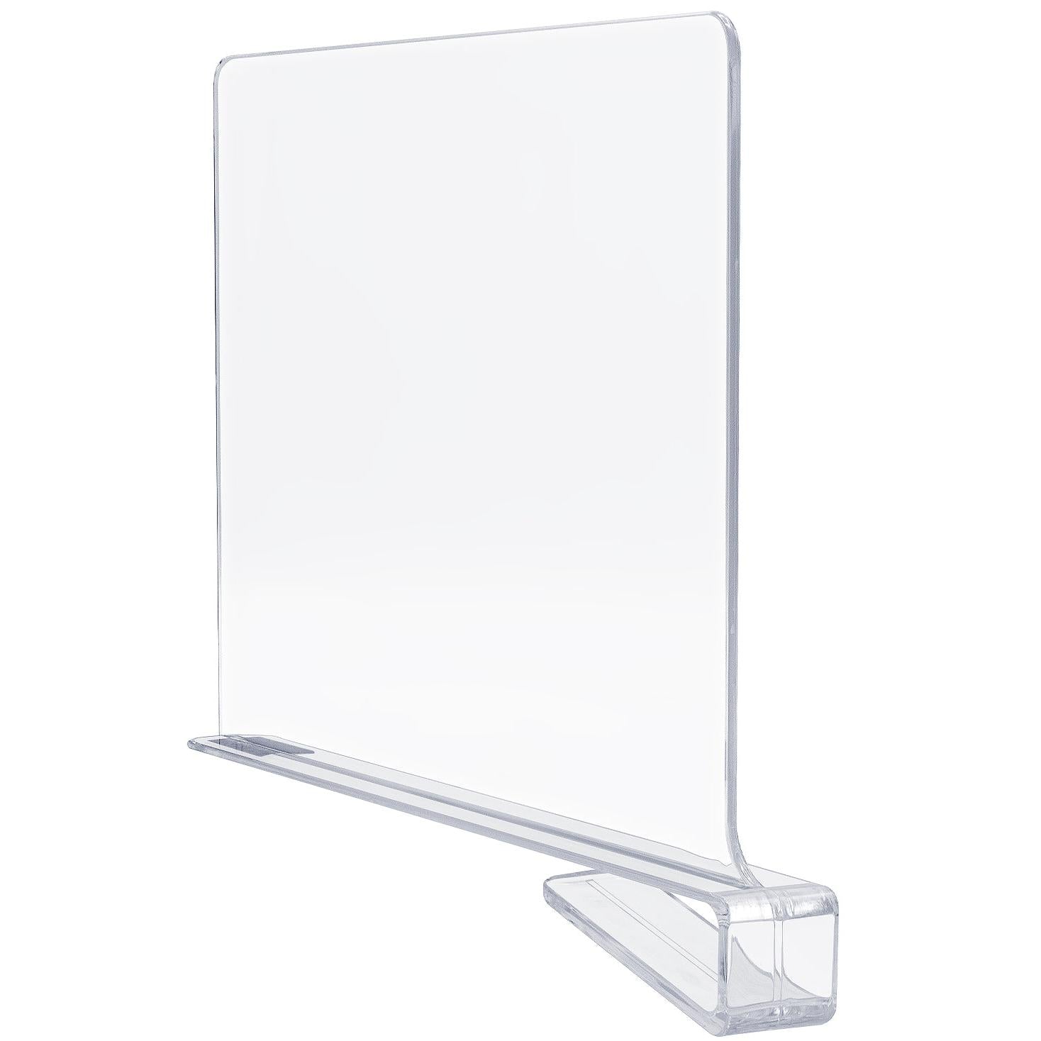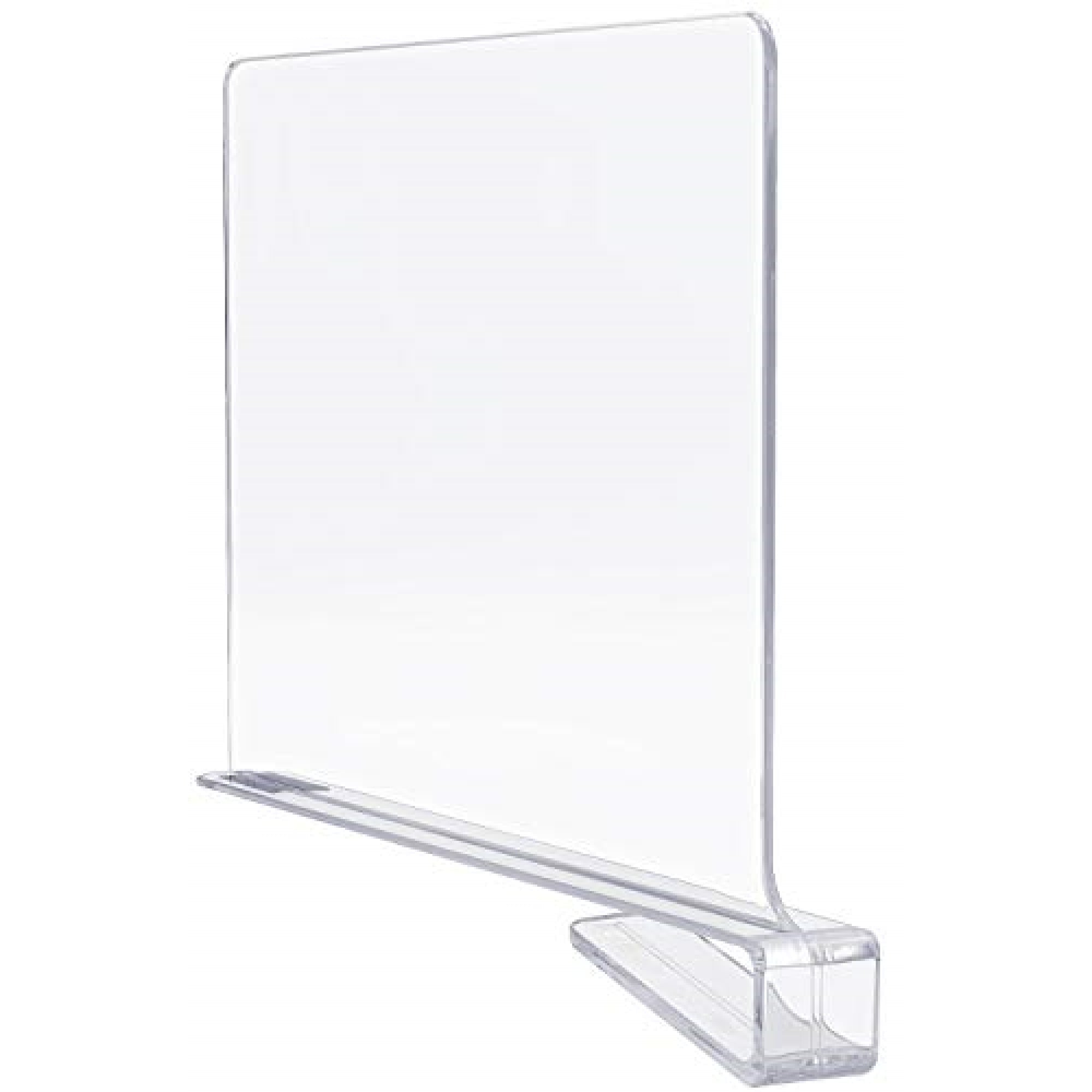 Divide and conquer your messy closet with our Clear Shelf Dividers. These organizers neatly organize your shelves so items are straight and separated. Whether for piles of sweaters or a purse display, these dividers do the trick! Simply slide onto your existing shelves and customize the width between contents. A clear modern design gives your your closet a sleek clutter-free look. They take up less space than storage bins and keep everything visible for easy access.