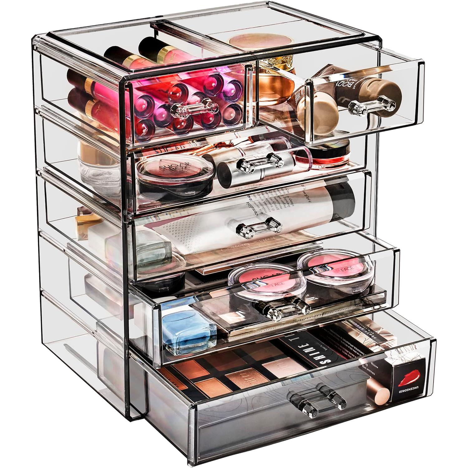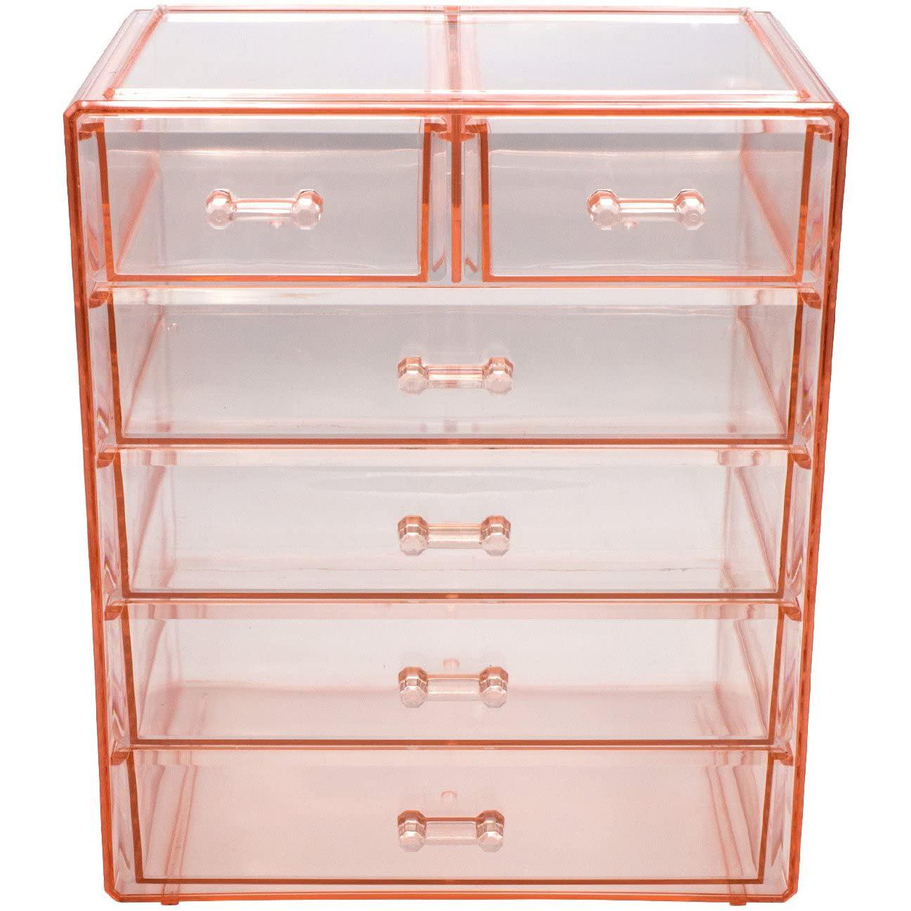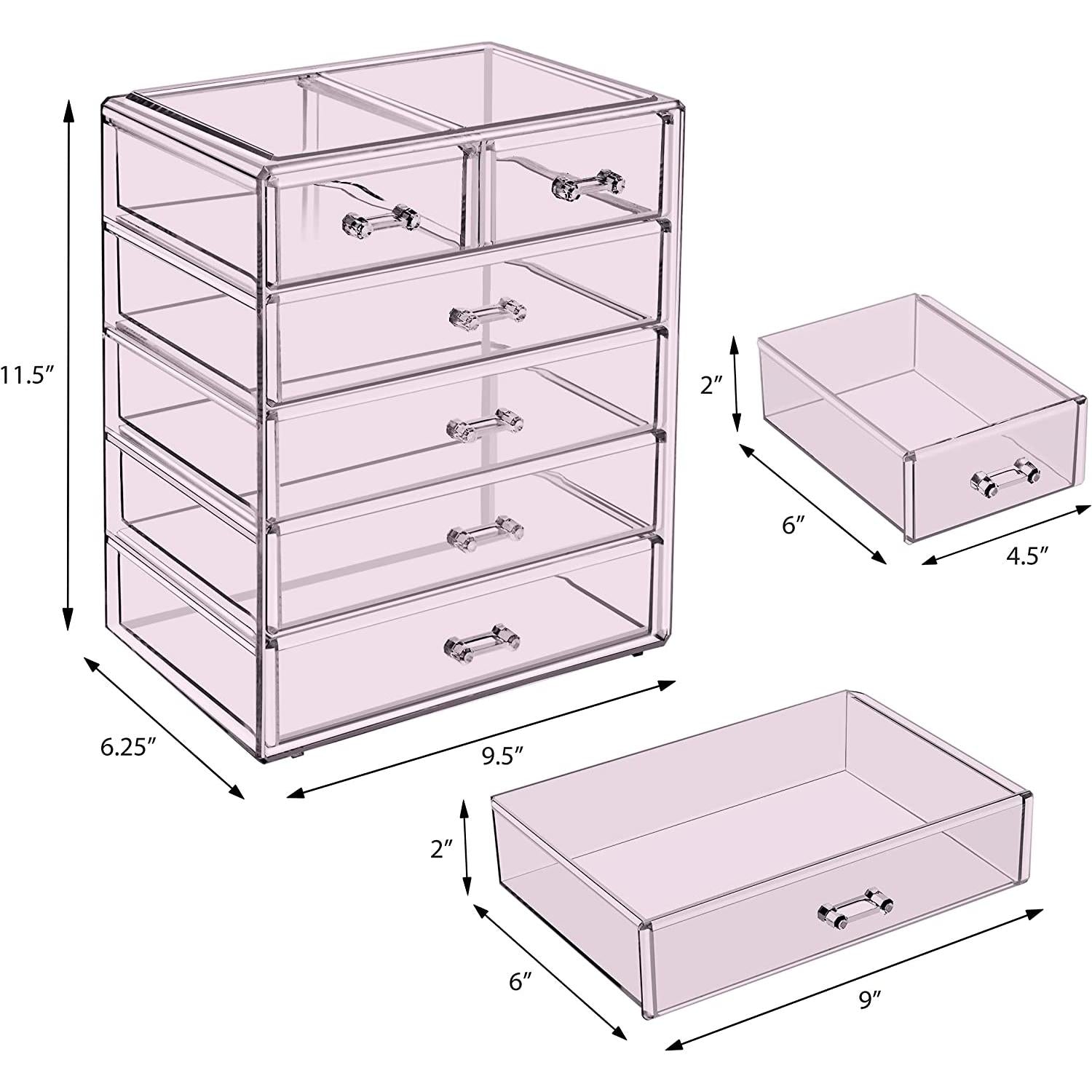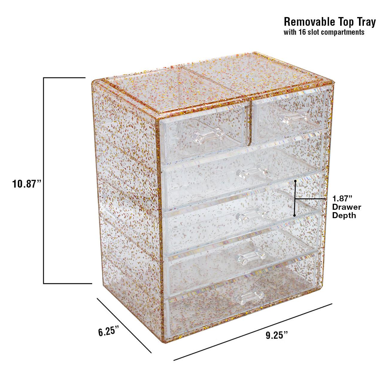 Turn your loose makeup into your very own beauty counter! This drawer organizer features clear construction to store your products with an effortless view. Four drawers on the bottom are ideal for oversize cosmetics, while the top two drawers hold smaller items. Drawers slide open smoothly and handles are easy to grip. Removable black mesh padding is included to keep items protected and in place. With an interchangeable design, it stacks and/or coordinates with other Sorbus organizers as your collection grows. Don't limit your imagination to beauty needs! Crafts, grooming tools, jewelry, and other personal items can be beautifully organized within these drawers.  For convenience, you'll always see your products right when you need them most while adding a chic display to your countertop. (Makeup NOT INCLUDED).