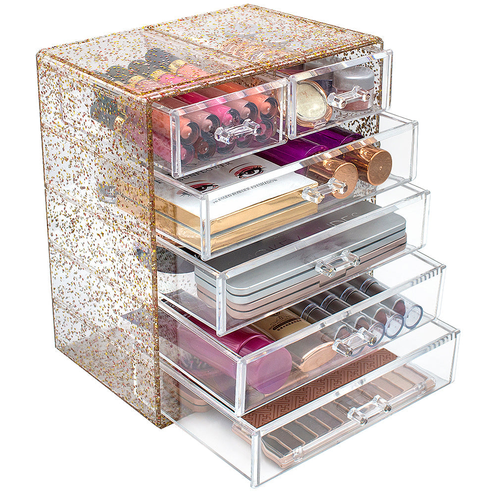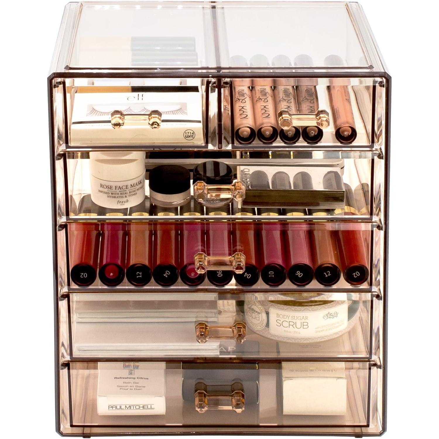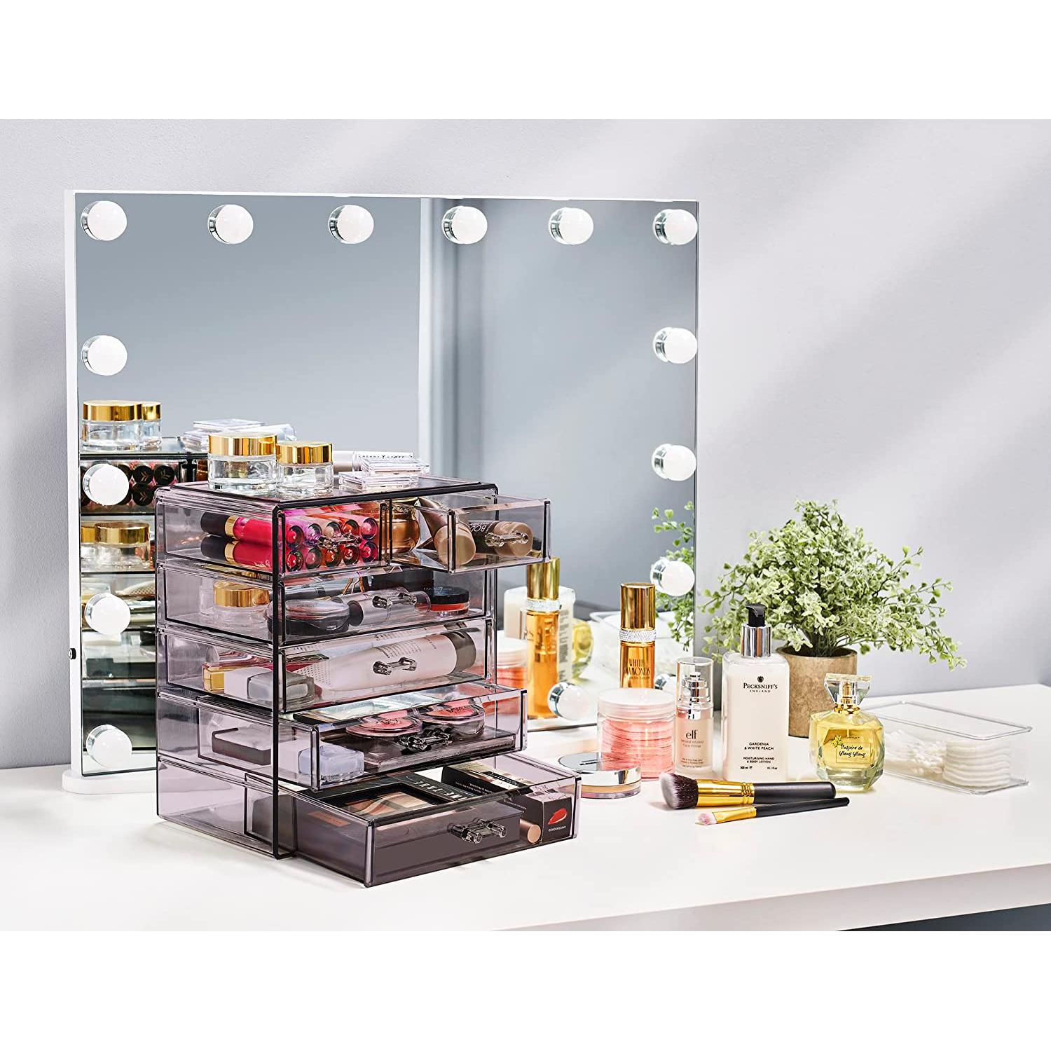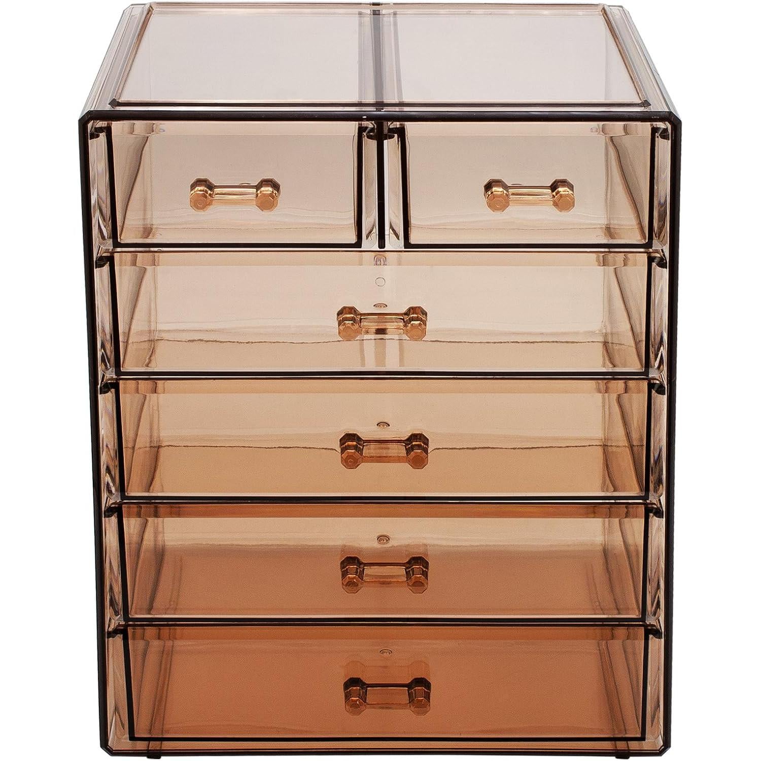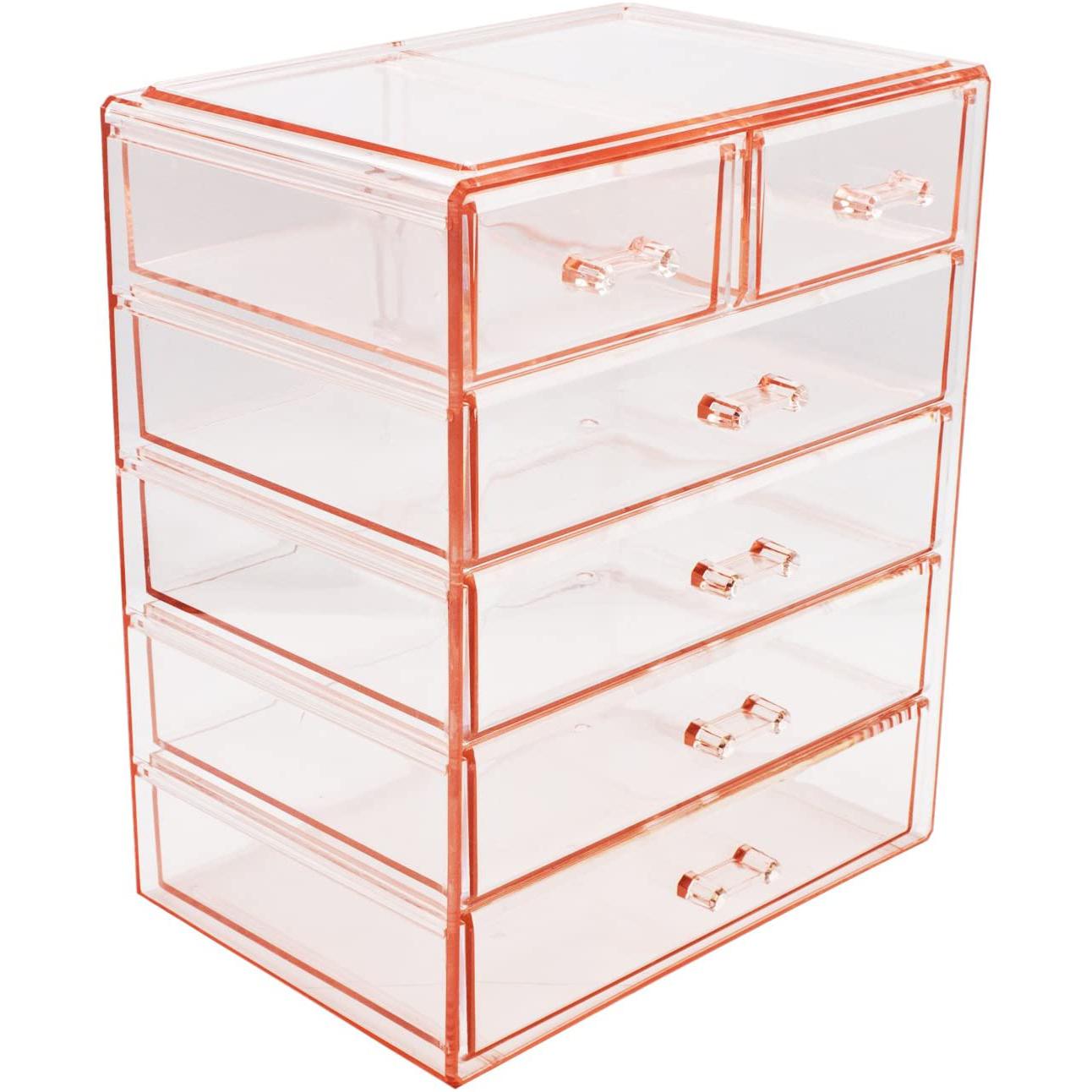 Turn your loose makeup into your very own beauty counter! This drawer organizer features clear construction to store your products with an effortless view. Four drawers on the bottom are ideal for oversize cosmetics, while the top two drawers hold smaller items. Drawers slide open smoothly and handles are easy to grip. Removable black mesh padding is included to keep items protected and in place. With an interchangeable design, it stacks and/or coordinates with other Sorbus organizers as your collection grows. Don't limit your imagination to beauty needs! Crafts, grooming tools, jewelry, and other personal items can be beautifully organized within these drawers.  For convenience, you'll always see your products right when you need them most while adding a chic display to your countertop. (Makeup NOT INCLUDED).