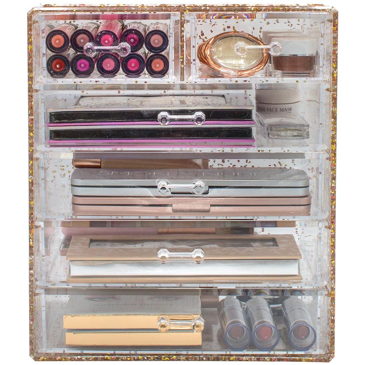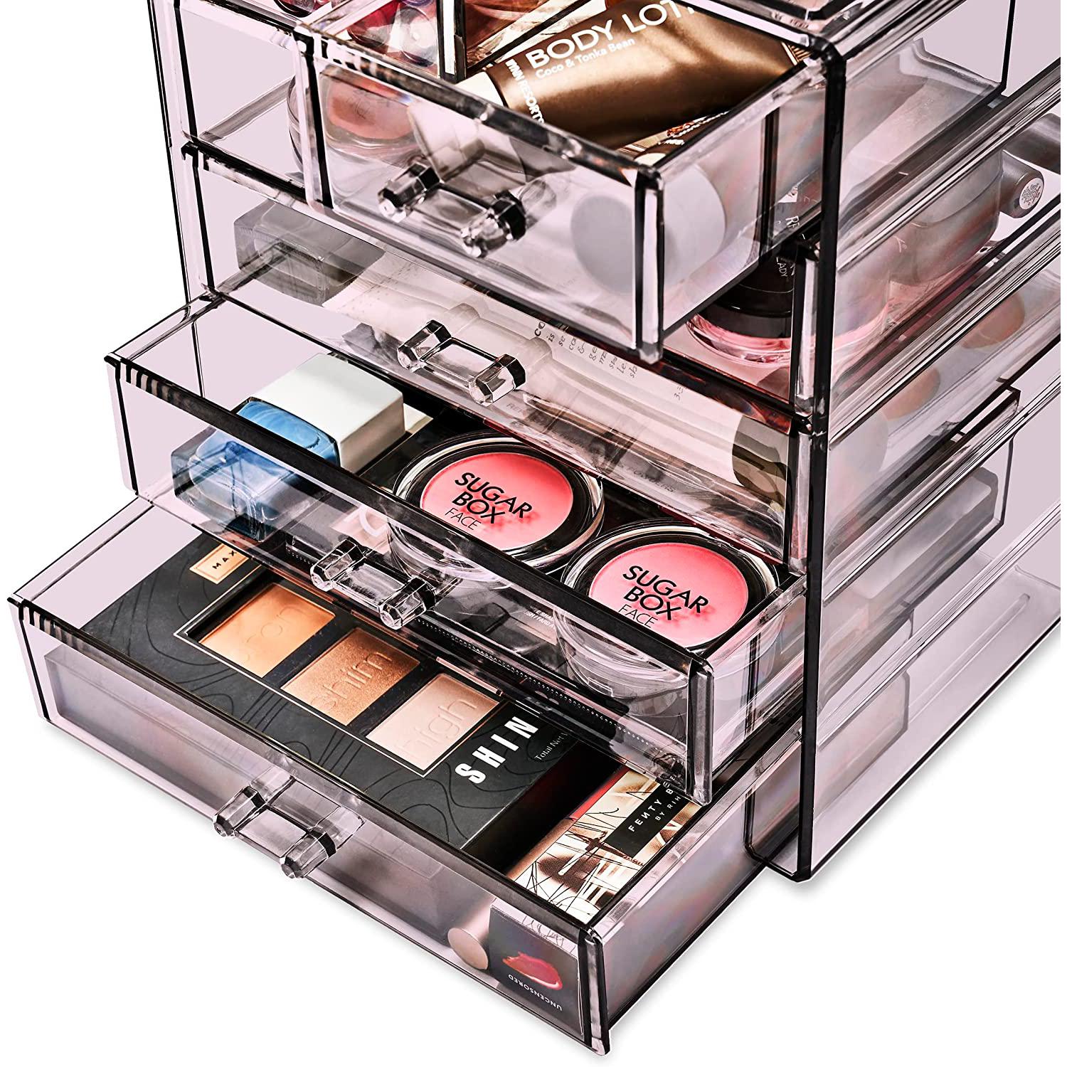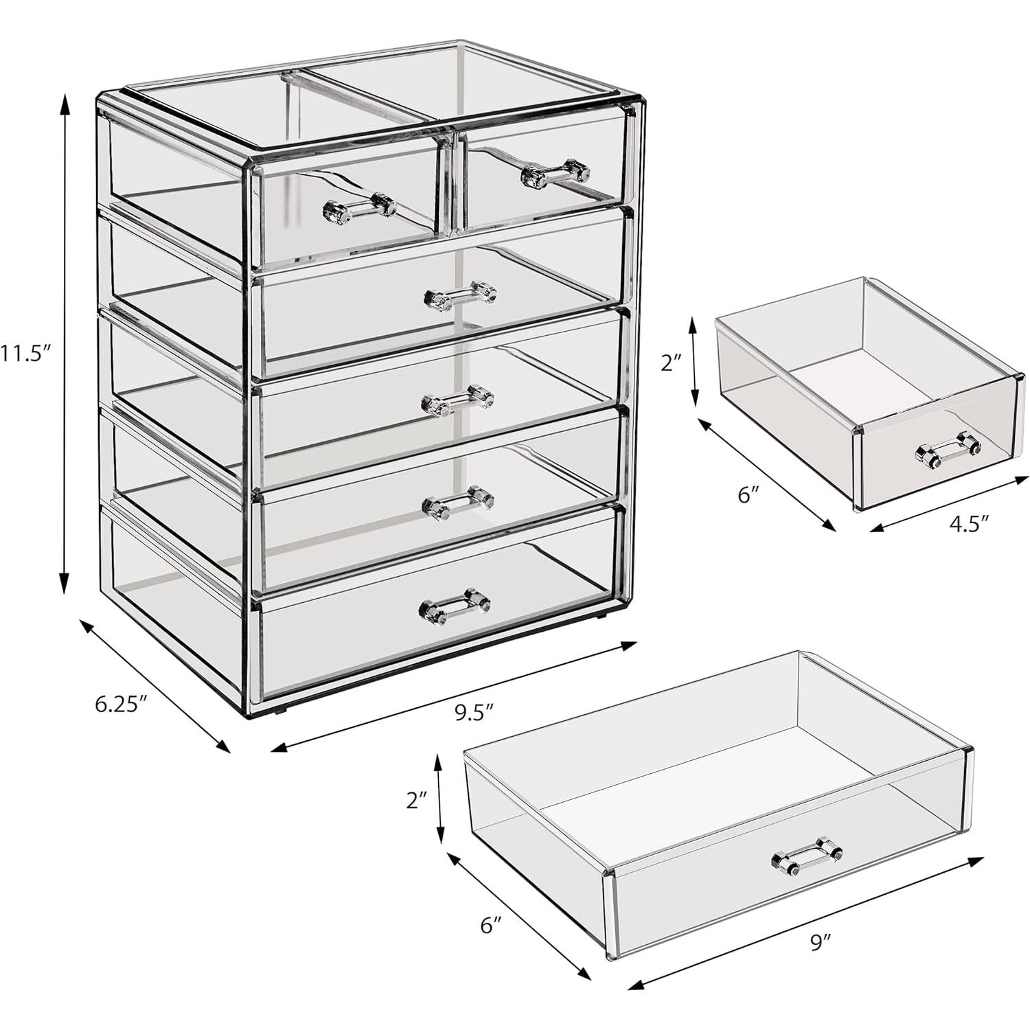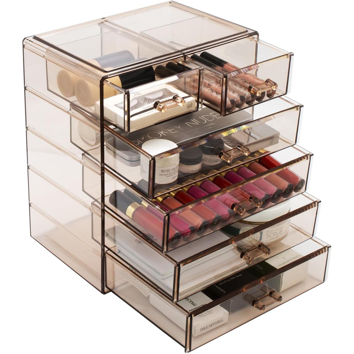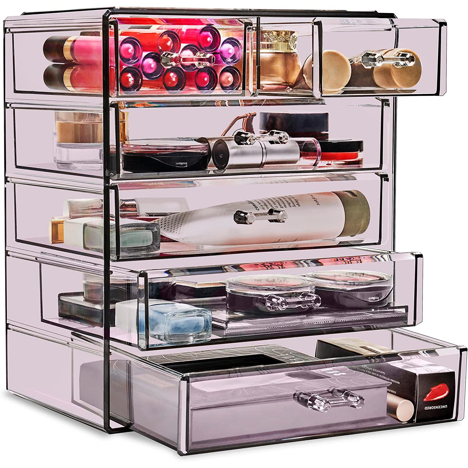 Turn your loose makeup into your very own beauty counter! This drawer organizer features clear construction to store your products with an effortless view. Four drawers on the bottom are ideal for oversize cosmetics, while the top two drawers hold smaller items. Drawers slide open smoothly and handles are easy to grip. Removable black mesh padding is included to keep items protected and in place. With an interchangeable design, it stacks and/or coordinates with other Sorbus organizers as your collection grows. Don't limit your imagination to beauty needs! Crafts, grooming tools, jewelry, and other personal items can be beautifully organized within these drawers.  For convenience, you'll always see your products right when you need them most while adding a chic display to your countertop. (Makeup NOT INCLUDED).