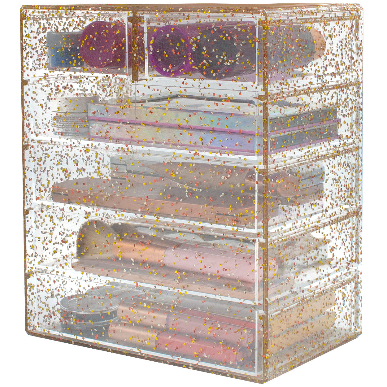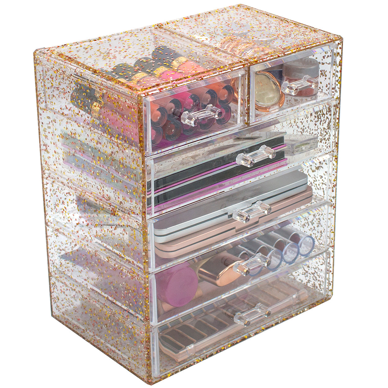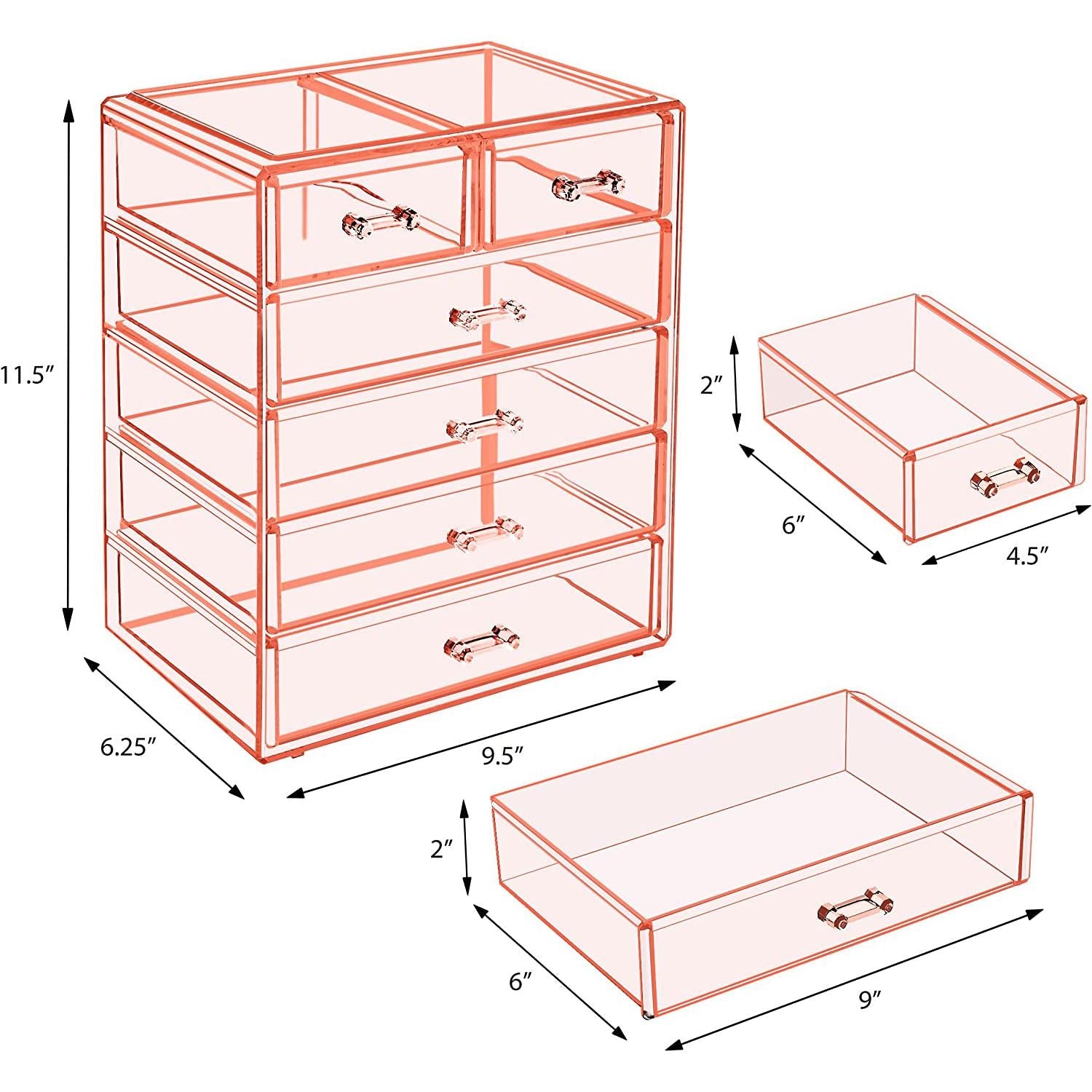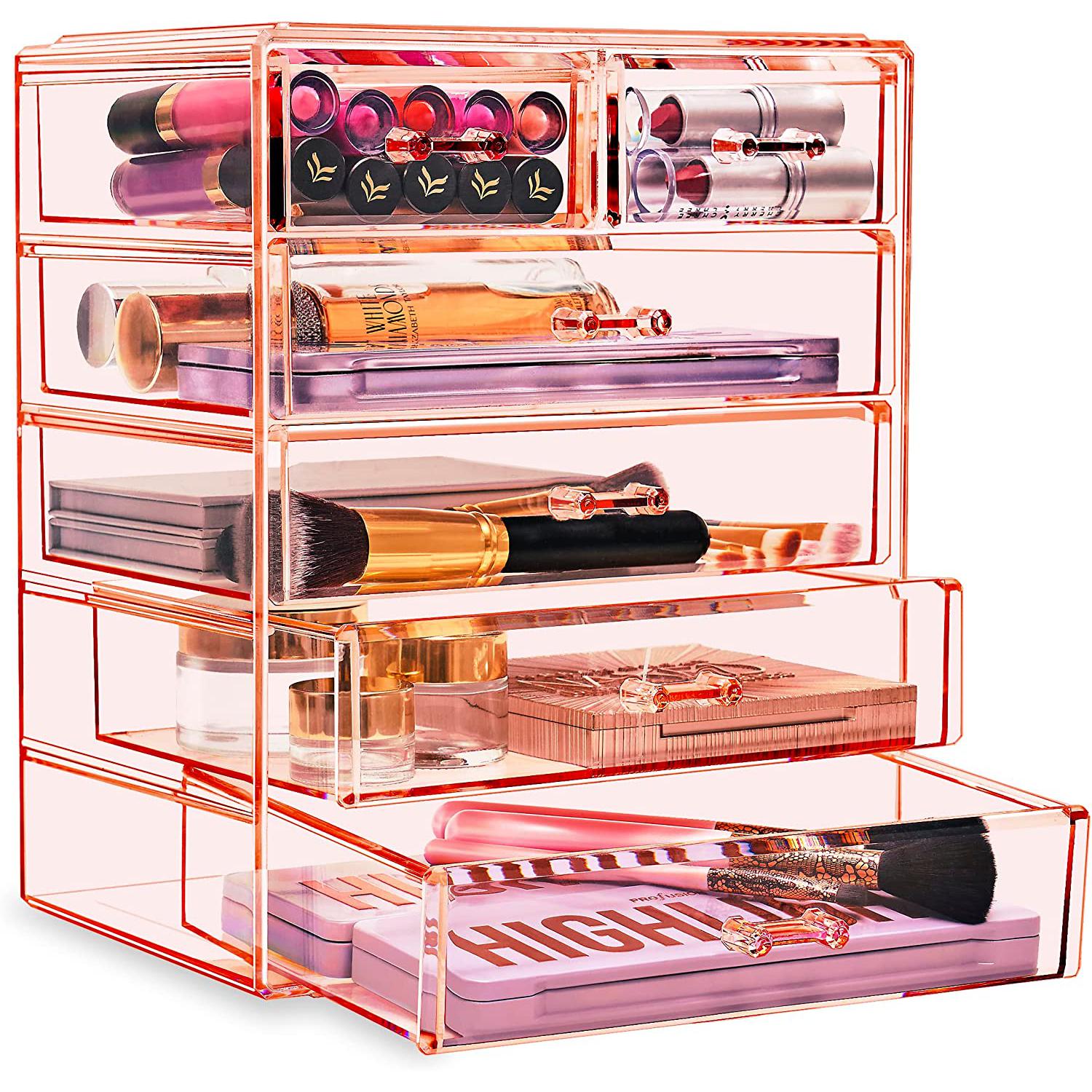 Turn your loose makeup into your very own beauty counter! This drawer organizer features clear construction to store your products with an effortless view. Four drawers on the bottom are ideal for oversize cosmetics, while the top two drawers hold smaller items. Drawers slide open smoothly and handles are easy to grip. Removable black mesh padding is included to keep items protected and in place. With an interchangeable design, it stacks and/or coordinates with other Sorbus organizers as your collection grows. Don't limit your imagination to beauty needs! Crafts, grooming tools, jewelry, and other personal items can be beautifully organized within these drawers.  For convenience, you'll always see your products right when you need them most while adding a chic display to your countertop. (Makeup NOT INCLUDED).