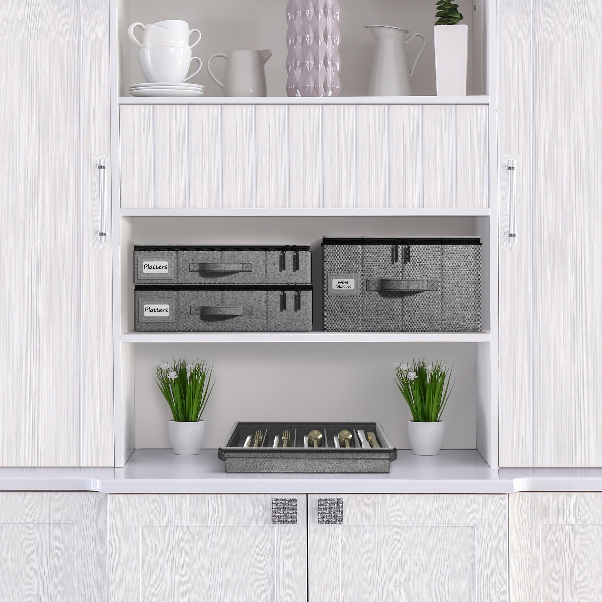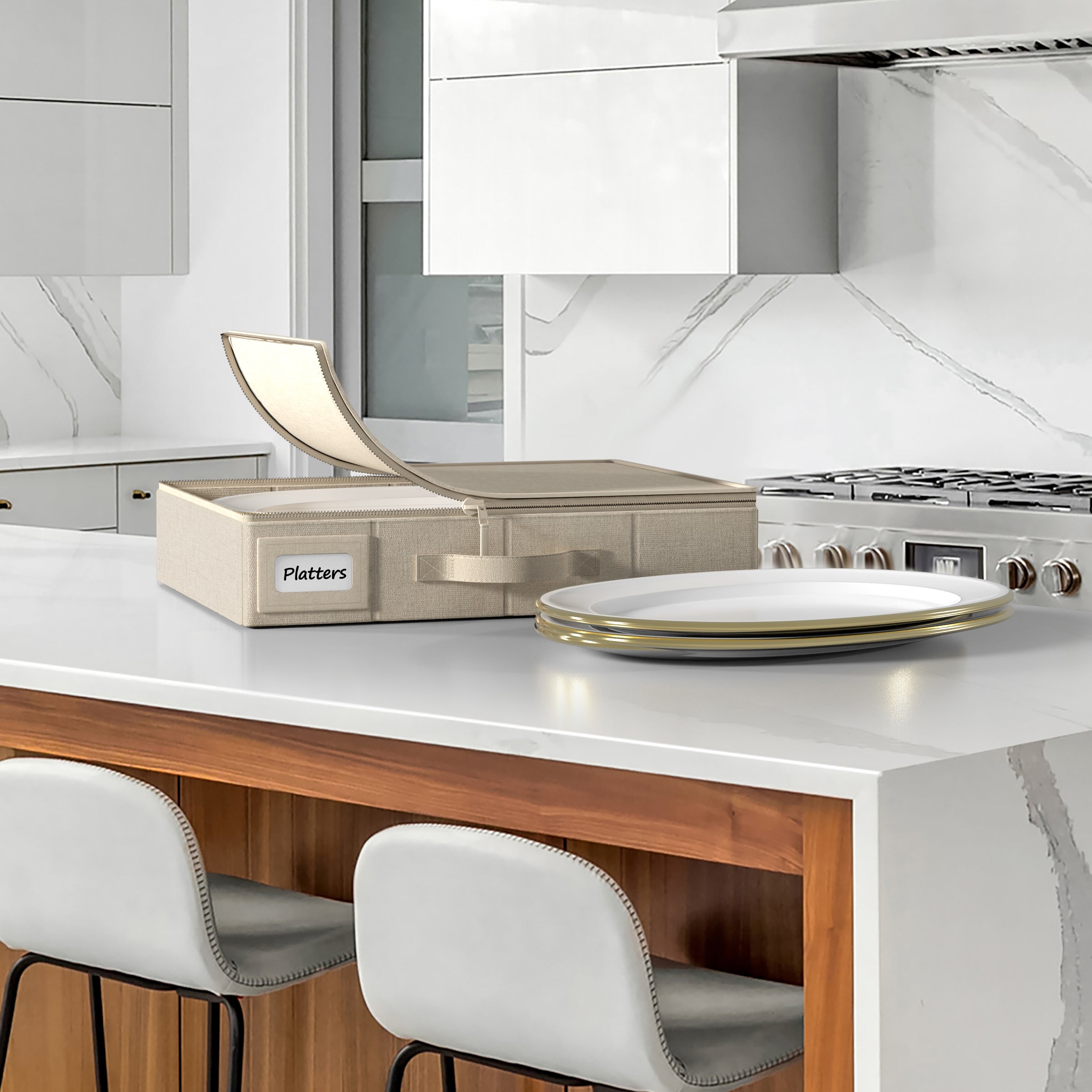 Keep your platter plates protected, clean, and easy to access with the Sorbus China Storage Container. Whether you're organizing everyday dinnerware or preserving special-occasion pieces, this compact storage solution helps prevent chipping, scratching, and dust buildup—perfect for home storage or moving. Measuring 13.5" x 17.5", each storage case is specially designed to hold a 4-piece set of platter plates. The durable outer fabric and structured shape maintain stability, while the included soft felt dividers protect each item during stacking or transit. A smooth zippered lid keeps contents secure and dust-free, making it ideal for cabinets, closets, pantries, or moving boxes. From holiday dish sets to heirloom pieces, this china storage container keeps your dinnerware beautifully organized and well-preserved all year round.