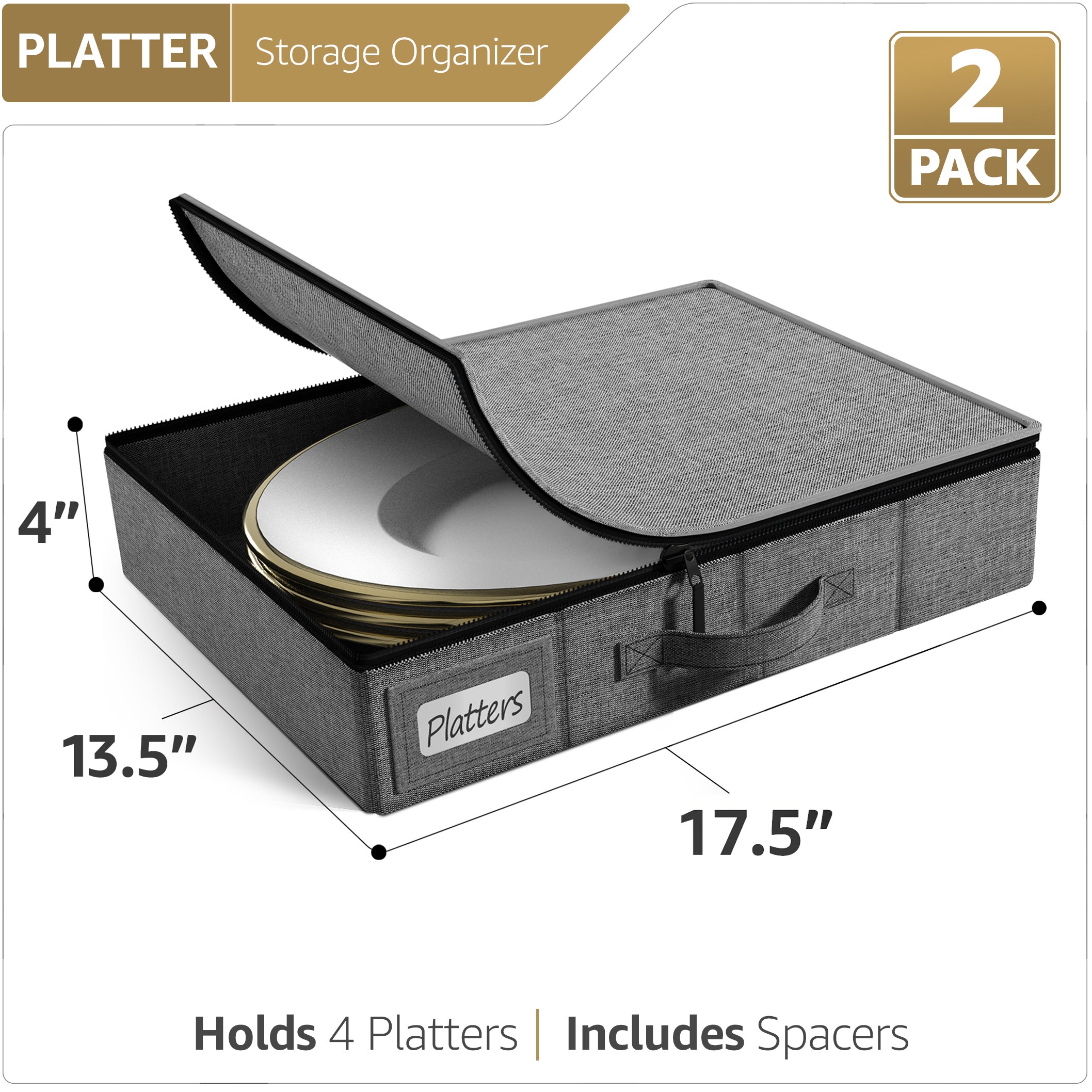 - Plate container measures 13.5"L x 17.5"W x 4"H (Fits 4 Platter Plates)