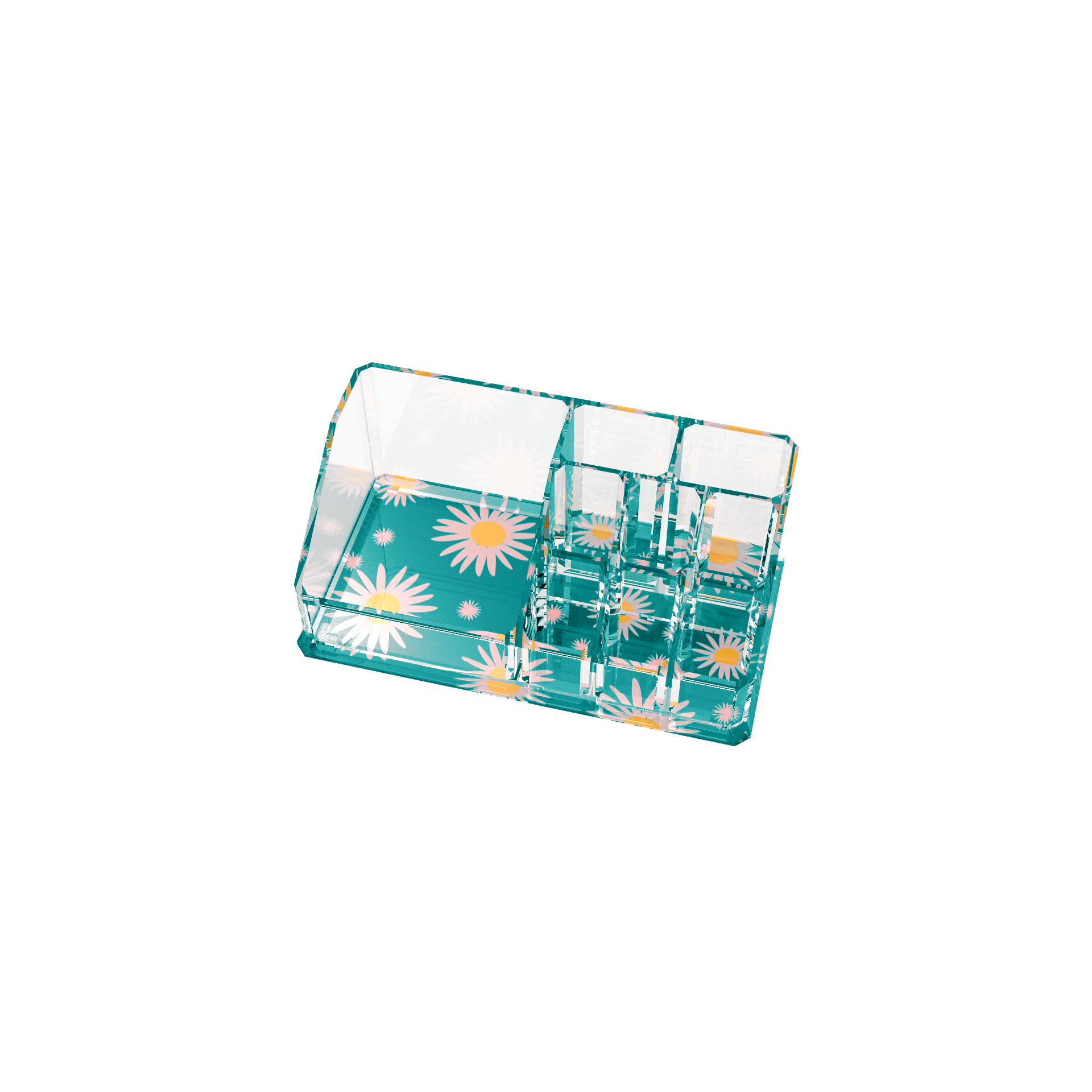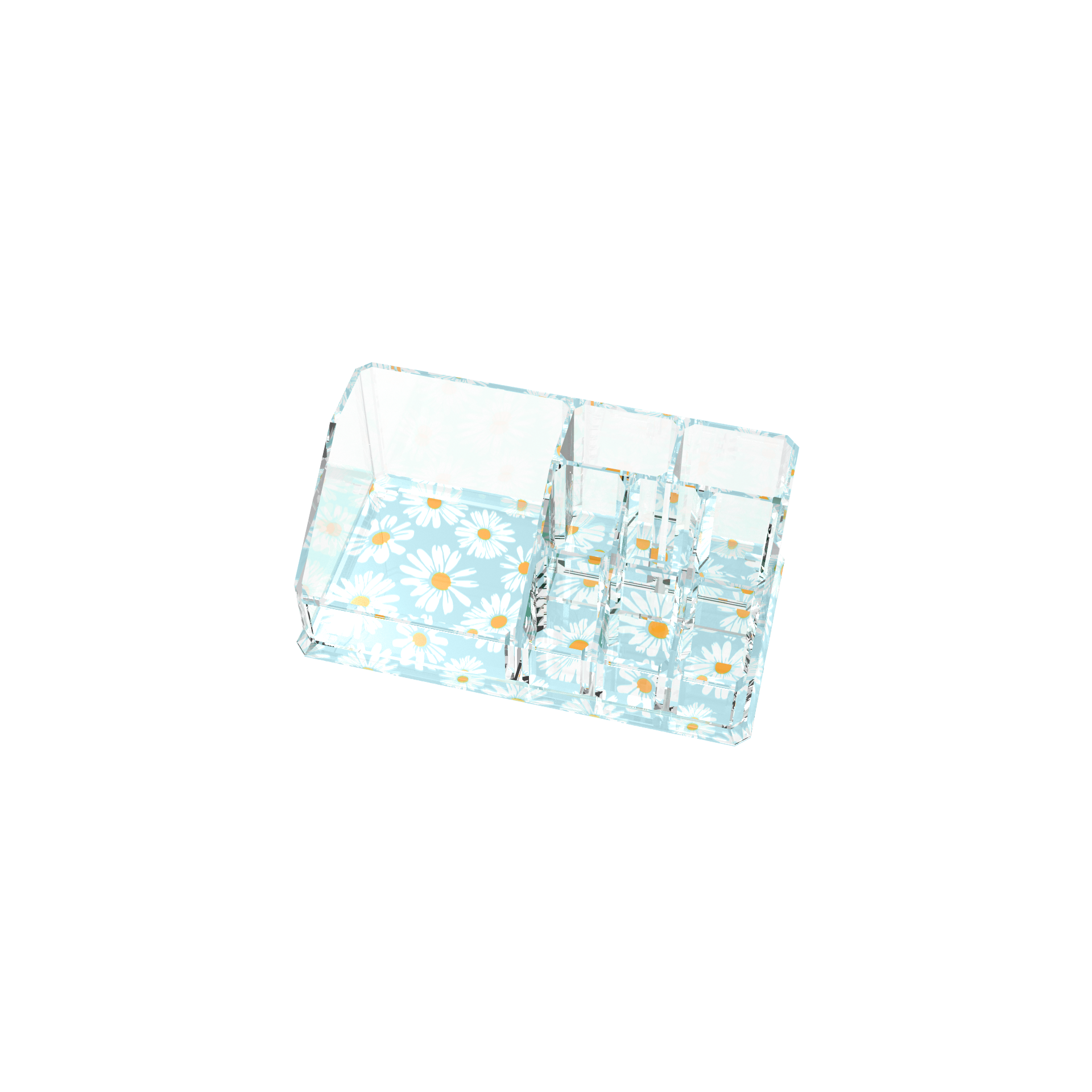 Divided compartments on a daisy print base provide a fun way to organize your makeup and beauty supplies. Limited Stock. Special Edition.