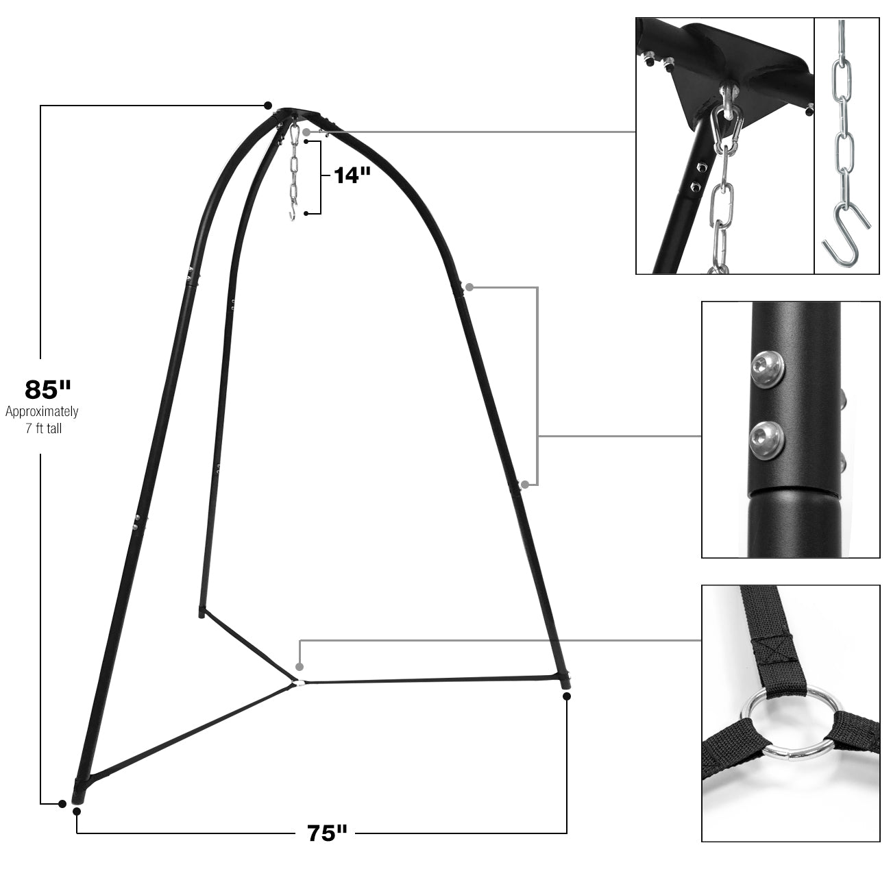 - Supports most hanging chairs.