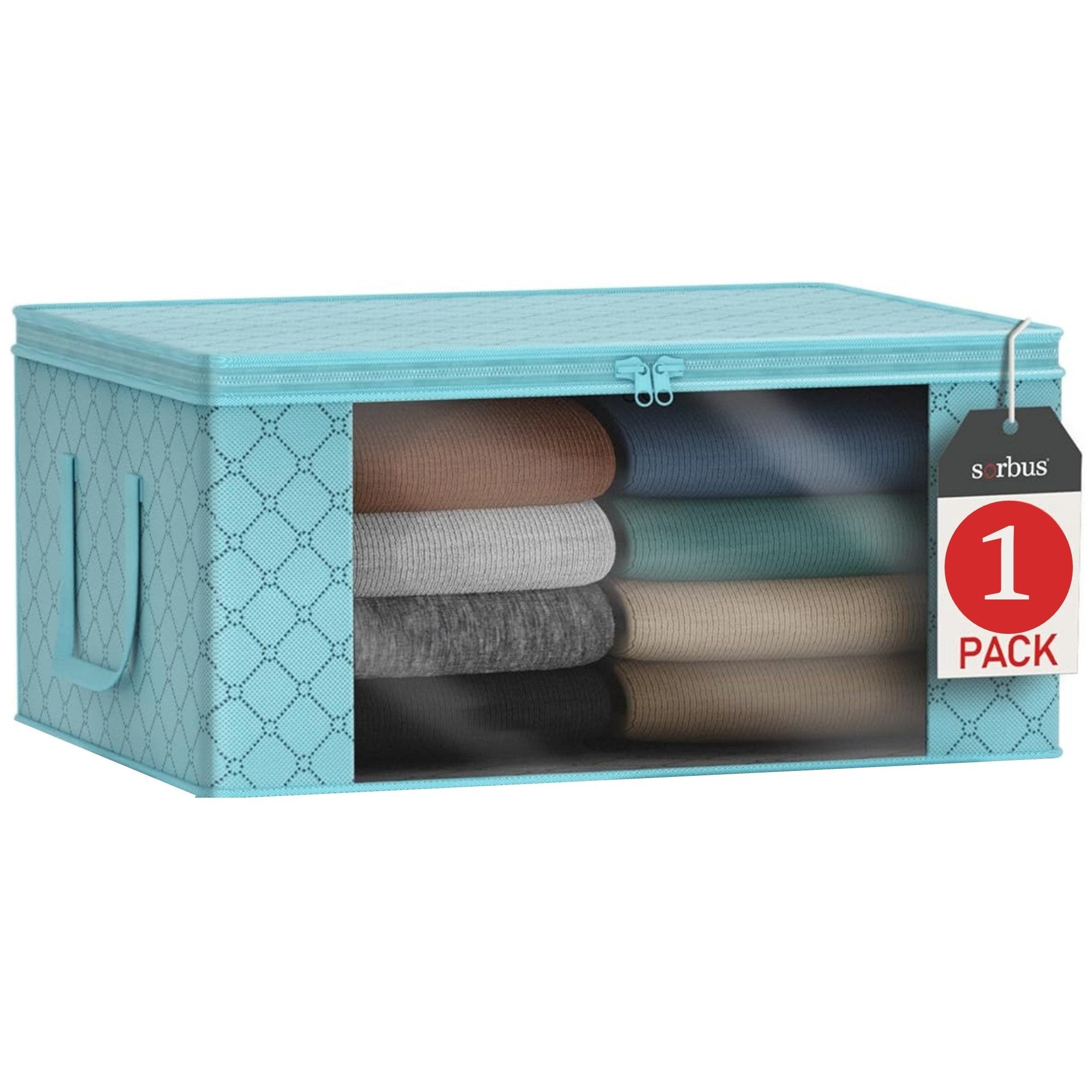 Pack, zip, and transport household essentials with a clear view! The Sorbus Storage Organizer Bag stores and protects your seasonal items and apparel. It features two carry handles and a large transparent front window to see contents at a glance. The generous size compartment provides plenty of room for clothing storage, blankets, linens, holiday decorations, toys, photos, baby clothes, or to use as saree bags. A fully zippered closure helps protect from dust, pests, and water damage while securing contents. For easy transport, the built-in carry handles make this bag portable and convenient. Once filled, it easily fits on shelves, stacks on top of each other, or slides under the bed to maximize space.